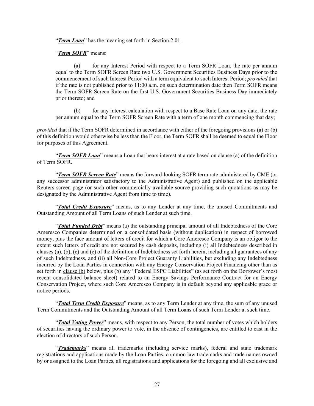27 “Term Loan” has the meaning set forth in Section 2.01. “Term SOFR” means: (a) for any Interest Period with respect to a Term SOFR Loan, the rate per annum equal to the Term SOFR Screen Rate two U.S. Government Securities Business Days prior to the commencement of such Interest Period with a term equivalent to such Interest Period; provided that if the rate is not published prior to 11:00 a.m. on such determination date then Term SOFR means the Term SOFR Screen Rate on the first U.S. Government Securities Business Day immediately prior thereto; and (b) for any interest calculation with respect to a Base Rate Loan on any date, the rate per annum equal to the Term SOFR Screen Rate with a term of one month commencing that day; provided that if the Term SOFR determined in accordance with either of the foregoing provisions (a) or (b) of this definition would otherwise be less than the Floor, the Term SOFR shall be deemed to equal the Floor for purposes of this Agreement. “Term SOFR Loan” means a Loan that bears interest at a rate based on clause (a) of the definition of Term SOFR. “Term SOFR Screen Rate” means the forward-looking SOFR term rate administered by CME (or any successor administrator satisfactory to the Administrative Agent) and published on the applicable Reuters screen page (or such other commercially available source providing such quotations as may be designated by the Administrative Agent from time to time). “Total Credit Exposure” means, as to any Lender at any time, the unused Commitments and Outstanding Amount of all Term Loans of such Lender at such time. “Total Funded Debt” means (a) the outstanding principal amount of all Indebtedness of the Core Ameresco Companies determined on a consolidated basis (without duplication) in respect of borrowed money, plus the face amount of letters of credit for which a Core Ameresco Company is an obligor to the extent such letters of credit are not secured by cash deposits, including (i) all Indebtedness described in clauses (a), (b), (c) and (e) of the definition of Indebtedness set forth herein, including all guarantees of any of such Indebtedness, and (ii) all Non-Core Project Guaranty Liabilities, but excluding any Indebtedness incurred by the Loan Parties in connection with any Energy Conservation Project Financing other than as set forth in clause (b) below, plus (b) any “Federal ESPC Liabilities” (as set forth on the Borrower’s most recent consolidated balance sheet) related to an Energy Savings Performance Contract for an Energy Conservation Project, where such Core Ameresco Company is in default beyond any applicable grace or notice periods. “Total Term Credit Exposure” means, as to any Term Lender at any time, the sum of any unused Term Commitments and the Outstanding Amount of all Term Loans of such Term Lender at such time. “Total Voting Power” means, with respect to any Person, the total number of votes which holders of securities having the ordinary power to vote, in the absence of contingencies, are entitled to cast in the election of directors of such Person. “Trademarks” means all trademarks (including service marks), federal and state trademark registrations and applications made by the Loan Parties, common law trademarks and trade names owned by or assigned to the Loan Parties, all registrations and applications for the foregoing and all exclusive and