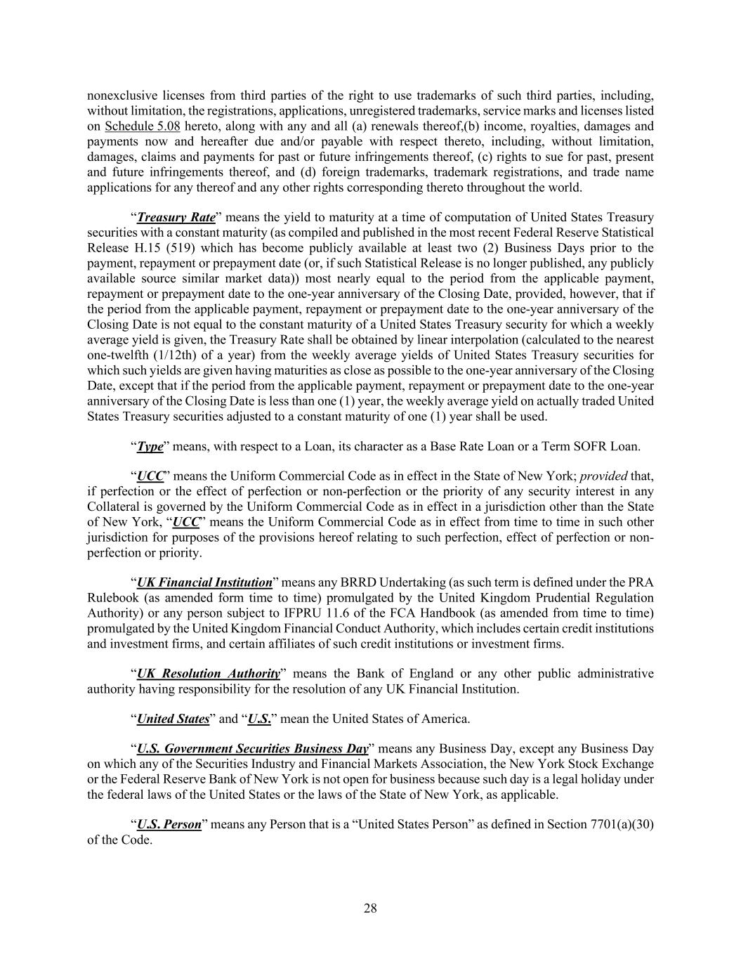28 nonexclusive licenses from third parties of the right to use trademarks of such third parties, including, without limitation, the registrations, applications, unregistered trademarks, service marks and licenses listed on Schedule 5.08 hereto, along with any and all (a) renewals thereof,(b) income, royalties, damages and payments now and hereafter due and/or payable with respect thereto, including, without limitation, damages, claims and payments for past or future infringements thereof, (c) rights to sue for past, present and future infringements thereof, and (d) foreign trademarks, trademark registrations, and trade name applications for any thereof and any other rights corresponding thereto throughout the world. “Treasury Rate” means the yield to maturity at a time of computation of United States Treasury securities with a constant maturity (as compiled and published in the most recent Federal Reserve Statistical Release H.15 (519) which has become publicly available at least two (2) Business Days prior to the payment, repayment or prepayment date (or, if such Statistical Release is no longer published, any publicly available source similar market data)) most nearly equal to the period from the applicable payment, repayment or prepayment date to the one-year anniversary of the Closing Date, provided, however, that if the period from the applicable payment, repayment or prepayment date to the one-year anniversary of the Closing Date is not equal to the constant maturity of a United States Treasury security for which a weekly average yield is given, the Treasury Rate shall be obtained by linear interpolation (calculated to the nearest one-twelfth (1/12th) of a year) from the weekly average yields of United States Treasury securities for which such yields are given having maturities as close as possible to the one-year anniversary of the Closing Date, except that if the period from the applicable payment, repayment or prepayment date to the one-year anniversary of the Closing Date is less than one (1) year, the weekly average yield on actually traded United States Treasury securities adjusted to a constant maturity of one (1) year shall be used. “Type” means, with respect to a Loan, its character as a Base Rate Loan or a Term SOFR Loan. “UCC” means the Uniform Commercial Code as in effect in the State of New York; provided that, if perfection or the effect of perfection or non-perfection or the priority of any security interest in any Collateral is governed by the Uniform Commercial Code as in effect in a jurisdiction other than the State of New York, “UCC” means the Uniform Commercial Code as in effect from time to time in such other jurisdiction for purposes of the provisions hereof relating to such perfection, effect of perfection or non- perfection or priority. “UK Financial Institution” means any BRRD Undertaking (as such term is defined under the PRA Rulebook (as amended form time to time) promulgated by the United Kingdom Prudential Regulation Authority) or any person subject to IFPRU 11.6 of the FCA Handbook (as amended from time to time) promulgated by the United Kingdom Financial Conduct Authority, which includes certain credit institutions and investment firms, and certain affiliates of such credit institutions or investment firms. “UK Resolution Authority” means the Bank of England or any other public administrative authority having responsibility for the resolution of any UK Financial Institution. “United States” and “U.S.” mean the United States of America. “U.S. Government Securities Business Day” means any Business Day, except any Business Day on which any of the Securities Industry and Financial Markets Association, the New York Stock Exchange or the Federal Reserve Bank of New York is not open for business because such day is a legal holiday under the federal laws of the United States or the laws of the State of New York, as applicable. “U.S. Person” means any Person that is a “United States Person” as defined in Section 7701(a)(30) of the Code.