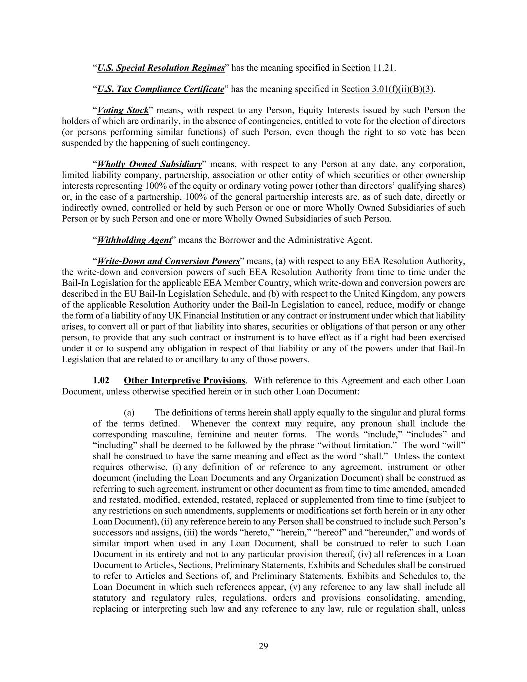 29 “U.S. Special Resolution Regimes” has the meaning specified in Section 11.21. “U.S. Tax Compliance Certificate” has the meaning specified in Section 3.01(f)(ii)(B)(3). “Voting Stock” means, with respect to any Person, Equity Interests issued by such Person the holders of which are ordinarily, in the absence of contingencies, entitled to vote for the election of directors (or persons performing similar functions) of such Person, even though the right to so vote has been suspended by the happening of such contingency. “Wholly Owned Subsidiary” means, with respect to any Person at any date, any corporation, limited liability company, partnership, association or other entity of which securities or other ownership interests representing 100% of the equity or ordinary voting power (other than directors’ qualifying shares) or, in the case of a partnership, 100% of the general partnership interests are, as of such date, directly or indirectly owned, controlled or held by such Person or one or more Wholly Owned Subsidiaries of such Person or by such Person and one or more Wholly Owned Subsidiaries of such Person. “Withholding Agent” means the Borrower and the Administrative Agent. “Write-Down and Conversion Powers” means, (a) with respect to any EEA Resolution Authority, the write-down and conversion powers of such EEA Resolution Authority from time to time under the Bail-In Legislation for the applicable EEA Member Country, which write-down and conversion powers are described in the EU Bail-In Legislation Schedule, and (b) with respect to the United Kingdom, any powers of the applicable Resolution Authority under the Bail-In Legislation to cancel, reduce, modify or change the form of a liability of any UK Financial Institution or any contract or instrument under which that liability arises, to convert all or part of that liability into shares, securities or obligations of that person or any other person, to provide that any such contract or instrument is to have effect as if a right had been exercised under it or to suspend any obligation in respect of that liability or any of the powers under that Bail-In Legislation that are related to or ancillary to any of those powers. 1.02 Other Interpretive Provisions. With reference to this Agreement and each other Loan Document, unless otherwise specified herein or in such other Loan Document: (a) The definitions of terms herein shall apply equally to the singular and plural forms of the terms defined. Whenever the context may require, any pronoun shall include the corresponding masculine, feminine and neuter forms. The words “include,” “includes” and “including” shall be deemed to be followed by the phrase “without limitation.” The word “will” shall be construed to have the same meaning and effect as the word “shall.” Unless the context requires otherwise, (i) any definition of or reference to any agreement, instrument or other document (including the Loan Documents and any Organization Document) shall be construed as referring to such agreement, instrument or other document as from time to time amended, amended and restated, modified, extended, restated, replaced or supplemented from time to time (subject to any restrictions on such amendments, supplements or modifications set forth herein or in any other Loan Document), (ii) any reference herein to any Person shall be construed to include such Person’s successors and assigns, (iii) the words “hereto,” “herein,” “hereof” and “hereunder,” and words of similar import when used in any Loan Document, shall be construed to refer to such Loan Document in its entirety and not to any particular provision thereof, (iv) all references in a Loan Document to Articles, Sections, Preliminary Statements, Exhibits and Schedules shall be construed to refer to Articles and Sections of, and Preliminary Statements, Exhibits and Schedules to, the Loan Document in which such references appear, (v) any reference to any law shall include all statutory and regulatory rules, regulations, orders and provisions consolidating, amending, replacing or interpreting such law and any reference to any law, rule or regulation shall, unless