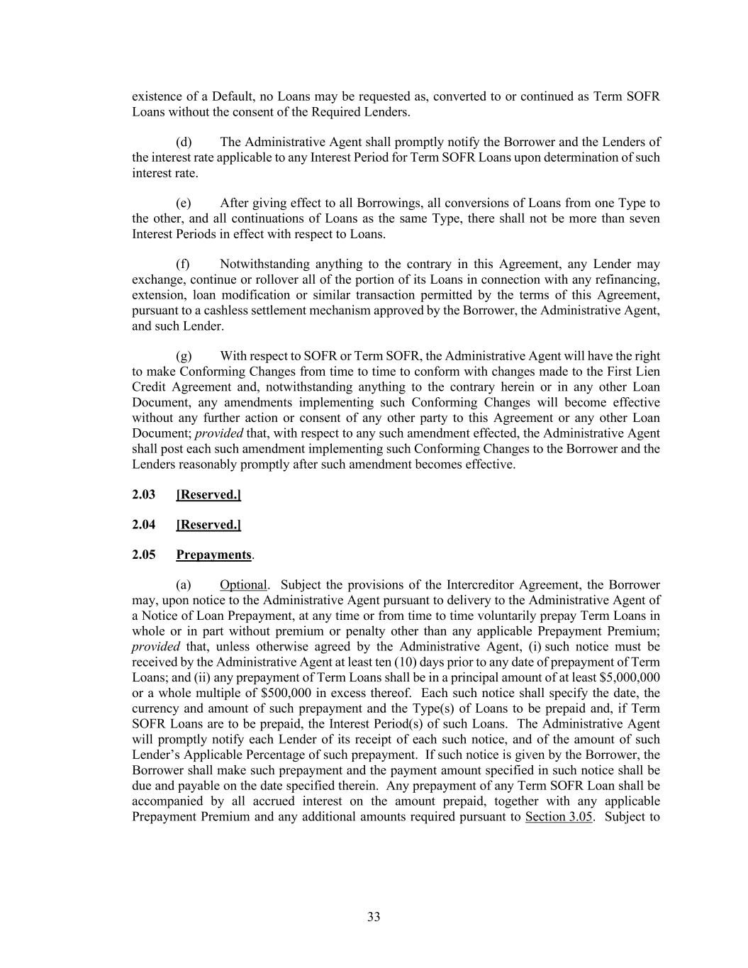 33 existence of a Default, no Loans may be requested as, converted to or continued as Term SOFR Loans without the consent of the Required Lenders. (d) The Administrative Agent shall promptly notify the Borrower and the Lenders of the interest rate applicable to any Interest Period for Term SOFR Loans upon determination of such interest rate. (e) After giving effect to all Borrowings, all conversions of Loans from one Type to the other, and all continuations of Loans as the same Type, there shall not be more than seven Interest Periods in effect with respect to Loans. (f) Notwithstanding anything to the contrary in this Agreement, any Lender may exchange, continue or rollover all of the portion of its Loans in connection with any refinancing, extension, loan modification or similar transaction permitted by the terms of this Agreement, pursuant to a cashless settlement mechanism approved by the Borrower, the Administrative Agent, and such Lender. (g) With respect to SOFR or Term SOFR, the Administrative Agent will have the right to make Conforming Changes from time to time to conform with changes made to the First Lien Credit Agreement and, notwithstanding anything to the contrary herein or in any other Loan Document, any amendments implementing such Conforming Changes will become effective without any further action or consent of any other party to this Agreement or any other Loan Document; provided that, with respect to any such amendment effected, the Administrative Agent shall post each such amendment implementing such Conforming Changes to the Borrower and the Lenders reasonably promptly after such amendment becomes effective. 2.03 [Reserved.] 2.04 [Reserved.] 2.05 Prepayments. (a) Optional. Subject the provisions of the Intercreditor Agreement, the Borrower may, upon notice to the Administrative Agent pursuant to delivery to the Administrative Agent of a Notice of Loan Prepayment, at any time or from time to time voluntarily prepay Term Loans in whole or in part without premium or penalty other than any applicable Prepayment Premium; provided that, unless otherwise agreed by the Administrative Agent, (i) such notice must be received by the Administrative Agent at least ten (10) days prior to any date of prepayment of Term Loans; and (ii) any prepayment of Term Loans shall be in a principal amount of at least $5,000,000 or a whole multiple of $500,000 in excess thereof. Each such notice shall specify the date, the currency and amount of such prepayment and the Type(s) of Loans to be prepaid and, if Term SOFR Loans are to be prepaid, the Interest Period(s) of such Loans. The Administrative Agent will promptly notify each Lender of its receipt of each such notice, and of the amount of such Lender’s Applicable Percentage of such prepayment. If such notice is given by the Borrower, the Borrower shall make such prepayment and the payment amount specified in such notice shall be due and payable on the date specified therein. Any prepayment of any Term SOFR Loan shall be accompanied by all accrued interest on the amount prepaid, together with any applicable Prepayment Premium and any additional amounts required pursuant to Section 3.05. Subject to