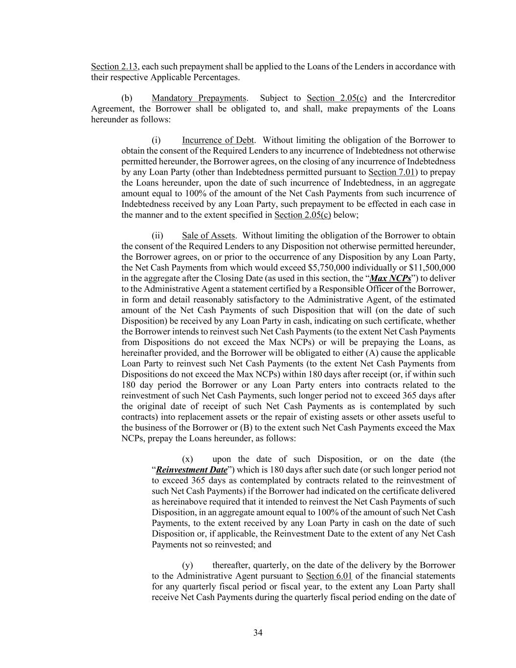 34 Section 2.13, each such prepayment shall be applied to the Loans of the Lenders in accordance with their respective Applicable Percentages. (b) Mandatory Prepayments. Subject to Section 2.05(c) and the Intercreditor Agreement, the Borrower shall be obligated to, and shall, make prepayments of the Loans hereunder as follows: (i) Incurrence of Debt. Without limiting the obligation of the Borrower to obtain the consent of the Required Lenders to any incurrence of Indebtedness not otherwise permitted hereunder, the Borrower agrees, on the closing of any incurrence of Indebtedness by any Loan Party (other than Indebtedness permitted pursuant to Section 7.01) to prepay the Loans hereunder, upon the date of such incurrence of Indebtedness, in an aggregate amount equal to 100% of the amount of the Net Cash Payments from such incurrence of Indebtedness received by any Loan Party, such prepayment to be effected in each case in the manner and to the extent specified in Section 2.05(c) below; (ii) Sale of Assets. Without limiting the obligation of the Borrower to obtain the consent of the Required Lenders to any Disposition not otherwise permitted hereunder, the Borrower agrees, on or prior to the occurrence of any Disposition by any Loan Party, the Net Cash Payments from which would exceed $5,750,000 individually or $11,500,000 in the aggregate after the Closing Date (as used in this section, the “Max NCPs”) to deliver to the Administrative Agent a statement certified by a Responsible Officer of the Borrower, in form and detail reasonably satisfactory to the Administrative Agent, of the estimated amount of the Net Cash Payments of such Disposition that will (on the date of such Disposition) be received by any Loan Party in cash, indicating on such certificate, whether the Borrower intends to reinvest such Net Cash Payments (to the extent Net Cash Payments from Dispositions do not exceed the Max NCPs) or will be prepaying the Loans, as hereinafter provided, and the Borrower will be obligated to either (A) cause the applicable Loan Party to reinvest such Net Cash Payments (to the extent Net Cash Payments from Dispositions do not exceed the Max NCPs) within 180 days after receipt (or, if within such 180 day period the Borrower or any Loan Party enters into contracts related to the reinvestment of such Net Cash Payments, such longer period not to exceed 365 days after the original date of receipt of such Net Cash Payments as is contemplated by such contracts) into replacement assets or the repair of existing assets or other assets useful to the business of the Borrower or (B) to the extent such Net Cash Payments exceed the Max NCPs, prepay the Loans hereunder, as follows: (x) upon the date of such Disposition, or on the date (the “Reinvestment Date”) which is 180 days after such date (or such longer period not to exceed 365 days as contemplated by contracts related to the reinvestment of such Net Cash Payments) if the Borrower had indicated on the certificate delivered as hereinabove required that it intended to reinvest the Net Cash Payments of such Disposition, in an aggregate amount equal to 100% of the amount of such Net Cash Payments, to the extent received by any Loan Party in cash on the date of such Disposition or, if applicable, the Reinvestment Date to the extent of any Net Cash Payments not so reinvested; and (y) thereafter, quarterly, on the date of the delivery by the Borrower to the Administrative Agent pursuant to Section 6.01 of the financial statements for any quarterly fiscal period or fiscal year, to the extent any Loan Party shall receive Net Cash Payments during the quarterly fiscal period ending on the date of