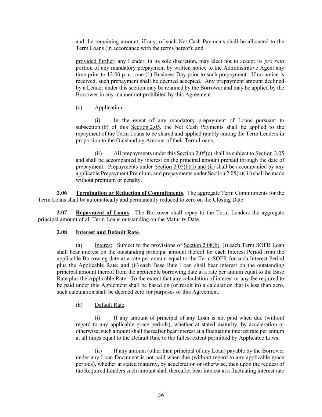 36 and the remaining amount, if any, of such Net Cash Payments shall be allocated to the Term Loans (in accordance with the terms hereof); and provided further, any Lender, in its sole discretion, may elect not to accept its pro rata portion of any mandatory prepayment by written notice to the Administrative Agent any time prior to 12:00 p.m., one (1) Business Day prior to such prepayment. If no notice is received, such prepayment shall be deemed accepted. Any prepayment amount declined by a Lender under this section may be retained by the Borrower and may be applied by the Borrower in any manner not prohibited by this Agreement. (c) Application. (i) In the event of any mandatory prepayment of Loans pursuant to subsection (b) of this Section 2.05, the Net Cash Payments shall be applied to the repayment of the Term Loans to be shared and applied ratably among the Term Lenders in proportion to the Outstanding Amount of their Term Loans. (ii) All prepayments under this Section 2.05(c) shall be subject to Section 3.05 and shall be accompanied by interest on the principal amount prepaid through the date of prepayment. Prepayments under Section 2.05(b)(i) and (ii) shall be accompanied by any applicable Prepayment Premium, and prepayments under Section 2.05(b)(iii) shall be made without premium or penalty. 2.06 Termination or Reduction of Commitments. The aggregate Term Commitments for the Term Loans shall be automatically and permanently reduced to zero on the Closing Date. 2.07 Repayment of Loans. The Borrower shall repay to the Term Lenders the aggregate principal amount of all Term Loans outstanding on the Maturity Date. 2.08 Interest and Default Rate. (a) Interest. Subject to the provisions of Section 2.08(b), (i) each Term SOFR Loan shall bear interest on the outstanding principal amount thereof for each Interest Period from the applicable Borrowing date at a rate per annum equal to the Term SOFR for such Interest Period plus the Applicable Rate; and (ii) each Base Rate Loan shall bear interest on the outstanding principal amount thereof from the applicable borrowing date at a rate per annum equal to the Base Rate plus the Applicable Rate. To the extent that any calculation of interest or any fee required to be paid under this Agreement shall be based on (or result in) a calculation that is less than zero, such calculation shall be deemed zero for purposes of this Agreement. (b) Default Rate. (i) If any amount of principal of any Loan is not paid when due (without regard to any applicable grace periods), whether at stated maturity, by acceleration or otherwise, such amount shall thereafter bear interest at a fluctuating interest rate per annum at all times equal to the Default Rate to the fullest extent permitted by Applicable Laws. (ii) If any amount (other than principal of any Loan) payable by the Borrower under any Loan Document is not paid when due (without regard to any applicable grace periods), whether at stated maturity, by acceleration or otherwise, then upon the request of the Required Lenders such amount shall thereafter bear interest at a fluctuating interest rate