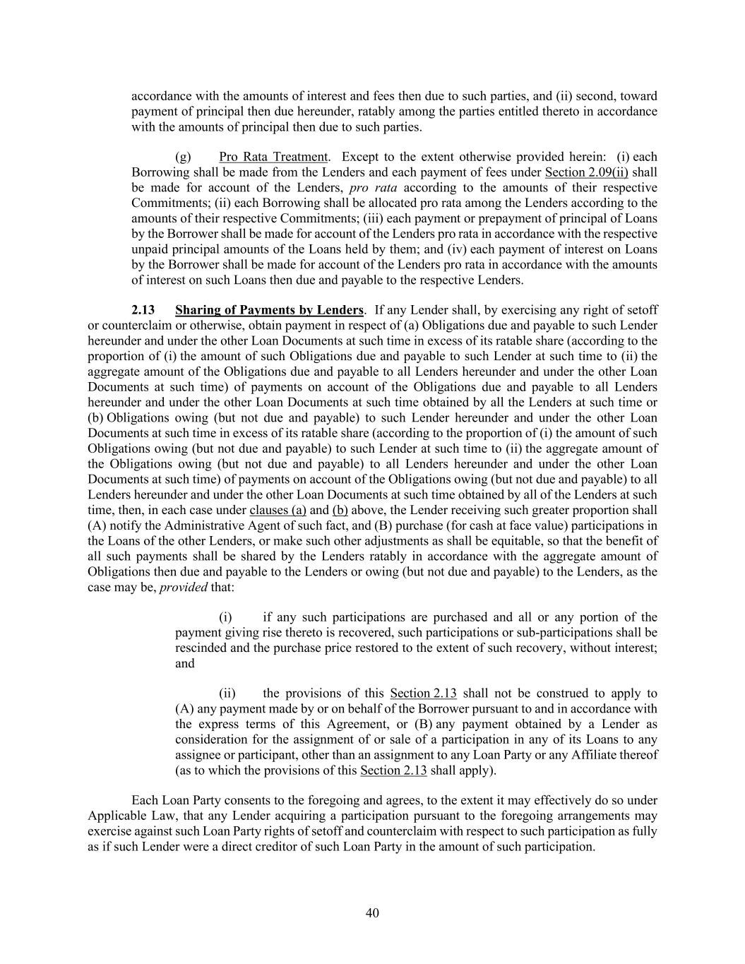 40 accordance with the amounts of interest and fees then due to such parties, and (ii) second, toward payment of principal then due hereunder, ratably among the parties entitled thereto in accordance with the amounts of principal then due to such parties. (g) Pro Rata Treatment. Except to the extent otherwise provided herein: (i) each Borrowing shall be made from the Lenders and each payment of fees under Section 2.09(ii) shall be made for account of the Lenders, pro rata according to the amounts of their respective Commitments; (ii) each Borrowing shall be allocated pro rata among the Lenders according to the amounts of their respective Commitments; (iii) each payment or prepayment of principal of Loans by the Borrower shall be made for account of the Lenders pro rata in accordance with the respective unpaid principal amounts of the Loans held by them; and (iv) each payment of interest on Loans by the Borrower shall be made for account of the Lenders pro rata in accordance with the amounts of interest on such Loans then due and payable to the respective Lenders. 2.13 Sharing of Payments by Lenders. If any Lender shall, by exercising any right of setoff or counterclaim or otherwise, obtain payment in respect of (a) Obligations due and payable to such Lender hereunder and under the other Loan Documents at such time in excess of its ratable share (according to the proportion of (i) the amount of such Obligations due and payable to such Lender at such time to (ii) the aggregate amount of the Obligations due and payable to all Lenders hereunder and under the other Loan Documents at such time) of payments on account of the Obligations due and payable to all Lenders hereunder and under the other Loan Documents at such time obtained by all the Lenders at such time or (b) Obligations owing (but not due and payable) to such Lender hereunder and under the other Loan Documents at such time in excess of its ratable share (according to the proportion of (i) the amount of such Obligations owing (but not due and payable) to such Lender at such time to (ii) the aggregate amount of the Obligations owing (but not due and payable) to all Lenders hereunder and under the other Loan Documents at such time) of payments on account of the Obligations owing (but not due and payable) to all Lenders hereunder and under the other Loan Documents at such time obtained by all of the Lenders at such time, then, in each case under clauses (a) and (b) above, the Lender receiving such greater proportion shall (A) notify the Administrative Agent of such fact, and (B) purchase (for cash at face value) participations in the Loans of the other Lenders, or make such other adjustments as shall be equitable, so that the benefit of all such payments shall be shared by the Lenders ratably in accordance with the aggregate amount of Obligations then due and payable to the Lenders or owing (but not due and payable) to the Lenders, as the case may be, provided that: (i) if any such participations are purchased and all or any portion of the payment giving rise thereto is recovered, such participations or sub-participations shall be rescinded and the purchase price restored to the extent of such recovery, without interest; and (ii) the provisions of this Section 2.13 shall not be construed to apply to (A) any payment made by or on behalf of the Borrower pursuant to and in accordance with the express terms of this Agreement, or (B) any payment obtained by a Lender as consideration for the assignment of or sale of a participation in any of its Loans to any assignee or participant, other than an assignment to any Loan Party or any Affiliate thereof (as to which the provisions of this Section 2.13 shall apply). Each Loan Party consents to the foregoing and agrees, to the extent it may effectively do so under Applicable Law, that any Lender acquiring a participation pursuant to the foregoing arrangements may exercise against such Loan Party rights of setoff and counterclaim with respect to such participation as fully as if such Lender were a direct creditor of such Loan Party in the amount of such participation.