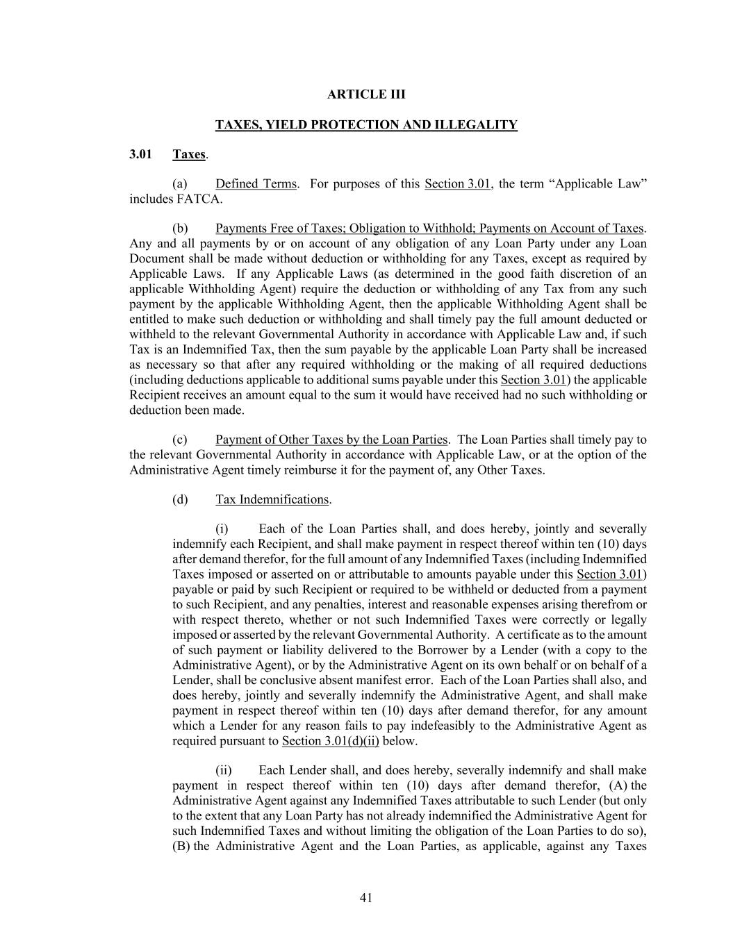 41 ARTICLE III TAXES, YIELD PROTECTION AND ILLEGALITY 3.01 Taxes. (a) Defined Terms. For purposes of this Section 3.01, the term “Applicable Law” includes FATCA. (b) Payments Free of Taxes; Obligation to Withhold; Payments on Account of Taxes. Any and all payments by or on account of any obligation of any Loan Party under any Loan Document shall be made without deduction or withholding for any Taxes, except as required by Applicable Laws. If any Applicable Laws (as determined in the good faith discretion of an applicable Withholding Agent) require the deduction or withholding of any Tax from any such payment by the applicable Withholding Agent, then the applicable Withholding Agent shall be entitled to make such deduction or withholding and shall timely pay the full amount deducted or withheld to the relevant Governmental Authority in accordance with Applicable Law and, if such Tax is an Indemnified Tax, then the sum payable by the applicable Loan Party shall be increased as necessary so that after any required withholding or the making of all required deductions (including deductions applicable to additional sums payable under this Section 3.01) the applicable Recipient receives an amount equal to the sum it would have received had no such withholding or deduction been made. (c) Payment of Other Taxes by the Loan Parties. The Loan Parties shall timely pay to the relevant Governmental Authority in accordance with Applicable Law, or at the option of the Administrative Agent timely reimburse it for the payment of, any Other Taxes. (d) Tax Indemnifications. (i) Each of the Loan Parties shall, and does hereby, jointly and severally indemnify each Recipient, and shall make payment in respect thereof within ten (10) days after demand therefor, for the full amount of any Indemnified Taxes (including Indemnified Taxes imposed or asserted on or attributable to amounts payable under this Section 3.01) payable or paid by such Recipient or required to be withheld or deducted from a payment to such Recipient, and any penalties, interest and reasonable expenses arising therefrom or with respect thereto, whether or not such Indemnified Taxes were correctly or legally imposed or asserted by the relevant Governmental Authority. A certificate as to the amount of such payment or liability delivered to the Borrower by a Lender (with a copy to the Administrative Agent), or by the Administrative Agent on its own behalf or on behalf of a Lender, shall be conclusive absent manifest error. Each of the Loan Parties shall also, and does hereby, jointly and severally indemnify the Administrative Agent, and shall make payment in respect thereof within ten (10) days after demand therefor, for any amount which a Lender for any reason fails to pay indefeasibly to the Administrative Agent as required pursuant to Section 3.01(d)(ii) below. (ii) Each Lender shall, and does hereby, severally indemnify and shall make payment in respect thereof within ten (10) days after demand therefor, (A) the Administrative Agent against any Indemnified Taxes attributable to such Lender (but only to the extent that any Loan Party has not already indemnified the Administrative Agent for such Indemnified Taxes and without limiting the obligation of the Loan Parties to do so), (B) the Administrative Agent and the Loan Parties, as applicable, against any Taxes