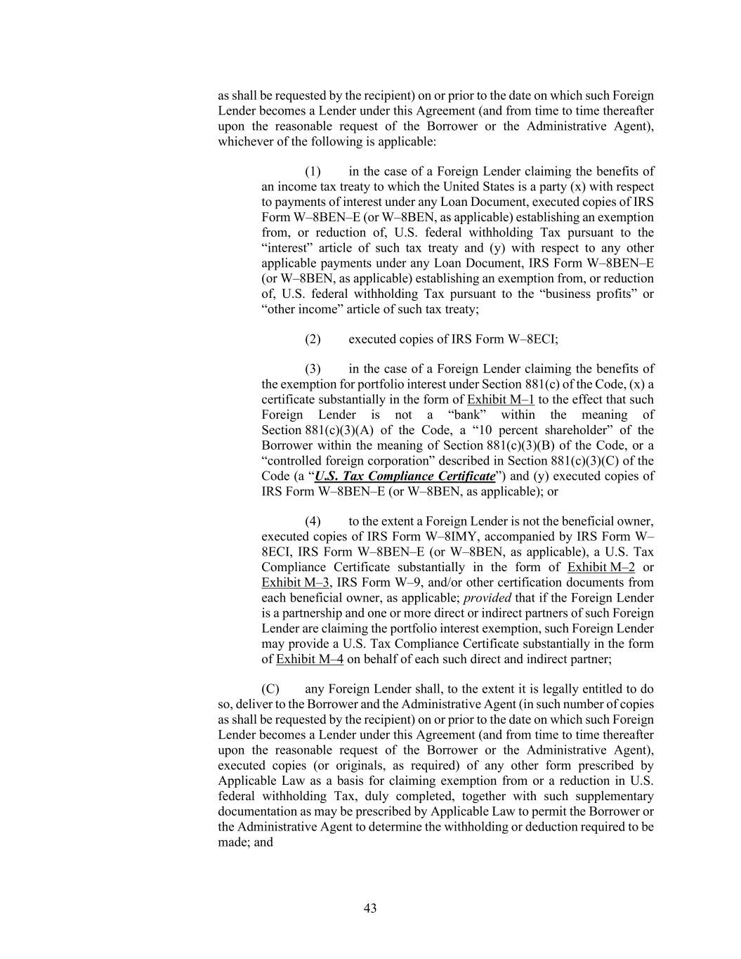 43 as shall be requested by the recipient) on or prior to the date on which such Foreign Lender becomes a Lender under this Agreement (and from time to time thereafter upon the reasonable request of the Borrower or the Administrative Agent), whichever of the following is applicable: (1) in the case of a Foreign Lender claiming the benefits of an income tax treaty to which the United States is a party (x) with respect to payments of interest under any Loan Document, executed copies of IRS Form W–8BEN–E (or W–8BEN, as applicable) establishing an exemption from, or reduction of, U.S. federal withholding Tax pursuant to the “interest” article of such tax treaty and (y) with respect to any other applicable payments under any Loan Document, IRS Form W–8BEN–E (or W–8BEN, as applicable) establishing an exemption from, or reduction of, U.S. federal withholding Tax pursuant to the “business profits” or “other income” article of such tax treaty; (2) executed copies of IRS Form W–8ECI; (3) in the case of a Foreign Lender claiming the benefits of the exemption for portfolio interest under Section 881(c) of the Code, (x) a certificate substantially in the form of Exhibit M–1 to the effect that such Foreign Lender is not a “bank” within the meaning of Section 881(c)(3)(A) of the Code, a “10 percent shareholder” of the Borrower within the meaning of Section 881(c)(3)(B) of the Code, or a “controlled foreign corporation” described in Section 881(c)(3)(C) of the Code (a “U.S. Tax Compliance Certificate”) and (y) executed copies of IRS Form W–8BEN–E (or W–8BEN, as applicable); or (4) to the extent a Foreign Lender is not the beneficial owner, executed copies of IRS Form W–8IMY, accompanied by IRS Form W– 8ECI, IRS Form W–8BEN–E (or W–8BEN, as applicable), a U.S. Tax Compliance Certificate substantially in the form of Exhibit M–2 or Exhibit M–3, IRS Form W–9, and/or other certification documents from each beneficial owner, as applicable; provided that if the Foreign Lender is a partnership and one or more direct or indirect partners of such Foreign Lender are claiming the portfolio interest exemption, such Foreign Lender may provide a U.S. Tax Compliance Certificate substantially in the form of Exhibit M–4 on behalf of each such direct and indirect partner; (C) any Foreign Lender shall, to the extent it is legally entitled to do so, deliver to the Borrower and the Administrative Agent (in such number of copies as shall be requested by the recipient) on or prior to the date on which such Foreign Lender becomes a Lender under this Agreement (and from time to time thereafter upon the reasonable request of the Borrower or the Administrative Agent), executed copies (or originals, as required) of any other form prescribed by Applicable Law as a basis for claiming exemption from or a reduction in U.S. federal withholding Tax, duly completed, together with such supplementary documentation as may be prescribed by Applicable Law to permit the Borrower or the Administrative Agent to determine the withholding or deduction required to be made; and