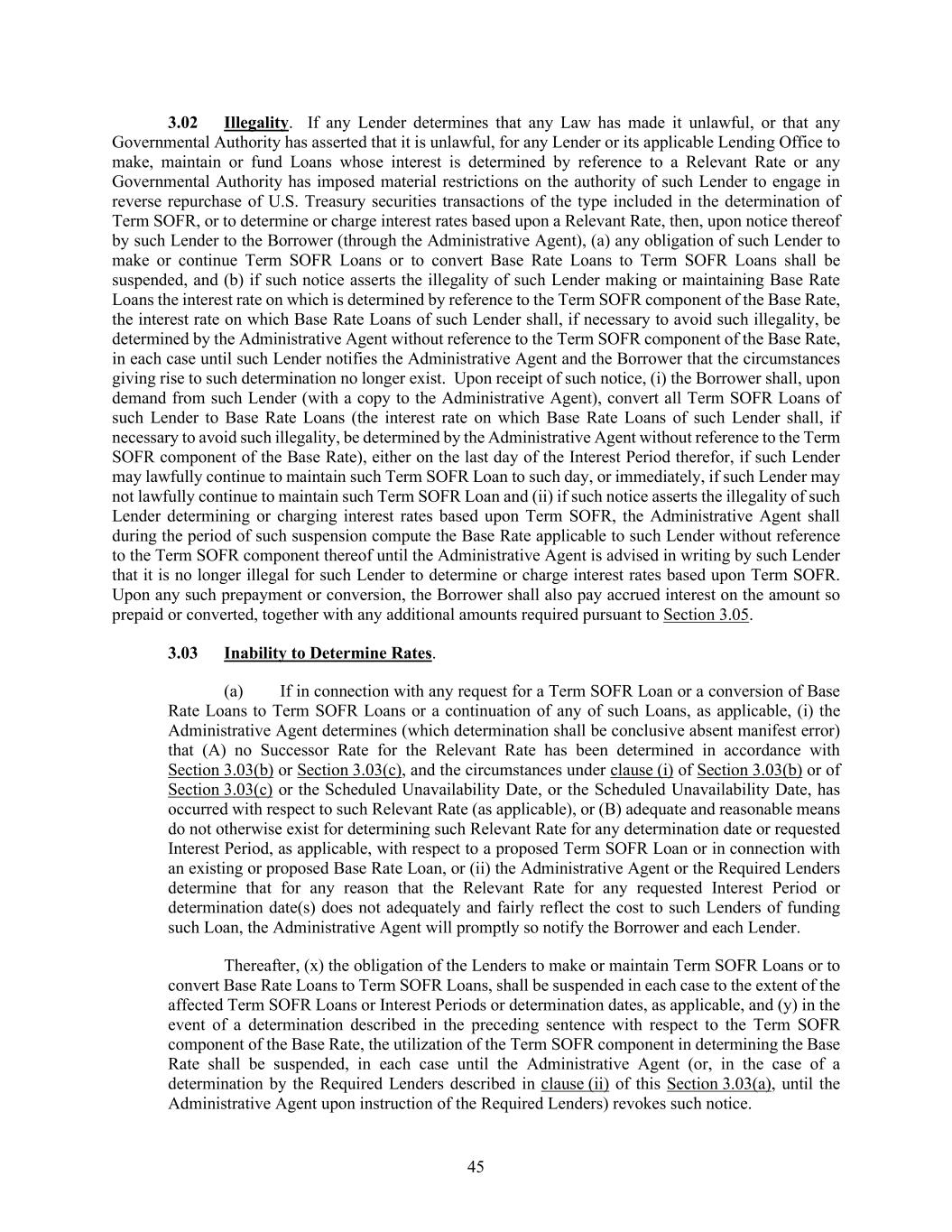 45 3.02 Illegality. If any Lender determines that any Law has made it unlawful, or that any Governmental Authority has asserted that it is unlawful, for any Lender or its applicable Lending Office to make, maintain or fund Loans whose interest is determined by reference to a Relevant Rate or any Governmental Authority has imposed material restrictions on the authority of such Lender to engage in reverse repurchase of U.S. Treasury securities transactions of the type included in the determination of Term SOFR, or to determine or charge interest rates based upon a Relevant Rate, then, upon notice thereof by such Lender to the Borrower (through the Administrative Agent), (a) any obligation of such Lender to make or continue Term SOFR Loans or to convert Base Rate Loans to Term SOFR Loans shall be suspended, and (b) if such notice asserts the illegality of such Lender making or maintaining Base Rate Loans the interest rate on which is determined by reference to the Term SOFR component of the Base Rate, the interest rate on which Base Rate Loans of such Lender shall, if necessary to avoid such illegality, be determined by the Administrative Agent without reference to the Term SOFR component of the Base Rate, in each case until such Lender notifies the Administrative Agent and the Borrower that the circumstances giving rise to such determination no longer exist. Upon receipt of such notice, (i) the Borrower shall, upon demand from such Lender (with a copy to the Administrative Agent), convert all Term SOFR Loans of such Lender to Base Rate Loans (the interest rate on which Base Rate Loans of such Lender shall, if necessary to avoid such illegality, be determined by the Administrative Agent without reference to the Term SOFR component of the Base Rate), either on the last day of the Interest Period therefor, if such Lender may lawfully continue to maintain such Term SOFR Loan to such day, or immediately, if such Lender may not lawfully continue to maintain such Term SOFR Loan and (ii) if such notice asserts the illegality of such Lender determining or charging interest rates based upon Term SOFR, the Administrative Agent shall during the period of such suspension compute the Base Rate applicable to such Lender without reference to the Term SOFR component thereof until the Administrative Agent is advised in writing by such Lender that it is no longer illegal for such Lender to determine or charge interest rates based upon Term SOFR. Upon any such prepayment or conversion, the Borrower shall also pay accrued interest on the amount so prepaid or converted, together with any additional amounts required pursuant to Section 3.05. 3.03 Inability to Determine Rates. (a) If in connection with any request for a Term SOFR Loan or a conversion of Base Rate Loans to Term SOFR Loans or a continuation of any of such Loans, as applicable, (i) the Administrative Agent determines (which determination shall be conclusive absent manifest error) that (A) no Successor Rate for the Relevant Rate has been determined in accordance with Section 3.03(b) or Section 3.03(c), and the circumstances under clause (i) of Section 3.03(b) or of Section 3.03(c) or the Scheduled Unavailability Date, or the Scheduled Unavailability Date, has occurred with respect to such Relevant Rate (as applicable), or (B) adequate and reasonable means do not otherwise exist for determining such Relevant Rate for any determination date or requested Interest Period, as applicable, with respect to a proposed Term SOFR Loan or in connection with an existing or proposed Base Rate Loan, or (ii) the Administrative Agent or the Required Lenders determine that for any reason that the Relevant Rate for any requested Interest Period or determination date(s) does not adequately and fairly reflect the cost to such Lenders of funding such Loan, the Administrative Agent will promptly so notify the Borrower and each Lender. Thereafter, (x) the obligation of the Lenders to make or maintain Term SOFR Loans or to convert Base Rate Loans to Term SOFR Loans, shall be suspended in each case to the extent of the affected Term SOFR Loans or Interest Periods or determination dates, as applicable, and (y) in the event of a determination described in the preceding sentence with respect to the Term SOFR component of the Base Rate, the utilization of the Term SOFR component in determining the Base Rate shall be suspended, in each case until the Administrative Agent (or, in the case of a determination by the Required Lenders described in clause (ii) of this Section 3.03(a), until the Administrative Agent upon instruction of the Required Lenders) revokes such notice.