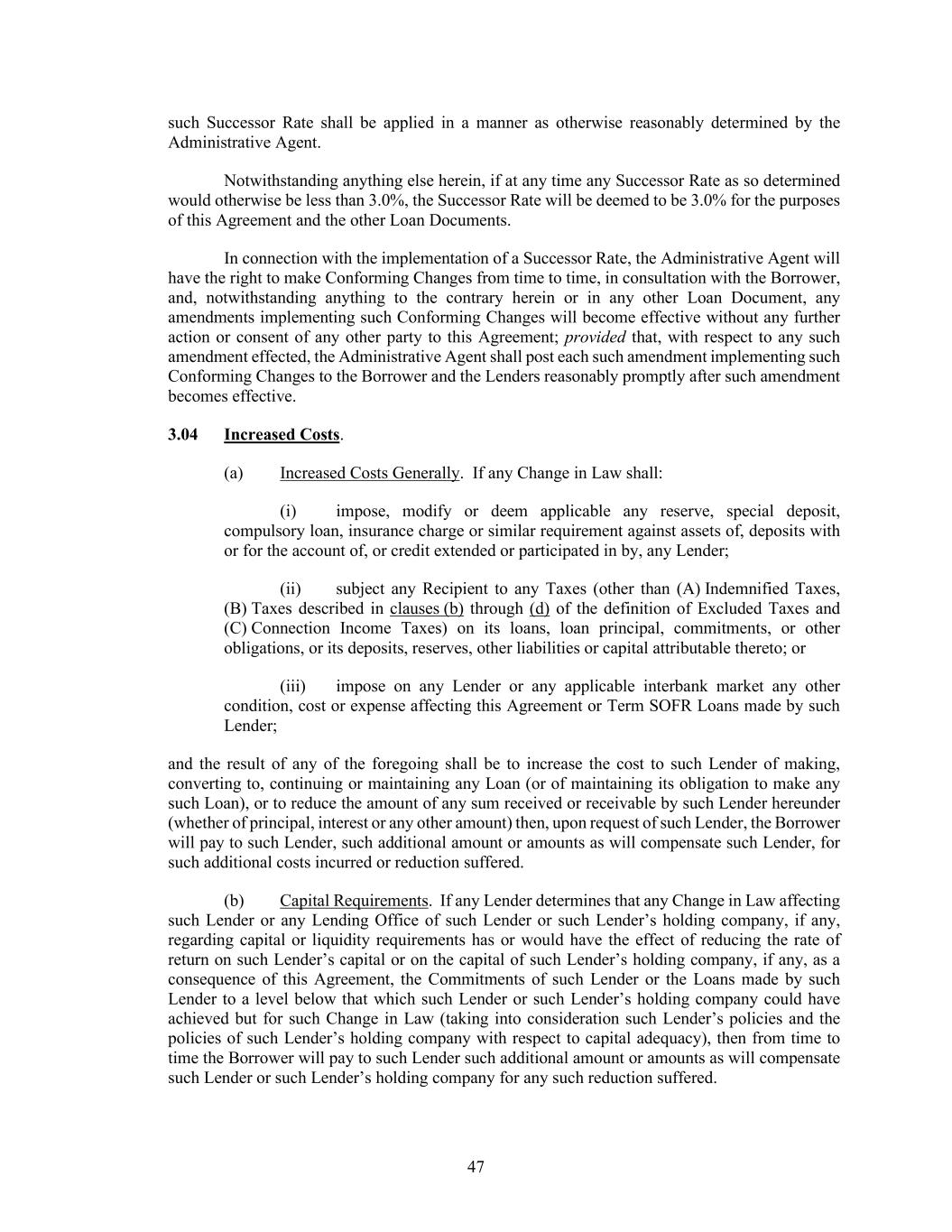 47 such Successor Rate shall be applied in a manner as otherwise reasonably determined by the Administrative Agent. Notwithstanding anything else herein, if at any time any Successor Rate as so determined would otherwise be less than 3.0%, the Successor Rate will be deemed to be 3.0% for the purposes of this Agreement and the other Loan Documents. In connection with the implementation of a Successor Rate, the Administrative Agent will have the right to make Conforming Changes from time to time, in consultation with the Borrower, and, notwithstanding anything to the contrary herein or in any other Loan Document, any amendments implementing such Conforming Changes will become effective without any further action or consent of any other party to this Agreement; provided that, with respect to any such amendment effected, the Administrative Agent shall post each such amendment implementing such Conforming Changes to the Borrower and the Lenders reasonably promptly after such amendment becomes effective. 3.04 Increased Costs. (a) Increased Costs Generally. If any Change in Law shall: (i) impose, modify or deem applicable any reserve, special deposit, compulsory loan, insurance charge or similar requirement against assets of, deposits with or for the account of, or credit extended or participated in by, any Lender; (ii) subject any Recipient to any Taxes (other than (A) Indemnified Taxes, (B) Taxes described in clauses (b) through (d) of the definition of Excluded Taxes and (C) Connection Income Taxes) on its loans, loan principal, commitments, or other obligations, or its deposits, reserves, other liabilities or capital attributable thereto; or (iii) impose on any Lender or any applicable interbank market any other condition, cost or expense affecting this Agreement or Term SOFR Loans made by such Lender; and the result of any of the foregoing shall be to increase the cost to such Lender of making, converting to, continuing or maintaining any Loan (or of maintaining its obligation to make any such Loan), or to reduce the amount of any sum received or receivable by such Lender hereunder (whether of principal, interest or any other amount) then, upon request of such Lender, the Borrower will pay to such Lender, such additional amount or amounts as will compensate such Lender, for such additional costs incurred or reduction suffered. (b) Capital Requirements. If any Lender determines that any Change in Law affecting such Lender or any Lending Office of such Lender or such Lender’s holding company, if any, regarding capital or liquidity requirements has or would have the effect of reducing the rate of return on such Lender’s capital or on the capital of such Lender’s holding company, if any, as a consequence of this Agreement, the Commitments of such Lender or the Loans made by such Lender to a level below that which such Lender or such Lender’s holding company could have achieved but for such Change in Law (taking into consideration such Lender’s policies and the policies of such Lender’s holding company with respect to capital adequacy), then from time to time the Borrower will pay to such Lender such additional amount or amounts as will compensate such Lender or such Lender’s holding company for any such reduction suffered.