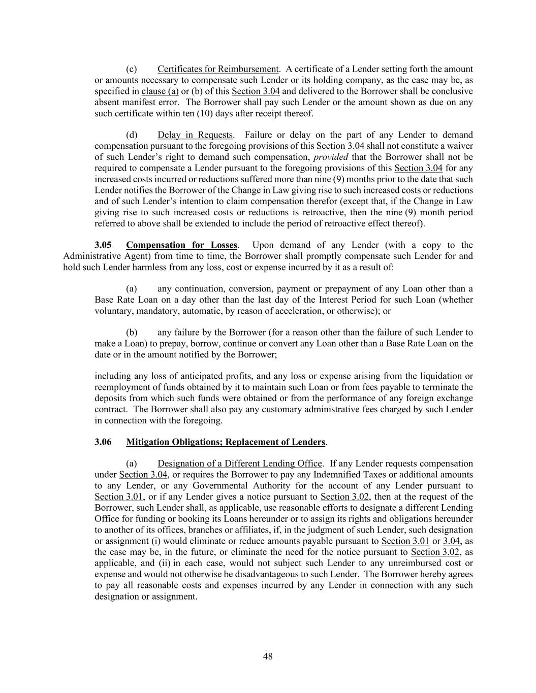 48 (c) Certificates for Reimbursement. A certificate of a Lender setting forth the amount or amounts necessary to compensate such Lender or its holding company, as the case may be, as specified in clause (a) or (b) of this Section 3.04 and delivered to the Borrower shall be conclusive absent manifest error. The Borrower shall pay such Lender or the amount shown as due on any such certificate within ten (10) days after receipt thereof. (d) Delay in Requests. Failure or delay on the part of any Lender to demand compensation pursuant to the foregoing provisions of this Section 3.04 shall not constitute a waiver of such Lender’s right to demand such compensation, provided that the Borrower shall not be required to compensate a Lender pursuant to the foregoing provisions of this Section 3.04 for any increased costs incurred or reductions suffered more than nine (9) months prior to the date that such Lender notifies the Borrower of the Change in Law giving rise to such increased costs or reductions and of such Lender’s intention to claim compensation therefor (except that, if the Change in Law giving rise to such increased costs or reductions is retroactive, then the nine (9) month period referred to above shall be extended to include the period of retroactive effect thereof). 3.05 Compensation for Losses. Upon demand of any Lender (with a copy to the Administrative Agent) from time to time, the Borrower shall promptly compensate such Lender for and hold such Lender harmless from any loss, cost or expense incurred by it as a result of: (a) any continuation, conversion, payment or prepayment of any Loan other than a Base Rate Loan on a day other than the last day of the Interest Period for such Loan (whether voluntary, mandatory, automatic, by reason of acceleration, or otherwise); or (b) any failure by the Borrower (for a reason other than the failure of such Lender to make a Loan) to prepay, borrow, continue or convert any Loan other than a Base Rate Loan on the date or in the amount notified by the Borrower; including any loss of anticipated profits, and any loss or expense arising from the liquidation or reemployment of funds obtained by it to maintain such Loan or from fees payable to terminate the deposits from which such funds were obtained or from the performance of any foreign exchange contract. The Borrower shall also pay any customary administrative fees charged by such Lender in connection with the foregoing. 3.06 Mitigation Obligations; Replacement of Lenders. (a) Designation of a Different Lending Office. If any Lender requests compensation under Section 3.04, or requires the Borrower to pay any Indemnified Taxes or additional amounts to any Lender, or any Governmental Authority for the account of any Lender pursuant to Section 3.01, or if any Lender gives a notice pursuant to Section 3.02, then at the request of the Borrower, such Lender shall, as applicable, use reasonable efforts to designate a different Lending Office for funding or booking its Loans hereunder or to assign its rights and obligations hereunder to another of its offices, branches or affiliates, if, in the judgment of such Lender, such designation or assignment (i) would eliminate or reduce amounts payable pursuant to Section 3.01 or 3.04, as the case may be, in the future, or eliminate the need for the notice pursuant to Section 3.02, as applicable, and (ii) in each case, would not subject such Lender to any unreimbursed cost or expense and would not otherwise be disadvantageous to such Lender. The Borrower hereby agrees to pay all reasonable costs and expenses incurred by any Lender in connection with any such designation or assignment.