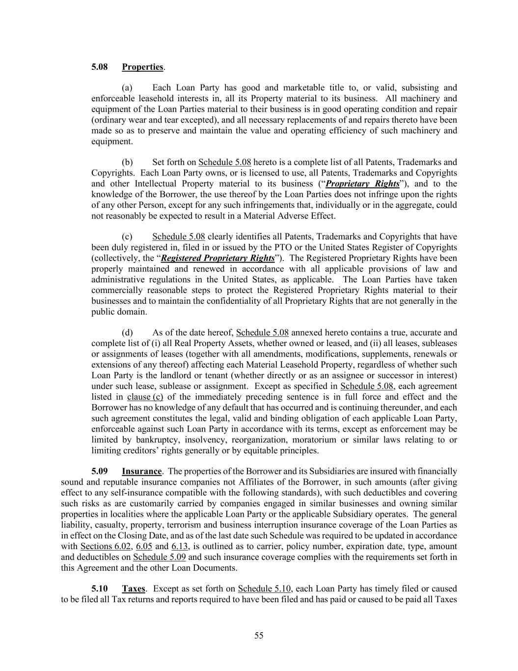 55 5.08 Properties. (a) Each Loan Party has good and marketable title to, or valid, subsisting and enforceable leasehold interests in, all its Property material to its business. All machinery and equipment of the Loan Parties material to their business is in good operating condition and repair (ordinary wear and tear excepted), and all necessary replacements of and repairs thereto have been made so as to preserve and maintain the value and operating efficiency of such machinery and equipment. (b) Set forth on Schedule 5.08 hereto is a complete list of all Patents, Trademarks and Copyrights. Each Loan Party owns, or is licensed to use, all Patents, Trademarks and Copyrights and other Intellectual Property material to its business (“Proprietary Rights”), and to the knowledge of the Borrower, the use thereof by the Loan Parties does not infringe upon the rights of any other Person, except for any such infringements that, individually or in the aggregate, could not reasonably be expected to result in a Material Adverse Effect. (c) Schedule 5.08 clearly identifies all Patents, Trademarks and Copyrights that have been duly registered in, filed in or issued by the PTO or the United States Register of Copyrights (collectively, the “Registered Proprietary Rights”). The Registered Proprietary Rights have been properly maintained and renewed in accordance with all applicable provisions of law and administrative regulations in the United States, as applicable. The Loan Parties have taken commercially reasonable steps to protect the Registered Proprietary Rights material to their businesses and to maintain the confidentiality of all Proprietary Rights that are not generally in the public domain. (d) As of the date hereof, Schedule 5.08 annexed hereto contains a true, accurate and complete list of (i) all Real Property Assets, whether owned or leased, and (ii) all leases, subleases or assignments of leases (together with all amendments, modifications, supplements, renewals or extensions of any thereof) affecting each Material Leasehold Property, regardless of whether such Loan Party is the landlord or tenant (whether directly or as an assignee or successor in interest) under such lease, sublease or assignment. Except as specified in Schedule 5.08, each agreement listed in clause (c) of the immediately preceding sentence is in full force and effect and the Borrower has no knowledge of any default that has occurred and is continuing thereunder, and each such agreement constitutes the legal, valid and binding obligation of each applicable Loan Party, enforceable against such Loan Party in accordance with its terms, except as enforcement may be limited by bankruptcy, insolvency, reorganization, moratorium or similar laws relating to or limiting creditors’ rights generally or by equitable principles. 5.09 Insurance. The properties of the Borrower and its Subsidiaries are insured with financially sound and reputable insurance companies not Affiliates of the Borrower, in such amounts (after giving effect to any self-insurance compatible with the following standards), with such deductibles and covering such risks as are customarily carried by companies engaged in similar businesses and owning similar properties in localities where the applicable Loan Party or the applicable Subsidiary operates. The general liability, casualty, property, terrorism and business interruption insurance coverage of the Loan Parties as in effect on the Closing Date, and as of the last date such Schedule was required to be updated in accordance with Sections 6.02, 6.05 and 6.13, is outlined as to carrier, policy number, expiration date, type, amount and deductibles on Schedule 5.09 and such insurance coverage complies with the requirements set forth in this Agreement and the other Loan Documents. 5.10 Taxes. Except as set forth on Schedule 5.10, each Loan Party has timely filed or caused to be filed all Tax returns and reports required to have been filed and has paid or caused to be paid all Taxes