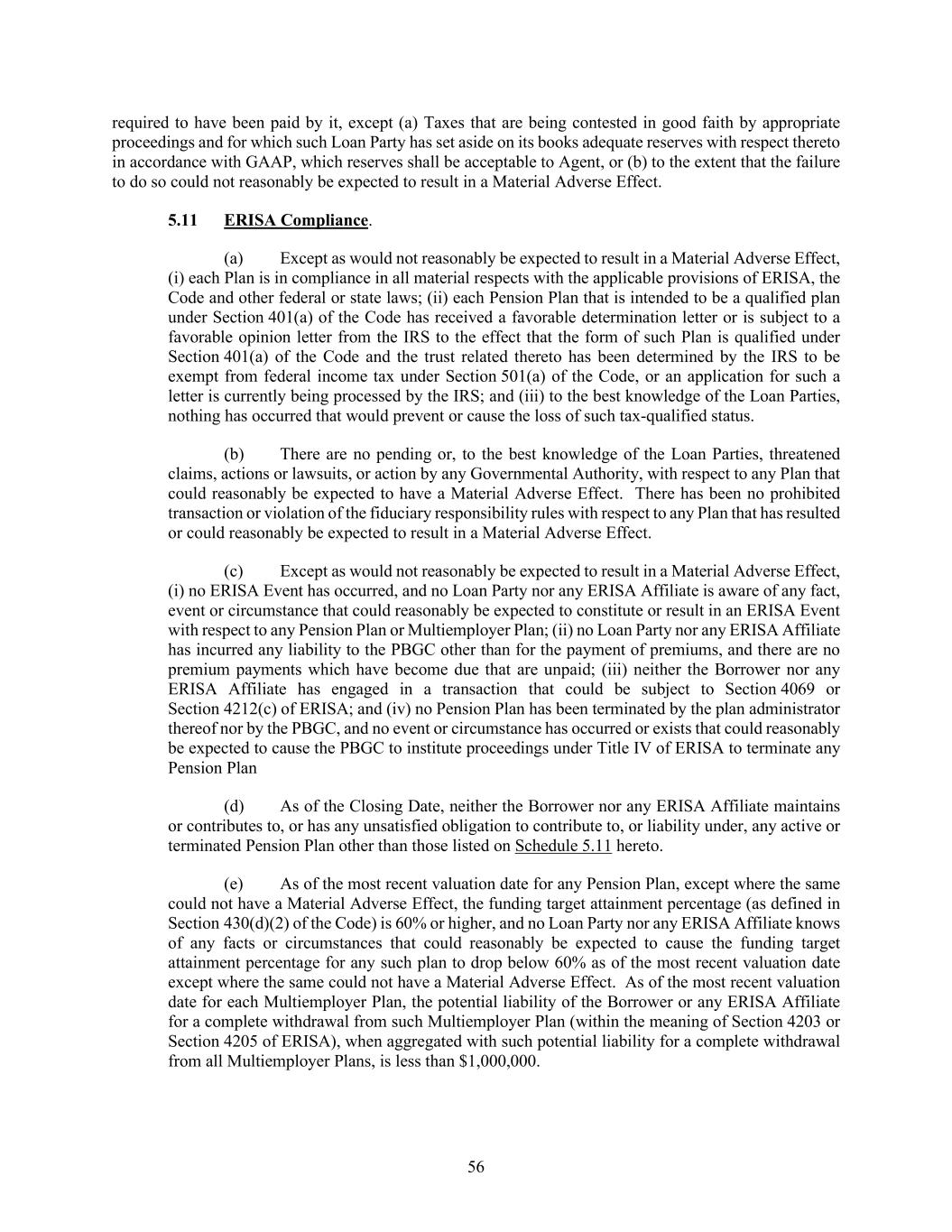 56 required to have been paid by it, except (a) Taxes that are being contested in good faith by appropriate proceedings and for which such Loan Party has set aside on its books adequate reserves with respect thereto in accordance with GAAP, which reserves shall be acceptable to Agent, or (b) to the extent that the failure to do so could not reasonably be expected to result in a Material Adverse Effect. 5.11 ERISA Compliance. (a) Except as would not reasonably be expected to result in a Material Adverse Effect, (i) each Plan is in compliance in all material respects with the applicable provisions of ERISA, the Code and other federal or state laws; (ii) each Pension Plan that is intended to be a qualified plan under Section 401(a) of the Code has received a favorable determination letter or is subject to a favorable opinion letter from the IRS to the effect that the form of such Plan is qualified under Section 401(a) of the Code and the trust related thereto has been determined by the IRS to be exempt from federal income tax under Section 501(a) of the Code, or an application for such a letter is currently being processed by the IRS; and (iii) to the best knowledge of the Loan Parties, nothing has occurred that would prevent or cause the loss of such tax-qualified status. (b) There are no pending or, to the best knowledge of the Loan Parties, threatened claims, actions or lawsuits, or action by any Governmental Authority, with respect to any Plan that could reasonably be expected to have a Material Adverse Effect. There has been no prohibited transaction or violation of the fiduciary responsibility rules with respect to any Plan that has resulted or could reasonably be expected to result in a Material Adverse Effect. (c) Except as would not reasonably be expected to result in a Material Adverse Effect, (i) no ERISA Event has occurred, and no Loan Party nor any ERISA Affiliate is aware of any fact, event or circumstance that could reasonably be expected to constitute or result in an ERISA Event with respect to any Pension Plan or Multiemployer Plan; (ii) no Loan Party nor any ERISA Affiliate has incurred any liability to the PBGC other than for the payment of premiums, and there are no premium payments which have become due that are unpaid; (iii) neither the Borrower nor any ERISA Affiliate has engaged in a transaction that could be subject to Section 4069 or Section 4212(c) of ERISA; and (iv) no Pension Plan has been terminated by the plan administrator thereof nor by the PBGC, and no event or circumstance has occurred or exists that could reasonably be expected to cause the PBGC to institute proceedings under Title IV of ERISA to terminate any Pension Plan (d) As of the Closing Date, neither the Borrower nor any ERISA Affiliate maintains or contributes to, or has any unsatisfied obligation to contribute to, or liability under, any active or terminated Pension Plan other than those listed on Schedule 5.11 hereto. (e) As of the most recent valuation date for any Pension Plan, except where the same could not have a Material Adverse Effect, the funding target attainment percentage (as defined in Section 430(d)(2) of the Code) is 60% or higher, and no Loan Party nor any ERISA Affiliate knows of any facts or circumstances that could reasonably be expected to cause the funding target attainment percentage for any such plan to drop below 60% as of the most recent valuation date except where the same could not have a Material Adverse Effect. As of the most recent valuation date for each Multiemployer Plan, the potential liability of the Borrower or any ERISA Affiliate for a complete withdrawal from such Multiemployer Plan (within the meaning of Section 4203 or Section 4205 of ERISA), when aggregated with such potential liability for a complete withdrawal from all Multiemployer Plans, is less than $1,000,000.