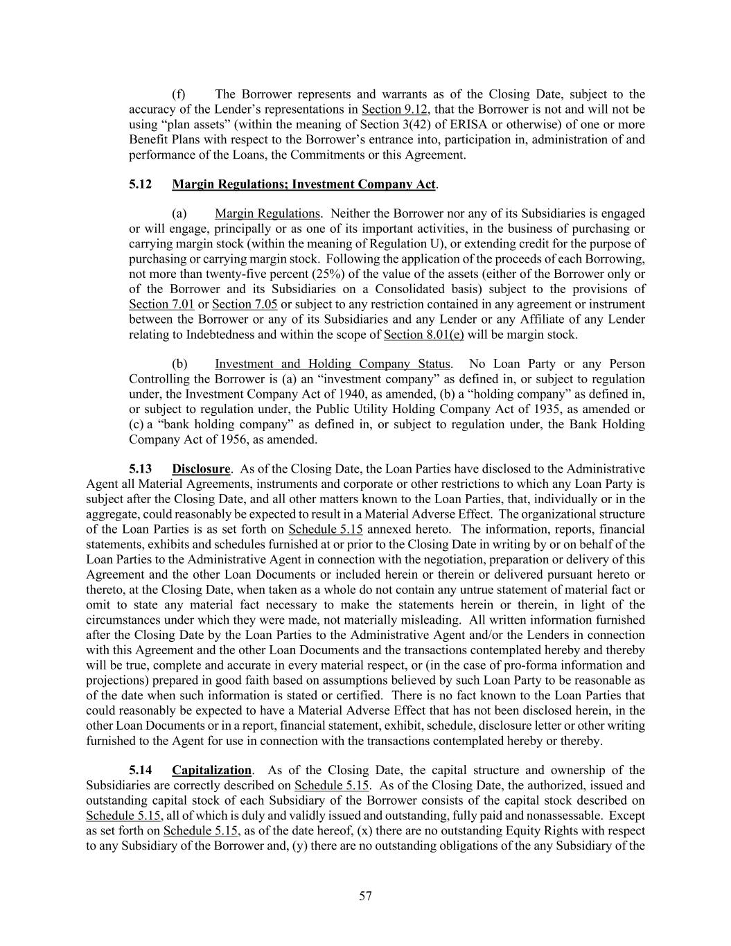 57 (f) The Borrower represents and warrants as of the Closing Date, subject to the accuracy of the Lender’s representations in Section 9.12, that the Borrower is not and will not be using “plan assets” (within the meaning of Section 3(42) of ERISA or otherwise) of one or more Benefit Plans with respect to the Borrower’s entrance into, participation in, administration of and performance of the Loans, the Commitments or this Agreement. 5.12 Margin Regulations; Investment Company Act. (a) Margin Regulations. Neither the Borrower nor any of its Subsidiaries is engaged or will engage, principally or as one of its important activities, in the business of purchasing or carrying margin stock (within the meaning of Regulation U), or extending credit for the purpose of purchasing or carrying margin stock. Following the application of the proceeds of each Borrowing, not more than twenty-five percent (25%) of the value of the assets (either of the Borrower only or of the Borrower and its Subsidiaries on a Consolidated basis) subject to the provisions of Section 7.01 or Section 7.05 or subject to any restriction contained in any agreement or instrument between the Borrower or any of its Subsidiaries and any Lender or any Affiliate of any Lender relating to Indebtedness and within the scope of Section 8.01(e) will be margin stock. (b) Investment and Holding Company Status. No Loan Party or any Person Controlling the Borrower is (a) an “investment company” as defined in, or subject to regulation under, the Investment Company Act of 1940, as amended, (b) a “holding company” as defined in, or subject to regulation under, the Public Utility Holding Company Act of 1935, as amended or (c) a “bank holding company” as defined in, or subject to regulation under, the Bank Holding Company Act of 1956, as amended. 5.13 Disclosure. As of the Closing Date, the Loan Parties have disclosed to the Administrative Agent all Material Agreements, instruments and corporate or other restrictions to which any Loan Party is subject after the Closing Date, and all other matters known to the Loan Parties, that, individually or in the aggregate, could reasonably be expected to result in a Material Adverse Effect. The organizational structure of the Loan Parties is as set forth on Schedule 5.15 annexed hereto. The information, reports, financial statements, exhibits and schedules furnished at or prior to the Closing Date in writing by or on behalf of the Loan Parties to the Administrative Agent in connection with the negotiation, preparation or delivery of this Agreement and the other Loan Documents or included herein or therein or delivered pursuant hereto or thereto, at the Closing Date, when taken as a whole do not contain any untrue statement of material fact or omit to state any material fact necessary to make the statements herein or therein, in light of the circumstances under which they were made, not materially misleading. All written information furnished after the Closing Date by the Loan Parties to the Administrative Agent and/or the Lenders in connection with this Agreement and the other Loan Documents and the transactions contemplated hereby and thereby will be true, complete and accurate in every material respect, or (in the case of pro-forma information and projections) prepared in good faith based on assumptions believed by such Loan Party to be reasonable as of the date when such information is stated or certified. There is no fact known to the Loan Parties that could reasonably be expected to have a Material Adverse Effect that has not been disclosed herein, in the other Loan Documents or in a report, financial statement, exhibit, schedule, disclosure letter or other writing furnished to the Agent for use in connection with the transactions contemplated hereby or thereby. 5.14 Capitalization. As of the Closing Date, the capital structure and ownership of the Subsidiaries are correctly described on Schedule 5.15. As of the Closing Date, the authorized, issued and outstanding capital stock of each Subsidiary of the Borrower consists of the capital stock described on Schedule 5.15, all of which is duly and validly issued and outstanding, fully paid and nonassessable. Except as set forth on Schedule 5.15, as of the date hereof, (x) there are no outstanding Equity Rights with respect to any Subsidiary of the Borrower and, (y) there are no outstanding obligations of the any Subsidiary of the