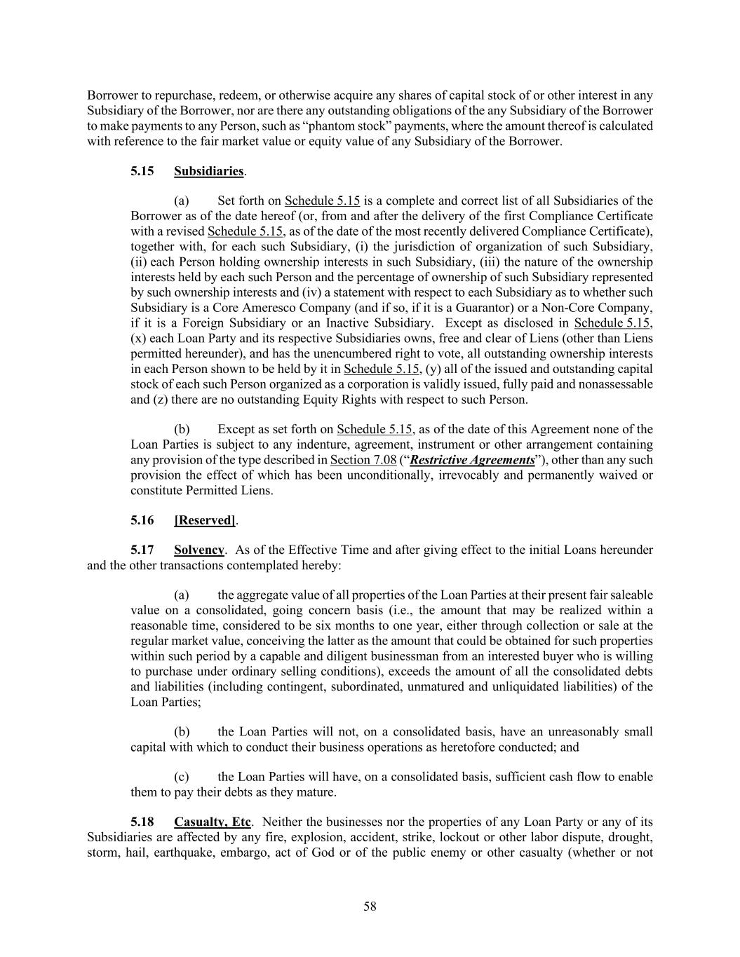 58 Borrower to repurchase, redeem, or otherwise acquire any shares of capital stock of or other interest in any Subsidiary of the Borrower, nor are there any outstanding obligations of the any Subsidiary of the Borrower to make payments to any Person, such as “phantom stock” payments, where the amount thereof is calculated with reference to the fair market value or equity value of any Subsidiary of the Borrower. 5.15 Subsidiaries. (a) Set forth on Schedule 5.15 is a complete and correct list of all Subsidiaries of the Borrower as of the date hereof (or, from and after the delivery of the first Compliance Certificate with a revised Schedule 5.15, as of the date of the most recently delivered Compliance Certificate), together with, for each such Subsidiary, (i) the jurisdiction of organization of such Subsidiary, (ii) each Person holding ownership interests in such Subsidiary, (iii) the nature of the ownership interests held by each such Person and the percentage of ownership of such Subsidiary represented by such ownership interests and (iv) a statement with respect to each Subsidiary as to whether such Subsidiary is a Core Ameresco Company (and if so, if it is a Guarantor) or a Non-Core Company, if it is a Foreign Subsidiary or an Inactive Subsidiary. Except as disclosed in Schedule 5.15, (x) each Loan Party and its respective Subsidiaries owns, free and clear of Liens (other than Liens permitted hereunder), and has the unencumbered right to vote, all outstanding ownership interests in each Person shown to be held by it in Schedule 5.15, (y) all of the issued and outstanding capital stock of each such Person organized as a corporation is validly issued, fully paid and nonassessable and (z) there are no outstanding Equity Rights with respect to such Person. (b) Except as set forth on Schedule 5.15, as of the date of this Agreement none of the Loan Parties is subject to any indenture, agreement, instrument or other arrangement containing any provision of the type described in Section 7.08 (“Restrictive Agreements”), other than any such provision the effect of which has been unconditionally, irrevocably and permanently waived or constitute Permitted Liens. 5.16 [Reserved]. 5.17 Solvency. As of the Effective Time and after giving effect to the initial Loans hereunder and the other transactions contemplated hereby: (a) the aggregate value of all properties of the Loan Parties at their present fair saleable value on a consolidated, going concern basis (i.e., the amount that may be realized within a reasonable time, considered to be six months to one year, either through collection or sale at the regular market value, conceiving the latter as the amount that could be obtained for such properties within such period by a capable and diligent businessman from an interested buyer who is willing to purchase under ordinary selling conditions), exceeds the amount of all the consolidated debts and liabilities (including contingent, subordinated, unmatured and unliquidated liabilities) of the Loan Parties; (b) the Loan Parties will not, on a consolidated basis, have an unreasonably small capital with which to conduct their business operations as heretofore conducted; and (c) the Loan Parties will have, on a consolidated basis, sufficient cash flow to enable them to pay their debts as they mature. 5.18 Casualty, Etc. Neither the businesses nor the properties of any Loan Party or any of its Subsidiaries are affected by any fire, explosion, accident, strike, lockout or other labor dispute, drought, storm, hail, earthquake, embargo, act of God or of the public enemy or other casualty (whether or not