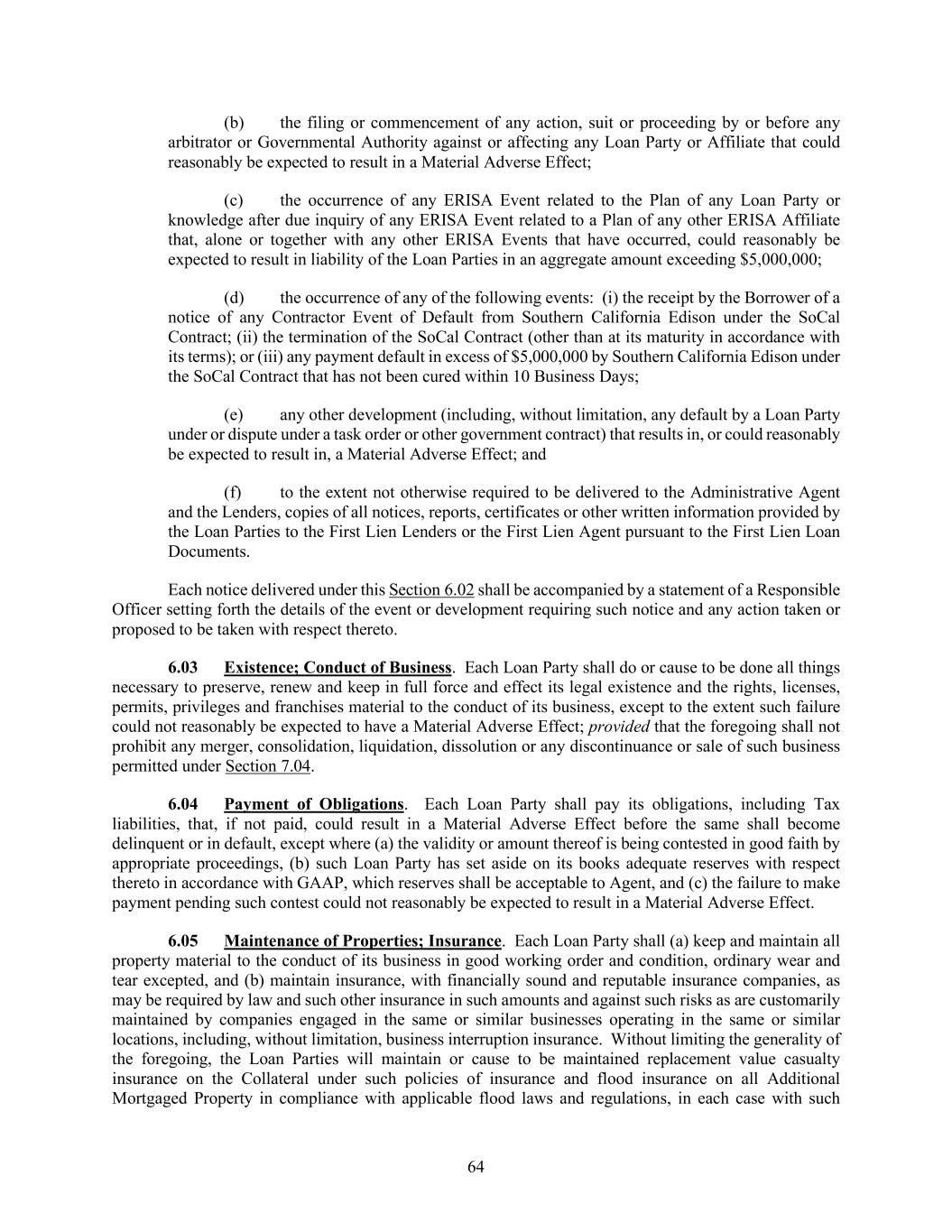 64 (b) the filing or commencement of any action, suit or proceeding by or before any arbitrator or Governmental Authority against or affecting any Loan Party or Affiliate that could reasonably be expected to result in a Material Adverse Effect; (c) the occurrence of any ERISA Event related to the Plan of any Loan Party or knowledge after due inquiry of any ERISA Event related to a Plan of any other ERISA Affiliate that, alone or together with any other ERISA Events that have occurred, could reasonably be expected to result in liability of the Loan Parties in an aggregate amount exceeding $5,000,000; (d) the occurrence of any of the following events: (i) the receipt by the Borrower of a notice of any Contractor Event of Default from Southern California Edison under the SoCal Contract; (ii) the termination of the SoCal Contract (other than at its maturity in accordance with its terms); or (iii) any payment default in excess of $5,000,000 by Southern California Edison under the SoCal Contract that has not been cured within 10 Business Days; (e) any other development (including, without limitation, any default by a Loan Party under or dispute under a task order or other government contract) that results in, or could reasonably be expected to result in, a Material Adverse Effect; and (f) to the extent not otherwise required to be delivered to the Administrative Agent and the Lenders, copies of all notices, reports, certificates or other written information provided by the Loan Parties to the First Lien Lenders or the First Lien Agent pursuant to the First Lien Loan Documents. Each notice delivered under this Section 6.02 shall be accompanied by a statement of a Responsible Officer setting forth the details of the event or development requiring such notice and any action taken or proposed to be taken with respect thereto. 6.03 Existence; Conduct of Business. Each Loan Party shall do or cause to be done all things necessary to preserve, renew and keep in full force and effect its legal existence and the rights, licenses, permits, privileges and franchises material to the conduct of its business, except to the extent such failure could not reasonably be expected to have a Material Adverse Effect; provided that the foregoing shall not prohibit any merger, consolidation, liquidation, dissolution or any discontinuance or sale of such business permitted under Section 7.04. 6.04 Payment of Obligations. Each Loan Party shall pay its obligations, including Tax liabilities, that, if not paid, could result in a Material Adverse Effect before the same shall become delinquent or in default, except where (a) the validity or amount thereof is being contested in good faith by appropriate proceedings, (b) such Loan Party has set aside on its books adequate reserves with respect thereto in accordance with GAAP, which reserves shall be acceptable to Agent, and (c) the failure to make payment pending such contest could not reasonably be expected to result in a Material Adverse Effect. 6.05 Maintenance of Properties; Insurance. Each Loan Party shall (a) keep and maintain all property material to the conduct of its business in good working order and condition, ordinary wear and tear excepted, and (b) maintain insurance, with financially sound and reputable insurance companies, as may be required by law and such other insurance in such amounts and against such risks as are customarily maintained by companies engaged in the same or similar businesses operating in the same or similar locations, including, without limitation, business interruption insurance. Without limiting the generality of the foregoing, the Loan Parties will maintain or cause to be maintained replacement value casualty insurance on the Collateral under such policies of insurance and flood insurance on all Additional Mortgaged Property in compliance with applicable flood laws and regulations, in each case with such