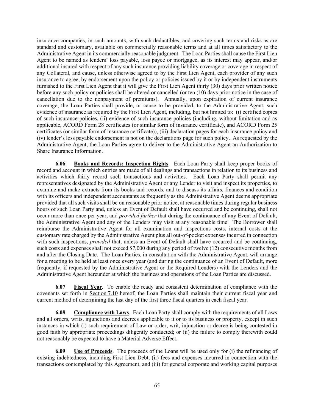 65 insurance companies, in such amounts, with such deductibles, and covering such terms and risks as are standard and customary, available on commercially reasonable terms and at all times satisfactory to the Administrative Agent in its commercially reasonable judgment. The Loan Parties shall cause the First Lien Agent to be named as lenders’ loss payable, loss payee or mortgagee, as its interest may appear, and/or additional insured with respect of any such insurance providing liability coverage or coverage in respect of any Collateral, and cause, unless otherwise agreed to by the First Lien Agent, each provider of any such insurance to agree, by endorsement upon the policy or policies issued by it or by independent instruments furnished to the First Lien Agent that it will give the First Lien Agent thirty (30) days prior written notice before any such policy or policies shall be altered or cancelled (or ten (10) days prior notice in the case of cancellation due to the nonpayment of premiums). Annually, upon expiration of current insurance coverage, the Loan Parties shall provide, or cause to be provided, to the Administrative Agent, such evidence of insurance as required by the First Lien Agent, including, but not limited to: (i) certified copies of such insurance policies, (ii) evidence of such insurance policies (including, without limitation and as applicable, ACORD Form 28 certificates (or similar form of insurance certificate), and ACORD Form 25 certificates (or similar form of insurance certificate)), (iii) declaration pages for each insurance policy and (iv) lender’s loss payable endorsement is not on the declarations page for such policy. As requested by the Administrative Agent, the Loan Parties agree to deliver to the Administrative Agent an Authorization to Share Insurance Information. 6.06 Books and Records; Inspection Rights. Each Loan Party shall keep proper books of record and account in which entries are made of all dealings and transactions in relation to its business and activities which fairly record such transactions and activities. Each Loan Party shall permit any representatives designated by the Administrative Agent or any Lender to visit and inspect its properties, to examine and make extracts from its books and records, and to discuss its affairs, finances and condition with its officers and independent accountants as frequently as the Administrative Agent deems appropriate provided that all such visits shall be on reasonable prior notice, at reasonable times during regular business hours of such Loan Party and, unless an Event of Default shall have occurred and be continuing, shall not occur more than once per year, and provided further that during the continuance of any Event of Default, the Administrative Agent and any of the Lenders may visit at any reasonable time. The Borrower shall reimburse the Administrative Agent for all examination and inspections costs, internal costs at the customary rate charged by the Administrative Agent plus all out-of-pocket expenses incurred in connection with such inspections, provided that, unless an Event of Default shall have occurred and be continuing, such costs and expenses shall not exceed $7,000 during any period of twelve (12) consecutive months from and after the Closing Date. The Loan Parties, in consultation with the Administrative Agent, will arrange for a meeting to be held at least once every year (and during the continuance of an Event of Default, more frequently, if requested by the Administrative Agent or the Required Lenders) with the Lenders and the Administrative Agent hereunder at which the business and operations of the Loan Parties are discussed. 6.07 Fiscal Year. To enable the ready and consistent determination of compliance with the covenants set forth in Section 7.10 hereof, the Loan Parties shall maintain their current fiscal year and current method of determining the last day of the first three fiscal quarters in each fiscal year. 6.08 Compliance with Laws. Each Loan Party shall comply with the requirements of all Laws and all orders, writs, injunctions and decrees applicable to it or to its business or property, except in such instances in which (i) such requirement of Law or order, writ, injunction or decree is being contested in good faith by appropriate proceedings diligently conducted; or (ii) the failure to comply therewith could not reasonably be expected to have a Material Adverse Effect. 6.09 Use of Proceeds. The proceeds of the Loans will be used only for (i) the refinancing of existing indebtedness, including First Lien Debt, (ii) fees and expenses incurred in connection with the transactions contemplated by this Agreement, and (iii) for general corporate and working capital purposes