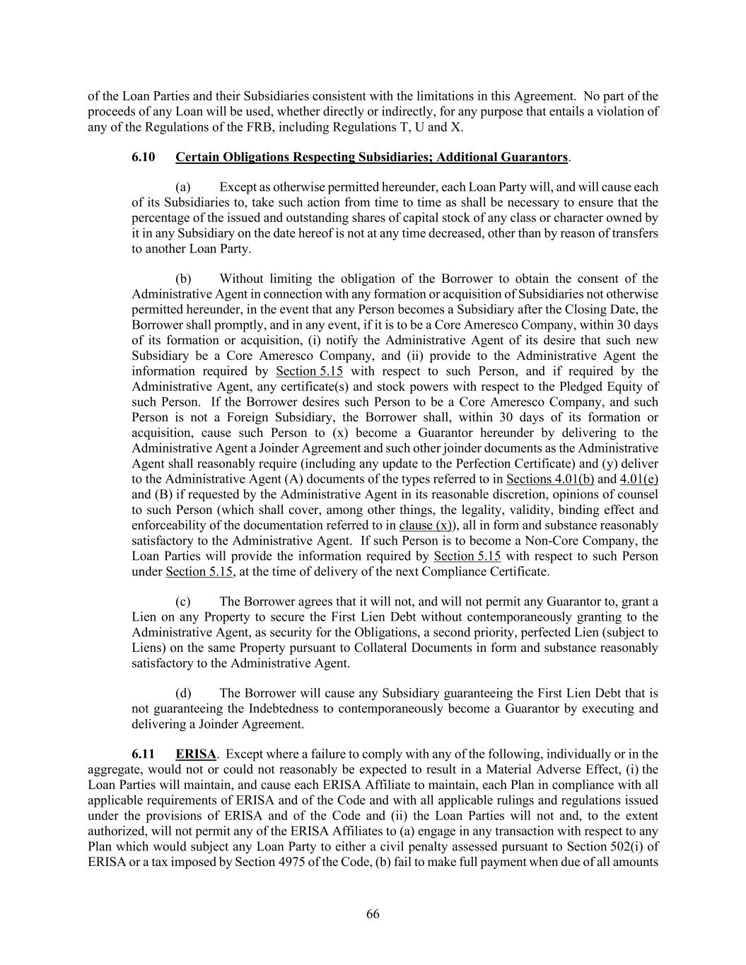 66 of the Loan Parties and their Subsidiaries consistent with the limitations in this Agreement. No part of the proceeds of any Loan will be used, whether directly or indirectly, for any purpose that entails a violation of any of the Regulations of the FRB, including Regulations T, U and X. 6.10 Certain Obligations Respecting Subsidiaries; Additional Guarantors. (a) Except as otherwise permitted hereunder, each Loan Party will, and will cause each of its Subsidiaries to, take such action from time to time as shall be necessary to ensure that the percentage of the issued and outstanding shares of capital stock of any class or character owned by it in any Subsidiary on the date hereof is not at any time decreased, other than by reason of transfers to another Loan Party. (b) Without limiting the obligation of the Borrower to obtain the consent of the Administrative Agent in connection with any formation or acquisition of Subsidiaries not otherwise permitted hereunder, in the event that any Person becomes a Subsidiary after the Closing Date, the Borrower shall promptly, and in any event, if it is to be a Core Ameresco Company, within 30 days of its formation or acquisition, (i) notify the Administrative Agent of its desire that such new Subsidiary be a Core Ameresco Company, and (ii) provide to the Administrative Agent the information required by Section 5.15 with respect to such Person, and if required by the Administrative Agent, any certificate(s) and stock powers with respect to the Pledged Equity of such Person. If the Borrower desires such Person to be a Core Ameresco Company, and such Person is not a Foreign Subsidiary, the Borrower shall, within 30 days of its formation or acquisition, cause such Person to (x) become a Guarantor hereunder by delivering to the Administrative Agent a Joinder Agreement and such other joinder documents as the Administrative Agent shall reasonably require (including any update to the Perfection Certificate) and (y) deliver to the Administrative Agent (A) documents of the types referred to in Sections 4.01(b) and 4.01(e) and (B) if requested by the Administrative Agent in its reasonable discretion, opinions of counsel to such Person (which shall cover, among other things, the legality, validity, binding effect and enforceability of the documentation referred to in clause (x)), all in form and substance reasonably satisfactory to the Administrative Agent. If such Person is to become a Non-Core Company, the Loan Parties will provide the information required by Section 5.15 with respect to such Person under Section 5.15, at the time of delivery of the next Compliance Certificate. (c) The Borrower agrees that it will not, and will not permit any Guarantor to, grant a Lien on any Property to secure the First Lien Debt without contemporaneously granting to the Administrative Agent, as security for the Obligations, a second priority, perfected Lien (subject to Liens) on the same Property pursuant to Collateral Documents in form and substance reasonably satisfactory to the Administrative Agent. (d) The Borrower will cause any Subsidiary guaranteeing the First Lien Debt that is not guaranteeing the Indebtedness to contemporaneously become a Guarantor by executing and delivering a Joinder Agreement. 6.11 ERISA. Except where a failure to comply with any of the following, individually or in the aggregate, would not or could not reasonably be expected to result in a Material Adverse Effect, (i) the Loan Parties will maintain, and cause each ERISA Affiliate to maintain, each Plan in compliance with all applicable requirements of ERISA and of the Code and with all applicable rulings and regulations issued under the provisions of ERISA and of the Code and (ii) the Loan Parties will not and, to the extent authorized, will not permit any of the ERISA Affiliates to (a) engage in any transaction with respect to any Plan which would subject any Loan Party to either a civil penalty assessed pursuant to Section 502(i) of ERISA or a tax imposed by Section 4975 of the Code, (b) fail to make full payment when due of all amounts