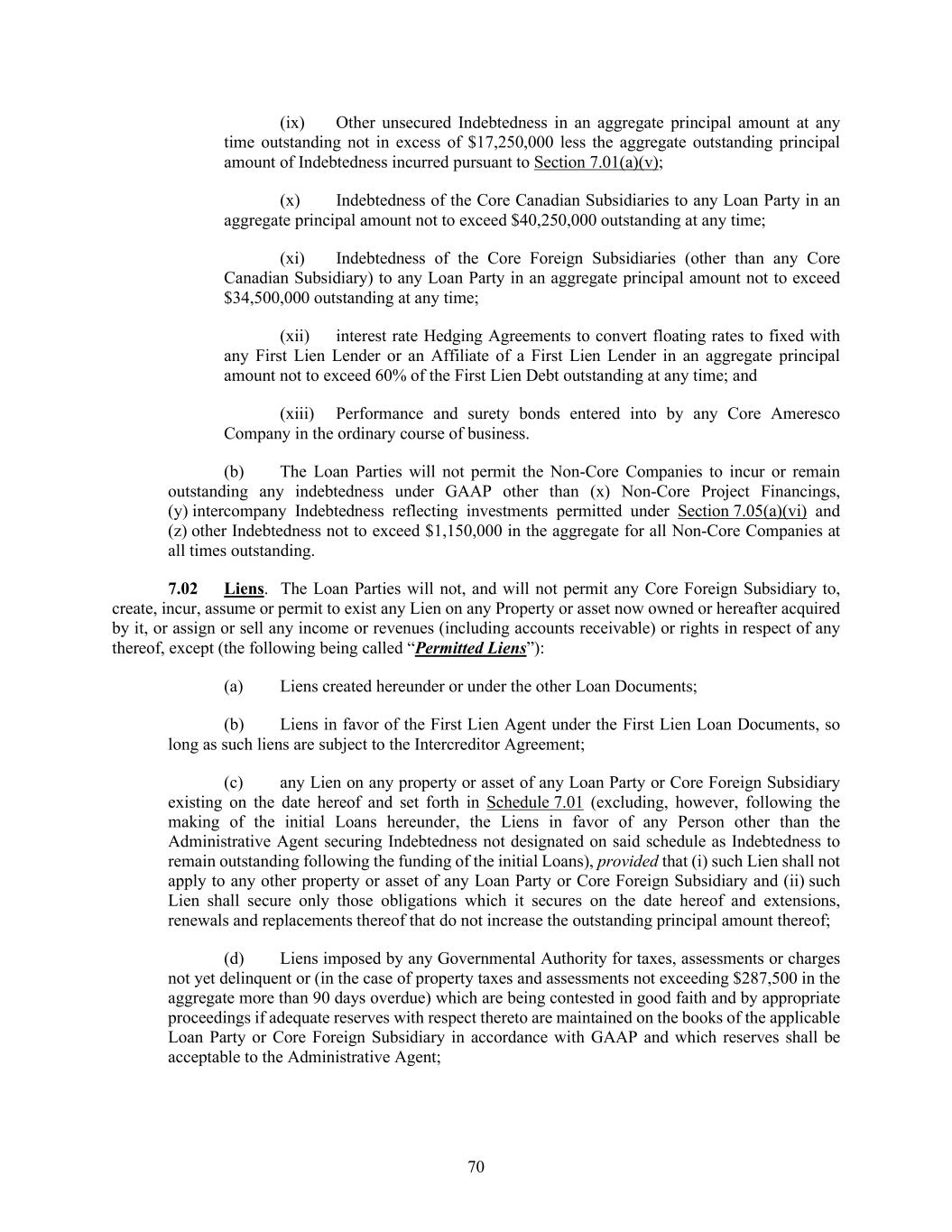 70 (ix) Other unsecured Indebtedness in an aggregate principal amount at any time outstanding not in excess of $17,250,000 less the aggregate outstanding principal amount of Indebtedness incurred pursuant to Section 7.01(a)(v); (x) Indebtedness of the Core Canadian Subsidiaries to any Loan Party in an aggregate principal amount not to exceed $40,250,000 outstanding at any time; (xi) Indebtedness of the Core Foreign Subsidiaries (other than any Core Canadian Subsidiary) to any Loan Party in an aggregate principal amount not to exceed $34,500,000 outstanding at any time; (xii) interest rate Hedging Agreements to convert floating rates to fixed with any First Lien Lender or an Affiliate of a First Lien Lender in an aggregate principal amount not to exceed 60% of the First Lien Debt outstanding at any time; and (xiii) Performance and surety bonds entered into by any Core Ameresco Company in the ordinary course of business. (b) The Loan Parties will not permit the Non-Core Companies to incur or remain outstanding any indebtedness under GAAP other than (x) Non-Core Project Financings, (y) intercompany Indebtedness reflecting investments permitted under Section 7.05(a)(vi) and (z) other Indebtedness not to exceed $1,150,000 in the aggregate for all Non-Core Companies at all times outstanding. 7.02 Liens. The Loan Parties will not, and will not permit any Core Foreign Subsidiary to, create, incur, assume or permit to exist any Lien on any Property or asset now owned or hereafter acquired by it, or assign or sell any income or revenues (including accounts receivable) or rights in respect of any thereof, except (the following being called “Permitted Liens”): (a) Liens created hereunder or under the other Loan Documents; (b) Liens in favor of the First Lien Agent under the First Lien Loan Documents, so long as such liens are subject to the Intercreditor Agreement; (c) any Lien on any property or asset of any Loan Party or Core Foreign Subsidiary existing on the date hereof and set forth in Schedule 7.01 (excluding, however, following the making of the initial Loans hereunder, the Liens in favor of any Person other than the Administrative Agent securing Indebtedness not designated on said schedule as Indebtedness to remain outstanding following the funding of the initial Loans), provided that (i) such Lien shall not apply to any other property or asset of any Loan Party or Core Foreign Subsidiary and (ii) such Lien shall secure only those obligations which it secures on the date hereof and extensions, renewals and replacements thereof that do not increase the outstanding principal amount thereof; (d) Liens imposed by any Governmental Authority for taxes, assessments or charges not yet delinquent or (in the case of property taxes and assessments not exceeding $287,500 in the aggregate more than 90 days overdue) which are being contested in good faith and by appropriate proceedings if adequate reserves with respect thereto are maintained on the books of the applicable Loan Party or Core Foreign Subsidiary in accordance with GAAP and which reserves shall be acceptable to the Administrative Agent;