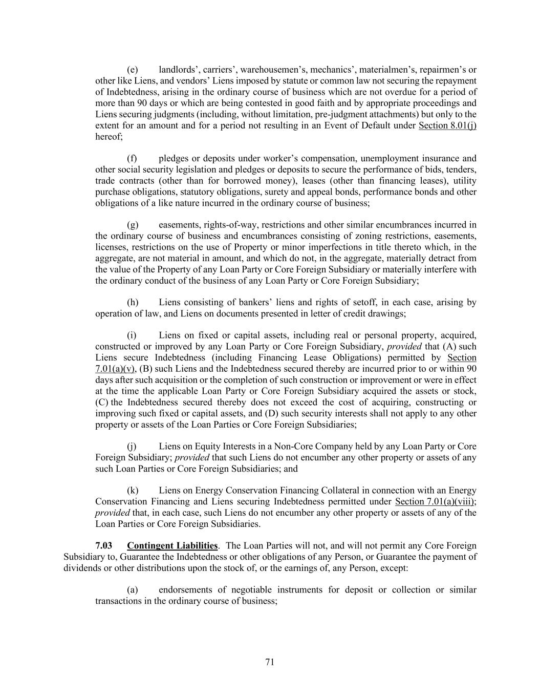 71 (e) landlords’, carriers’, warehousemen’s, mechanics’, materialmen’s, repairmen’s or other like Liens, and vendors’ Liens imposed by statute or common law not securing the repayment of Indebtedness, arising in the ordinary course of business which are not overdue for a period of more than 90 days or which are being contested in good faith and by appropriate proceedings and Liens securing judgments (including, without limitation, pre-judgment attachments) but only to the extent for an amount and for a period not resulting in an Event of Default under Section 8.01(j) hereof; (f) pledges or deposits under worker’s compensation, unemployment insurance and other social security legislation and pledges or deposits to secure the performance of bids, tenders, trade contracts (other than for borrowed money), leases (other than financing leases), utility purchase obligations, statutory obligations, surety and appeal bonds, performance bonds and other obligations of a like nature incurred in the ordinary course of business; (g) easements, rights-of-way, restrictions and other similar encumbrances incurred in the ordinary course of business and encumbrances consisting of zoning restrictions, easements, licenses, restrictions on the use of Property or minor imperfections in title thereto which, in the aggregate, are not material in amount, and which do not, in the aggregate, materially detract from the value of the Property of any Loan Party or Core Foreign Subsidiary or materially interfere with the ordinary conduct of the business of any Loan Party or Core Foreign Subsidiary; (h) Liens consisting of bankers’ liens and rights of setoff, in each case, arising by operation of law, and Liens on documents presented in letter of credit drawings; (i) Liens on fixed or capital assets, including real or personal property, acquired, constructed or improved by any Loan Party or Core Foreign Subsidiary, provided that (A) such Liens secure Indebtedness (including Financing Lease Obligations) permitted by Section 7.01(a)(v), (B) such Liens and the Indebtedness secured thereby are incurred prior to or within 90 days after such acquisition or the completion of such construction or improvement or were in effect at the time the applicable Loan Party or Core Foreign Subsidiary acquired the assets or stock, (C) the Indebtedness secured thereby does not exceed the cost of acquiring, constructing or improving such fixed or capital assets, and (D) such security interests shall not apply to any other property or assets of the Loan Parties or Core Foreign Subsidiaries; (j) Liens on Equity Interests in a Non-Core Company held by any Loan Party or Core Foreign Subsidiary; provided that such Liens do not encumber any other property or assets of any such Loan Parties or Core Foreign Subsidiaries; and (k) Liens on Energy Conservation Financing Collateral in connection with an Energy Conservation Financing and Liens securing Indebtedness permitted under Section 7.01(a)(viii); provided that, in each case, such Liens do not encumber any other property or assets of any of the Loan Parties or Core Foreign Subsidiaries. 7.03 Contingent Liabilities. The Loan Parties will not, and will not permit any Core Foreign Subsidiary to, Guarantee the Indebtedness or other obligations of any Person, or Guarantee the payment of dividends or other distributions upon the stock of, or the earnings of, any Person, except: (a) endorsements of negotiable instruments for deposit or collection or similar transactions in the ordinary course of business;