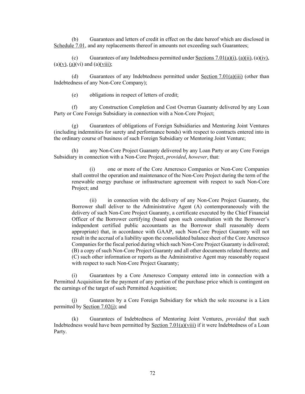 72 (b) Guarantees and letters of credit in effect on the date hereof which are disclosed in Schedule 7.01, and any replacements thereof in amounts not exceeding such Guarantees; (c) Guarantees of any Indebtedness permitted under Sections 7.01(a)(i), (a)(ii), (a)(iv), (a)(v), (a)(vi) and (a)(viii); (d) Guarantees of any Indebtedness permitted under Section 7.01(a)(iii) (other than Indebtedness of any Non-Core Company); (e) obligations in respect of letters of credit; (f) any Construction Completion and Cost Overrun Guaranty delivered by any Loan Party or Core Foreign Subsidiary in connection with a Non-Core Project; (g) Guarantees of obligations of Foreign Subsidiaries and Mentoring Joint Ventures (including indemnities for surety and performance bonds) with respect to contracts entered into in the ordinary course of business of such Foreign Subsidiary or Mentoring Joint Venture; (h) any Non-Core Project Guaranty delivered by any Loan Party or any Core Foreign Subsidiary in connection with a Non-Core Project, provided, however, that: (i) one or more of the Core Ameresco Companies or Non-Core Companies shall control the operation and maintenance of the Non-Core Project during the term of the renewable energy purchase or infrastructure agreement with respect to such Non-Core Project; and (ii) in connection with the delivery of any Non-Core Project Guaranty, the Borrower shall deliver to the Administrative Agent (A) contemporaneously with the delivery of such Non-Core Project Guaranty, a certificate executed by the Chief Financial Officer of the Borrower certifying (based upon such consultation with the Borrower’s independent certified public accountants as the Borrower shall reasonably deem appropriate) that, in accordance with GAAP, such Non-Core Project Guaranty will not result in the accrual of a liability upon the consolidated balance sheet of the Core Ameresco Companies for the fiscal period during which such Non-Core Project Guaranty is delivered; (B) a copy of such Non-Core Project Guaranty and all other documents related thereto; and (C) such other information or reports as the Administrative Agent may reasonably request with respect to such Non-Core Project Guaranty; (i) Guarantees by a Core Ameresco Company entered into in connection with a Permitted Acquisition for the payment of any portion of the purchase price which is contingent on the earnings of the target of such Permitted Acquisition; (j) Guarantees by a Core Foreign Subsidiary for which the sole recourse is a Lien permitted by Section 7.02(j); and (k) Guarantees of Indebtedness of Mentoring Joint Ventures, provided that such Indebtedness would have been permitted by Section 7.01(a)(viii) if it were Indebtedness of a Loan Party.
