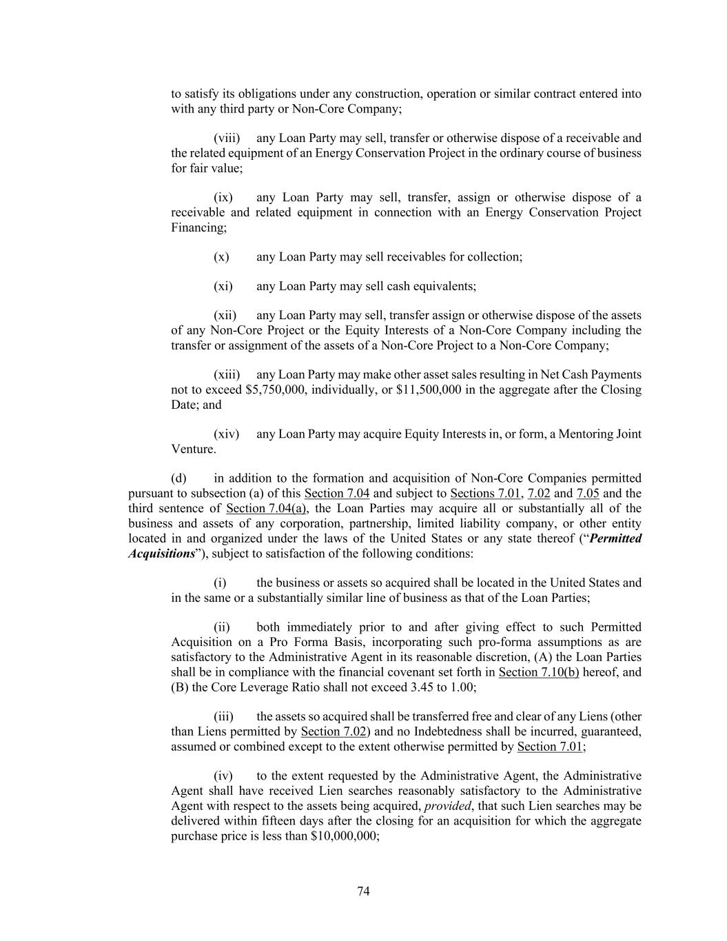 74 to satisfy its obligations under any construction, operation or similar contract entered into with any third party or Non-Core Company; (viii) any Loan Party may sell, transfer or otherwise dispose of a receivable and the related equipment of an Energy Conservation Project in the ordinary course of business for fair value; (ix) any Loan Party may sell, transfer, assign or otherwise dispose of a receivable and related equipment in connection with an Energy Conservation Project Financing; (x) any Loan Party may sell receivables for collection; (xi) any Loan Party may sell cash equivalents; (xii) any Loan Party may sell, transfer assign or otherwise dispose of the assets of any Non-Core Project or the Equity Interests of a Non-Core Company including the transfer or assignment of the assets of a Non-Core Project to a Non-Core Company; (xiii) any Loan Party may make other asset sales resulting in Net Cash Payments not to exceed $5,750,000, individually, or $11,500,000 in the aggregate after the Closing Date; and (xiv) any Loan Party may acquire Equity Interests in, or form, a Mentoring Joint Venture. (d) in addition to the formation and acquisition of Non-Core Companies permitted pursuant to subsection (a) of this Section 7.04 and subject to Sections 7.01, 7.02 and 7.05 and the third sentence of Section 7.04(a), the Loan Parties may acquire all or substantially all of the business and assets of any corporation, partnership, limited liability company, or other entity located in and organized under the laws of the United States or any state thereof (“Permitted Acquisitions”), subject to satisfaction of the following conditions: (i) the business or assets so acquired shall be located in the United States and in the same or a substantially similar line of business as that of the Loan Parties; (ii) both immediately prior to and after giving effect to such Permitted Acquisition on a Pro Forma Basis, incorporating such pro-forma assumptions as are satisfactory to the Administrative Agent in its reasonable discretion, (A) the Loan Parties shall be in compliance with the financial covenant set forth in Section 7.10(b) hereof, and (B) the Core Leverage Ratio shall not exceed 3.45 to 1.00; (iii) the assets so acquired shall be transferred free and clear of any Liens (other than Liens permitted by Section 7.02) and no Indebtedness shall be incurred, guaranteed, assumed or combined except to the extent otherwise permitted by Section 7.01; (iv) to the extent requested by the Administrative Agent, the Administrative Agent shall have received Lien searches reasonably satisfactory to the Administrative Agent with respect to the assets being acquired, provided, that such Lien searches may be delivered within fifteen days after the closing for an acquisition for which the aggregate purchase price is less than $10,000,000;