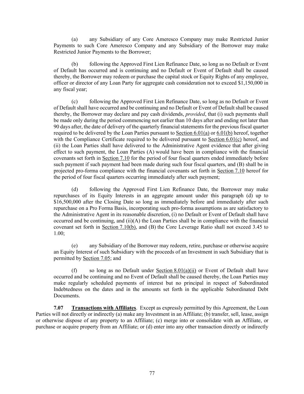 77 (a) any Subsidiary of any Core Ameresco Company may make Restricted Junior Payments to such Core Ameresco Company and any Subsidiary of the Borrower may make Restricted Junior Payments to the Borrower; (b) following the Approved First Lien Refinance Date, so long as no Default or Event of Default has occurred and is continuing and no Default or Event of Default shall be caused thereby, the Borrower may redeem or purchase the capital stock or Equity Rights of any employee, officer or director of any Loan Party for aggregate cash consideration not to exceed $1,150,000 in any fiscal year; (c) following the Approved First Lien Refinance Date, so long as no Default or Event of Default shall have occurred and be continuing and no Default or Event of Default shall be caused thereby, the Borrower may declare and pay cash dividends, provided, that (i) such payments shall be made only during the period commencing not earlier than 10 days after and ending not later than 90 days after, the date of delivery of the quarterly financial statements for the previous fiscal quarter required to be delivered by the Loan Parties pursuant to Section 6.01(a) or 6.01(b) hereof, together with the Compliance Certificate required to be delivered pursuant to Section 6.01(c) hereof, and (ii) the Loan Parties shall have delivered to the Administrative Agent evidence that after giving effect to such payment, the Loan Parties (A) would have been in compliance with the financial covenants set forth in Section 7.10 for the period of four fiscal quarters ended immediately before such payment if such payment had been made during such four fiscal quarters, and (B) shall be in projected pro-forma compliance with the financial covenants set forth in Section 7.10 hereof for the period of four fiscal quarters occurring immediately after such payment; (d) following the Approved First Lien Refinance Date, the Borrower may make repurchases of its Equity Interests in an aggregate amount under this paragraph (d) up to $16,500,000 after the Closing Date so long as immediately before and immediately after such repurchase on a Pro Forma Basis, incorporating such pro-forma assumptions as are satisfactory to the Administrative Agent in its reasonable discretion, (i) no Default or Event of Default shall have occurred and be continuing, and (ii)(A) the Loan Parties shall be in compliance with the financial covenant set forth in Section 7.10(b), and (B) the Core Leverage Ratio shall not exceed 3.45 to 1.00; (e) any Subsidiary of the Borrower may redeem, retire, purchase or otherwise acquire an Equity Interest of such Subsidiary with the proceeds of an Investment in such Subsidiary that is permitted by Section 7.05; and (f) so long as no Default under Section 8.01(a)(ii) or Event of Default shall have occurred and be continuing and no Event of Default shall be caused thereby, the Loan Parties may make regularly scheduled payments of interest but no principal in respect of Subordinated Indebtedness on the dates and in the amounts set forth in the applicable Subordinated Debt Documents. 7.07 Transactions with Affiliates. Except as expressly permitted by this Agreement, the Loan Parties will not directly or indirectly (a) make any Investment in an Affiliate; (b) transfer, sell, lease, assign or otherwise dispose of any property to an Affiliate; (c) merge into or consolidate with an Affiliate, or purchase or acquire property from an Affiliate; or (d) enter into any other transaction directly or indirectly