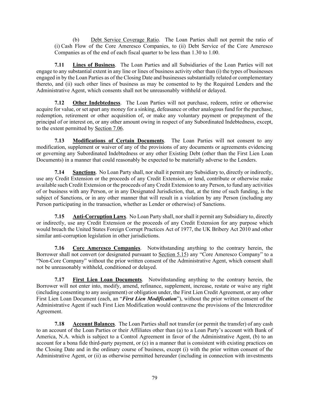 79 (b) Debt Service Coverage Ratio. The Loan Parties shall not permit the ratio of (i) Cash Flow of the Core Ameresco Companies, to (ii) Debt Service of the Core Ameresco Companies as of the end of each fiscal quarter to be less than 1.30 to 1.00. 7.11 Lines of Business. The Loan Parties and all Subsidiaries of the Loan Parties will not engage to any substantial extent in any line or lines of business activity other than (i) the types of businesses engaged in by the Loan Parties as of the Closing Date and businesses substantially related or complementary thereto, and (ii) such other lines of business as may be consented to by the Required Lenders and the Administrative Agent, which consents shall not be unreasonably withheld or delayed. 7.12 Other Indebtedness. The Loan Parties will not purchase, redeem, retire or otherwise acquire for value, or set apart any money for a sinking, defeasance or other analogous fund for the purchase, redemption, retirement or other acquisition of, or make any voluntary payment or prepayment of the principal of or interest on, or any other amount owing in respect of any Subordinated Indebtedness, except, to the extent permitted by Section 7.06. 7.13 Modifications of Certain Documents. The Loan Parties will not consent to any modification, supplement or waiver of any of the provisions of any documents or agreements evidencing or governing any Subordinated Indebtedness or any other Existing Debt (other than the First Lien Loan Documents) in a manner that could reasonably be expected to be materially adverse to the Lenders. 7.14 Sanctions. No Loan Party shall, nor shall it permit any Subsidiary to, directly or indirectly, use any Credit Extension or the proceeds of any Credit Extension, or lend, contribute or otherwise make available such Credit Extension or the proceeds of any Credit Extension to any Person, to fund any activities of or business with any Person, or in any Designated Jurisdiction, that, at the time of such funding, is the subject of Sanctions, or in any other manner that will result in a violation by any Person (including any Person participating in the transaction, whether as Lender or otherwise) of Sanctions. 7.15 Anti-Corruption Laws. No Loan Party shall, nor shall it permit any Subsidiary to, directly or indirectly, use any Credit Extension or the proceeds of any Credit Extension for any purpose which would breach the United States Foreign Corrupt Practices Act of 1977, the UK Bribery Act 2010 and other similar anti-corruption legislation in other jurisdictions. 7.16 Core Ameresco Companies. Notwithstanding anything to the contrary herein, the Borrower shall not convert (or designated pursuant to Section 5.15) any “Core Ameresco Company” to a “Non-Core Company” without the prior written consent of the Administrative Agent, which consent shall not be unreasonably withheld, conditioned or delayed. 7.17 First Lien Loan Documents. Notwithstanding anything to the contrary herein, the Borrower will not enter into, modify, amend, refinance, supplement, increase, restate or waive any right (including consenting to any assignment) or obligation under, the First Lien Credit Agreement, or any other First Lien Loan Document (each, an “First Lien Modification”), without the prior written consent of the Administrative Agent if such First Lien Modification would contravene the provisions of the Intercreditor Agreement. 7.18 Account Balances. The Loan Parties shall not transfer (or permit the transfer) of any cash to an account of the Loan Parties or their Affiliates other than (a) to a Loan Party’s account with Bank of America, N.A. which is subject to a Control Agreement in favor of the Administrative Agent, (b) to an account for a bona fide third-party payment, or (c) in a manner that is consistent with existing practices on the Closing Date and in the ordinary course of business, except (i) with the prior written consent of the Administrative Agent, or (ii) as otherwise permitted hereunder (including in connection with investments