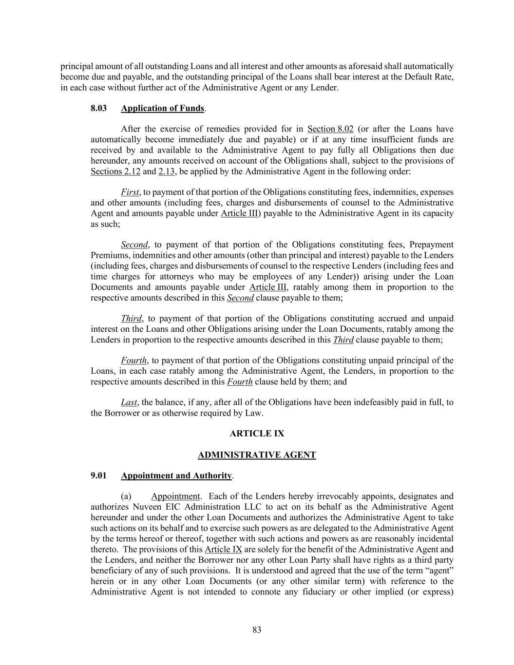 83 principal amount of all outstanding Loans and all interest and other amounts as aforesaid shall automatically become due and payable, and the outstanding principal of the Loans shall bear interest at the Default Rate, in each case without further act of the Administrative Agent or any Lender. 8.03 Application of Funds. After the exercise of remedies provided for in Section 8.02 (or after the Loans have automatically become immediately due and payable) or if at any time insufficient funds are received by and available to the Administrative Agent to pay fully all Obligations then due hereunder, any amounts received on account of the Obligations shall, subject to the provisions of Sections 2.12 and 2.13, be applied by the Administrative Agent in the following order: First, to payment of that portion of the Obligations constituting fees, indemnities, expenses and other amounts (including fees, charges and disbursements of counsel to the Administrative Agent and amounts payable under Article III) payable to the Administrative Agent in its capacity as such; Second, to payment of that portion of the Obligations constituting fees, Prepayment Premiums, indemnities and other amounts (other than principal and interest) payable to the Lenders (including fees, charges and disbursements of counsel to the respective Lenders (including fees and time charges for attorneys who may be employees of any Lender)) arising under the Loan Documents and amounts payable under Article III, ratably among them in proportion to the respective amounts described in this Second clause payable to them; Third, to payment of that portion of the Obligations constituting accrued and unpaid interest on the Loans and other Obligations arising under the Loan Documents, ratably among the Lenders in proportion to the respective amounts described in this Third clause payable to them; Fourth, to payment of that portion of the Obligations constituting unpaid principal of the Loans, in each case ratably among the Administrative Agent, the Lenders, in proportion to the respective amounts described in this Fourth clause held by them; and Last, the balance, if any, after all of the Obligations have been indefeasibly paid in full, to the Borrower or as otherwise required by Law. ARTICLE IX ADMINISTRATIVE AGENT 9.01 Appointment and Authority. (a) Appointment. Each of the Lenders hereby irrevocably appoints, designates and authorizes Nuveen EIC Administration LLC to act on its behalf as the Administrative Agent hereunder and under the other Loan Documents and authorizes the Administrative Agent to take such actions on its behalf and to exercise such powers as are delegated to the Administrative Agent by the terms hereof or thereof, together with such actions and powers as are reasonably incidental thereto. The provisions of this Article IX are solely for the benefit of the Administrative Agent and the Lenders, and neither the Borrower nor any other Loan Party shall have rights as a third party beneficiary of any of such provisions. It is understood and agreed that the use of the term “agent” herein or in any other Loan Documents (or any other similar term) with reference to the Administrative Agent is not intended to connote any fiduciary or other implied (or express)