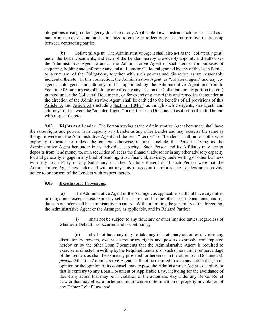 84 obligations arising under agency doctrine of any Applicable Law. Instead such term is used as a matter of market custom, and is intended to create or reflect only an administrative relationship between contracting parties. (b) Collateral Agent. The Administrative Agent shall also act as the “collateral agent” under the Loan Documents, and each of the Lenders hereby irrevocably appoints and authorizes the Administrative Agent to act as the Administrative Agent of such Lender for purposes of acquiring, holding and enforcing any and all Liens on Collateral granted by any of the Loan Parties to secure any of the Obligations, together with such powers and discretion as are reasonably incidental thereto. In this connection, the Administrative Agent, as “collateral agent” and any co- agents, sub-agents and attorneys-in-fact appointed by the Administrative Agent pursuant to Section 9.05 for purposes of holding or enforcing any Lien on the Collateral (or any portion thereof) granted under the Collateral Documents, or for exercising any rights and remedies thereunder at the direction of the Administrative Agent, shall be entitled to the benefits of all provisions of this Article IX and Article XI (including Section 11.04(c), as though such co-agents, sub-agents and attorneys-in-fact were the “collateral agent” under the Loan Documents) as if set forth in full herein with respect thereto. 9.02 Rights as a Lender. The Person serving as the Administrative Agent hereunder shall have the same rights and powers in its capacity as a Lender as any other Lender and may exercise the same as though it were not the Administrative Agent and the term “Lender” or “Lenders” shall, unless otherwise expressly indicated or unless the context otherwise requires, include the Person serving as the Administrative Agent hereunder in its individual capacity. Such Person and its Affiliates may accept deposits from, lend money to, own securities of, act as the financial advisor or in any other advisory capacity for and generally engage in any kind of banking, trust, financial, advisory, underwriting or other business with any Loan Party or any Subsidiary or other Affiliate thereof as if such Person were not the Administrative Agent hereunder and without any duty to account therefor to the Lenders or to provide notice to or consent of the Lenders with respect thereto. 9.03 Exculpatory Provisions. (a) The Administrative Agent or the Arranger, as applicable, shall not have any duties or obligations except those expressly set forth herein and in the other Loan Documents, and its duties hereunder shall be administrative in nature. Without limiting the generality of the foregoing, the Administrative Agent or the Arranger, as applicable, and its Related Parties: (i) shall not be subject to any fiduciary or other implied duties, regardless of whether a Default has occurred and is continuing; (ii) shall not have any duty to take any discretionary action or exercise any discretionary powers, except discretionary rights and powers expressly contemplated hereby or by the other Loan Documents that the Administrative Agent is required to exercise as directed in writing by the Required Lenders (or such other number or percentage of the Lenders as shall be expressly provided for herein or in the other Loan Documents), provided that the Administrative Agent shall not be required to take any action that, in its opinion or the opinion of its counsel, may expose the Administrative Agent to liability or that is contrary to any Loan Document or Applicable Law, including for the avoidance of doubt any action that may be in violation of the automatic stay under any Debtor Relief Law or that may effect a forfeiture, modification or termination of property in violation of any Debtor Relief Law; and