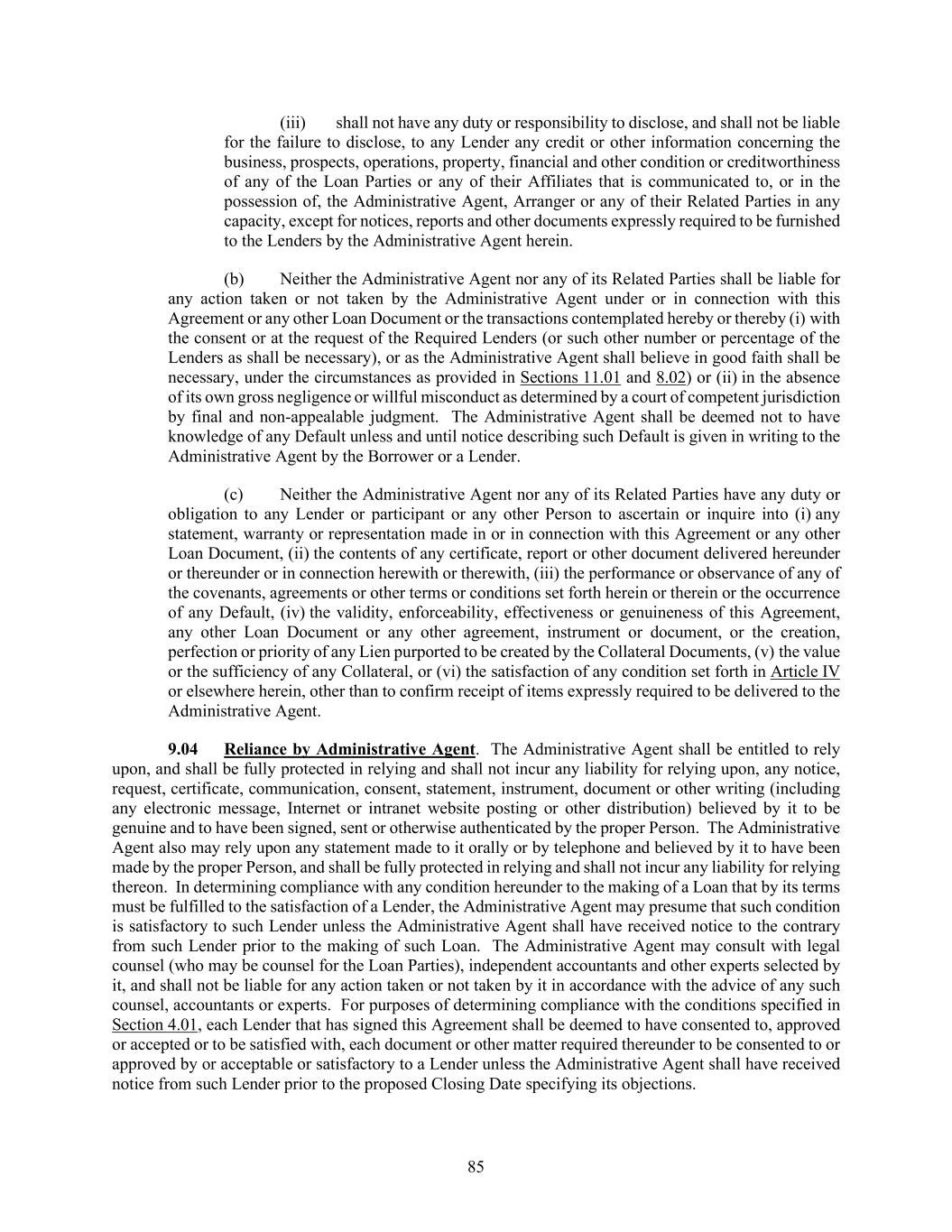 85 (iii) shall not have any duty or responsibility to disclose, and shall not be liable for the failure to disclose, to any Lender any credit or other information concerning the business, prospects, operations, property, financial and other condition or creditworthiness of any of the Loan Parties or any of their Affiliates that is communicated to, or in the possession of, the Administrative Agent, Arranger or any of their Related Parties in any capacity, except for notices, reports and other documents expressly required to be furnished to the Lenders by the Administrative Agent herein. (b) Neither the Administrative Agent nor any of its Related Parties shall be liable for any action taken or not taken by the Administrative Agent under or in connection with this Agreement or any other Loan Document or the transactions contemplated hereby or thereby (i) with the consent or at the request of the Required Lenders (or such other number or percentage of the Lenders as shall be necessary), or as the Administrative Agent shall believe in good faith shall be necessary, under the circumstances as provided in Sections 11.01 and 8.02) or (ii) in the absence of its own gross negligence or willful misconduct as determined by a court of competent jurisdiction by final and non-appealable judgment. The Administrative Agent shall be deemed not to have knowledge of any Default unless and until notice describing such Default is given in writing to the Administrative Agent by the Borrower or a Lender. (c) Neither the Administrative Agent nor any of its Related Parties have any duty or obligation to any Lender or participant or any other Person to ascertain or inquire into (i) any statement, warranty or representation made in or in connection with this Agreement or any other Loan Document, (ii) the contents of any certificate, report or other document delivered hereunder or thereunder or in connection herewith or therewith, (iii) the performance or observance of any of the covenants, agreements or other terms or conditions set forth herein or therein or the occurrence of any Default, (iv) the validity, enforceability, effectiveness or genuineness of this Agreement, any other Loan Document or any other agreement, instrument or document, or the creation, perfection or priority of any Lien purported to be created by the Collateral Documents, (v) the value or the sufficiency of any Collateral, or (vi) the satisfaction of any condition set forth in Article IV or elsewhere herein, other than to confirm receipt of items expressly required to be delivered to the Administrative Agent. 9.04 Reliance by Administrative Agent. The Administrative Agent shall be entitled to rely upon, and shall be fully protected in relying and shall not incur any liability for relying upon, any notice, request, certificate, communication, consent, statement, instrument, document or other writing (including any electronic message, Internet or intranet website posting or other distribution) believed by it to be genuine and to have been signed, sent or otherwise authenticated by the proper Person. The Administrative Agent also may rely upon any statement made to it orally or by telephone and believed by it to have been made by the proper Person, and shall be fully protected in relying and shall not incur any liability for relying thereon. In determining compliance with any condition hereunder to the making of a Loan that by its terms must be fulfilled to the satisfaction of a Lender, the Administrative Agent may presume that such condition is satisfactory to such Lender unless the Administrative Agent shall have received notice to the contrary from such Lender prior to the making of such Loan. The Administrative Agent may consult with legal counsel (who may be counsel for the Loan Parties), independent accountants and other experts selected by it, and shall not be liable for any action taken or not taken by it in accordance with the advice of any such counsel, accountants or experts. For purposes of determining compliance with the conditions specified in Section 4.01, each Lender that has signed this Agreement shall be deemed to have consented to, approved or accepted or to be satisfied with, each document or other matter required thereunder to be consented to or approved by or acceptable or satisfactory to a Lender unless the Administrative Agent shall have received notice from such Lender prior to the proposed Closing Date specifying its objections.
