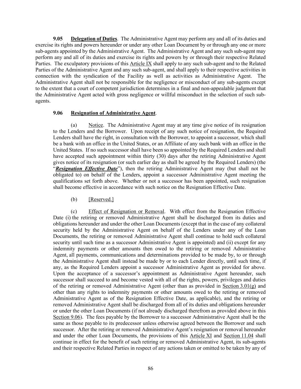 86 9.05 Delegation of Duties. The Administrative Agent may perform any and all of its duties and exercise its rights and powers hereunder or under any other Loan Document by or through any one or more sub-agents appointed by the Administrative Agent. The Administrative Agent and any such sub-agent may perform any and all of its duties and exercise its rights and powers by or through their respective Related Parties. The exculpatory provisions of this Article IX shall apply to any such sub-agent and to the Related Parties of the Administrative Agent and any such sub-agent, and shall apply to their respective activities in connection with the syndication of the Facility as well as activities as Administrative Agent. The Administrative Agent shall not be responsible for the negligence or misconduct of any sub-agents except to the extent that a court of competent jurisdiction determines in a final and non-appealable judgment that the Administrative Agent acted with gross negligence or willful misconduct in the selection of such sub- agents. 9.06 Resignation of Administrative Agent. (a) Notice. The Administrative Agent may at any time give notice of its resignation to the Lenders and the Borrower. Upon receipt of any such notice of resignation, the Required Lenders shall have the right, in consultation with the Borrower, to appoint a successor, which shall be a bank with an office in the United States, or an Affiliate of any such bank with an office in the United States. If no such successor shall have been so appointed by the Required Lenders and shall have accepted such appointment within thirty (30) days after the retiring Administrative Agent gives notice of its resignation (or such earlier day as shall be agreed by the Required Lenders) (the “Resignation Effective Date”), then the retiring Administrative Agent may (but shall not be obligated to) on behalf of the Lenders, appoint a successor Administrative Agent meeting the qualifications set forth above. Whether or not a successor has been appointed, such resignation shall become effective in accordance with such notice on the Resignation Effective Date. (b) [Reserved.] (c) Effect of Resignation or Removal. With effect from the Resignation Effective Date (i) the retiring or removed Administrative Agent shall be discharged from its duties and obligations hereunder and under the other Loan Documents (except that in the case of any collateral security held by the Administrative Agent on behalf of the Lenders under any of the Loan Documents, the retiring or removed Administrative Agent shall continue to hold such collateral security until such time as a successor Administrative Agent is appointed) and (ii) except for any indemnity payments or other amounts then owed to the retiring or removed Administrative Agent, all payments, communications and determinations provided to be made by, to or through the Administrative Agent shall instead be made by or to each Lender directly, until such time, if any, as the Required Lenders appoint a successor Administrative Agent as provided for above. Upon the acceptance of a successor’s appointment as Administrative Agent hereunder, such successor shall succeed to and become vested with all of the rights, powers, privileges and duties of the retiring or removed Administrative Agent (other than as provided in Section 3.01(g) and other than any rights to indemnity payments or other amounts owed to the retiring or removed Administrative Agent as of the Resignation Effective Date, as applicable), and the retiring or removed Administrative Agent shall be discharged from all of its duties and obligations hereunder or under the other Loan Documents (if not already discharged therefrom as provided above in this Section 9.06). The fees payable by the Borrower to a successor Administrative Agent shall be the same as those payable to its predecessor unless otherwise agreed between the Borrower and such successor. After the retiring or removed Administrative Agent’s resignation or removal hereunder and under the other Loan Documents, the provisions of this Article XI and Section 11.04 shall continue in effect for the benefit of such retiring or removed Administrative Agent, its sub-agents and their respective Related Parties in respect of any actions taken or omitted to be taken by any of