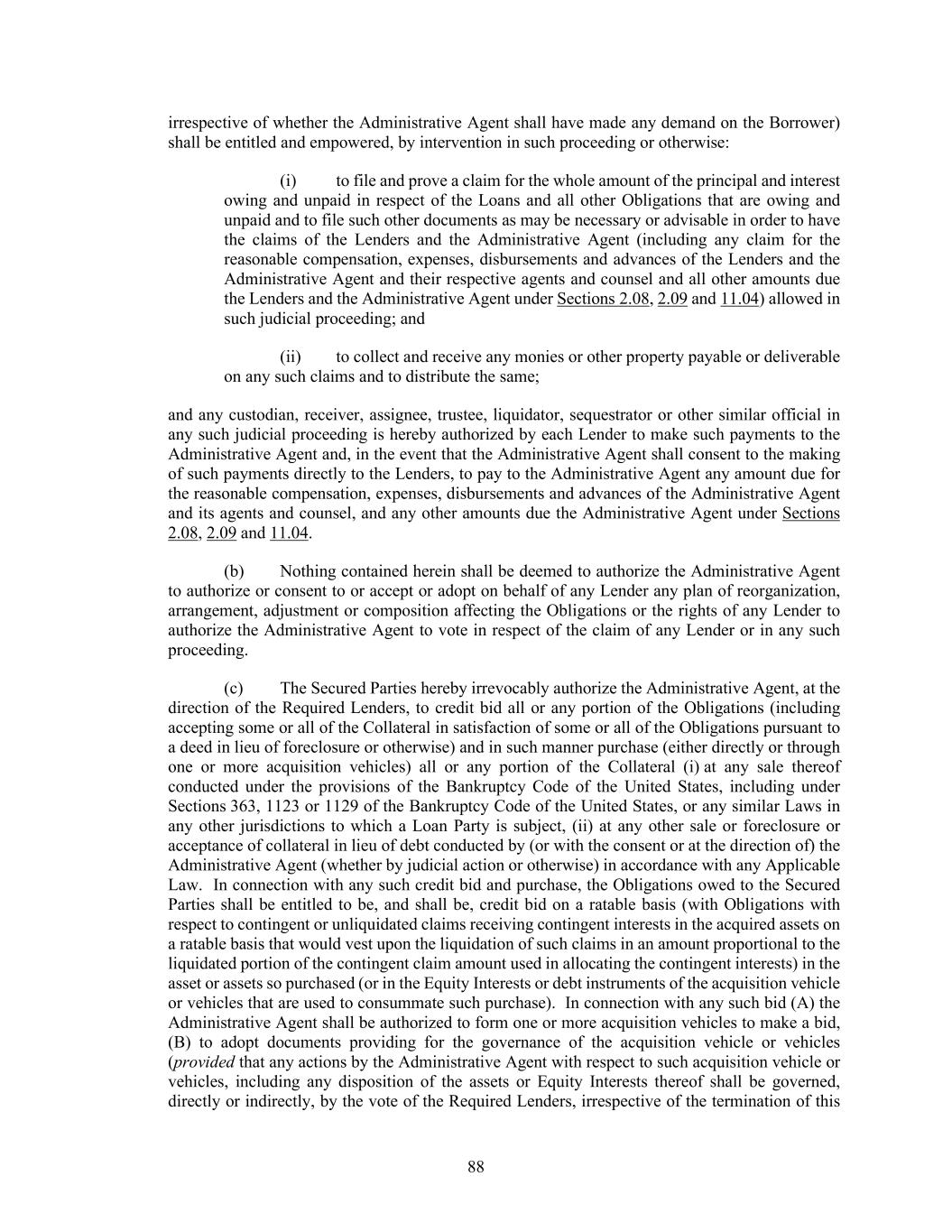 88 irrespective of whether the Administrative Agent shall have made any demand on the Borrower) shall be entitled and empowered, by intervention in such proceeding or otherwise: (i) to file and prove a claim for the whole amount of the principal and interest owing and unpaid in respect of the Loans and all other Obligations that are owing and unpaid and to file such other documents as may be necessary or advisable in order to have the claims of the Lenders and the Administrative Agent (including any claim for the reasonable compensation, expenses, disbursements and advances of the Lenders and the Administrative Agent and their respective agents and counsel and all other amounts due the Lenders and the Administrative Agent under Sections 2.08, 2.09 and 11.04) allowed in such judicial proceeding; and (ii) to collect and receive any monies or other property payable or deliverable on any such claims and to distribute the same; and any custodian, receiver, assignee, trustee, liquidator, sequestrator or other similar official in any such judicial proceeding is hereby authorized by each Lender to make such payments to the Administrative Agent and, in the event that the Administrative Agent shall consent to the making of such payments directly to the Lenders, to pay to the Administrative Agent any amount due for the reasonable compensation, expenses, disbursements and advances of the Administrative Agent and its agents and counsel, and any other amounts due the Administrative Agent under Sections 2.08, 2.09 and 11.04. (b) Nothing contained herein shall be deemed to authorize the Administrative Agent to authorize or consent to or accept or adopt on behalf of any Lender any plan of reorganization, arrangement, adjustment or composition affecting the Obligations or the rights of any Lender to authorize the Administrative Agent to vote in respect of the claim of any Lender or in any such proceeding. (c) The Secured Parties hereby irrevocably authorize the Administrative Agent, at the direction of the Required Lenders, to credit bid all or any portion of the Obligations (including accepting some or all of the Collateral in satisfaction of some or all of the Obligations pursuant to a deed in lieu of foreclosure or otherwise) and in such manner purchase (either directly or through one or more acquisition vehicles) all or any portion of the Collateral (i) at any sale thereof conducted under the provisions of the Bankruptcy Code of the United States, including under Sections 363, 1123 or 1129 of the Bankruptcy Code of the United States, or any similar Laws in any other jurisdictions to which a Loan Party is subject, (ii) at any other sale or foreclosure or acceptance of collateral in lieu of debt conducted by (or with the consent or at the direction of) the Administrative Agent (whether by judicial action or otherwise) in accordance with any Applicable Law. In connection with any such credit bid and purchase, the Obligations owed to the Secured Parties shall be entitled to be, and shall be, credit bid on a ratable basis (with Obligations with respect to contingent or unliquidated claims receiving contingent interests in the acquired assets on a ratable basis that would vest upon the liquidation of such claims in an amount proportional to the liquidated portion of the contingent claim amount used in allocating the contingent interests) in the asset or assets so purchased (or in the Equity Interests or debt instruments of the acquisition vehicle or vehicles that are used to consummate such purchase). In connection with any such bid (A) the Administrative Agent shall be authorized to form one or more acquisition vehicles to make a bid, (B) to adopt documents providing for the governance of the acquisition vehicle or vehicles (provided that any actions by the Administrative Agent with respect to such acquisition vehicle or vehicles, including any disposition of the assets or Equity Interests thereof shall be governed, directly or indirectly, by the vote of the Required Lenders, irrespective of the termination of this