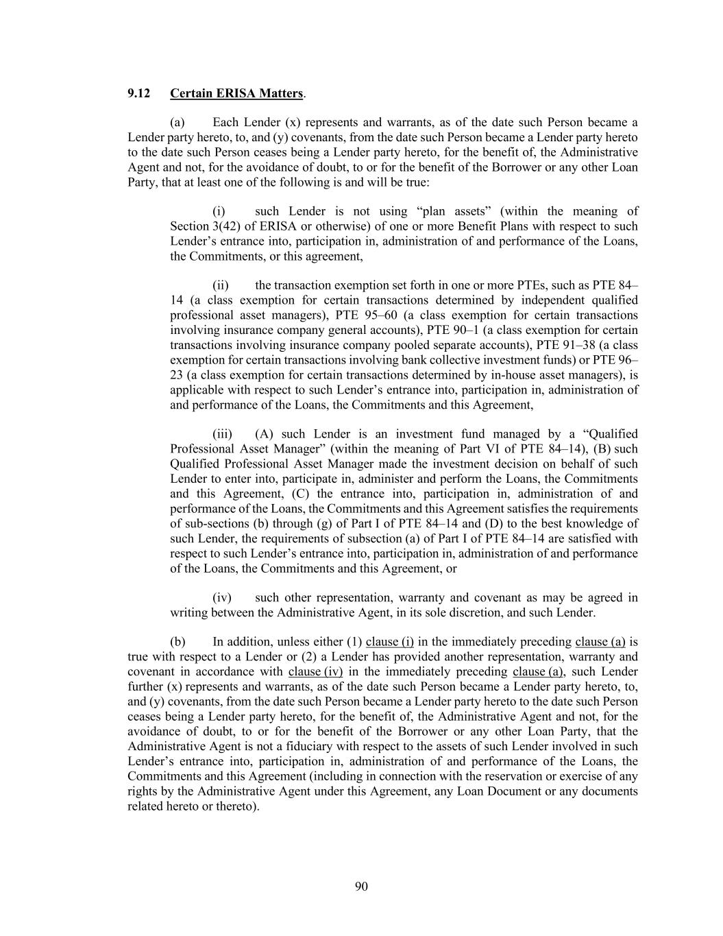 90 9.12 Certain ERISA Matters. (a) Each Lender (x) represents and warrants, as of the date such Person became a Lender party hereto, to, and (y) covenants, from the date such Person became a Lender party hereto to the date such Person ceases being a Lender party hereto, for the benefit of, the Administrative Agent and not, for the avoidance of doubt, to or for the benefit of the Borrower or any other Loan Party, that at least one of the following is and will be true: (i) such Lender is not using “plan assets” (within the meaning of Section 3(42) of ERISA or otherwise) of one or more Benefit Plans with respect to such Lender’s entrance into, participation in, administration of and performance of the Loans, the Commitments, or this agreement, (ii) the transaction exemption set forth in one or more PTEs, such as PTE 84– 14 (a class exemption for certain transactions determined by independent qualified professional asset managers), PTE 95–60 (a class exemption for certain transactions involving insurance company general accounts), PTE 90–1 (a class exemption for certain transactions involving insurance company pooled separate accounts), PTE 91–38 (a class exemption for certain transactions involving bank collective investment funds) or PTE 96– 23 (a class exemption for certain transactions determined by in-house asset managers), is applicable with respect to such Lender’s entrance into, participation in, administration of and performance of the Loans, the Commitments and this Agreement, (iii) (A) such Lender is an investment fund managed by a “Qualified Professional Asset Manager” (within the meaning of Part VI of PTE 84–14), (B) such Qualified Professional Asset Manager made the investment decision on behalf of such Lender to enter into, participate in, administer and perform the Loans, the Commitments and this Agreement, (C) the entrance into, participation in, administration of and performance of the Loans, the Commitments and this Agreement satisfies the requirements of sub-sections (b) through (g) of Part I of PTE 84–14 and (D) to the best knowledge of such Lender, the requirements of subsection (a) of Part I of PTE 84–14 are satisfied with respect to such Lender’s entrance into, participation in, administration of and performance of the Loans, the Commitments and this Agreement, or (iv) such other representation, warranty and covenant as may be agreed in writing between the Administrative Agent, in its sole discretion, and such Lender. (b) In addition, unless either (1) clause (i) in the immediately preceding clause (a) is true with respect to a Lender or (2) a Lender has provided another representation, warranty and covenant in accordance with clause (iv) in the immediately preceding clause (a), such Lender further (x) represents and warrants, as of the date such Person became a Lender party hereto, to, and (y) covenants, from the date such Person became a Lender party hereto to the date such Person ceases being a Lender party hereto, for the benefit of, the Administrative Agent and not, for the avoidance of doubt, to or for the benefit of the Borrower or any other Loan Party, that the Administrative Agent is not a fiduciary with respect to the assets of such Lender involved in such Lender’s entrance into, participation in, administration of and performance of the Loans, the Commitments and this Agreement (including in connection with the reservation or exercise of any rights by the Administrative Agent under this Agreement, any Loan Document or any documents related hereto or thereto).