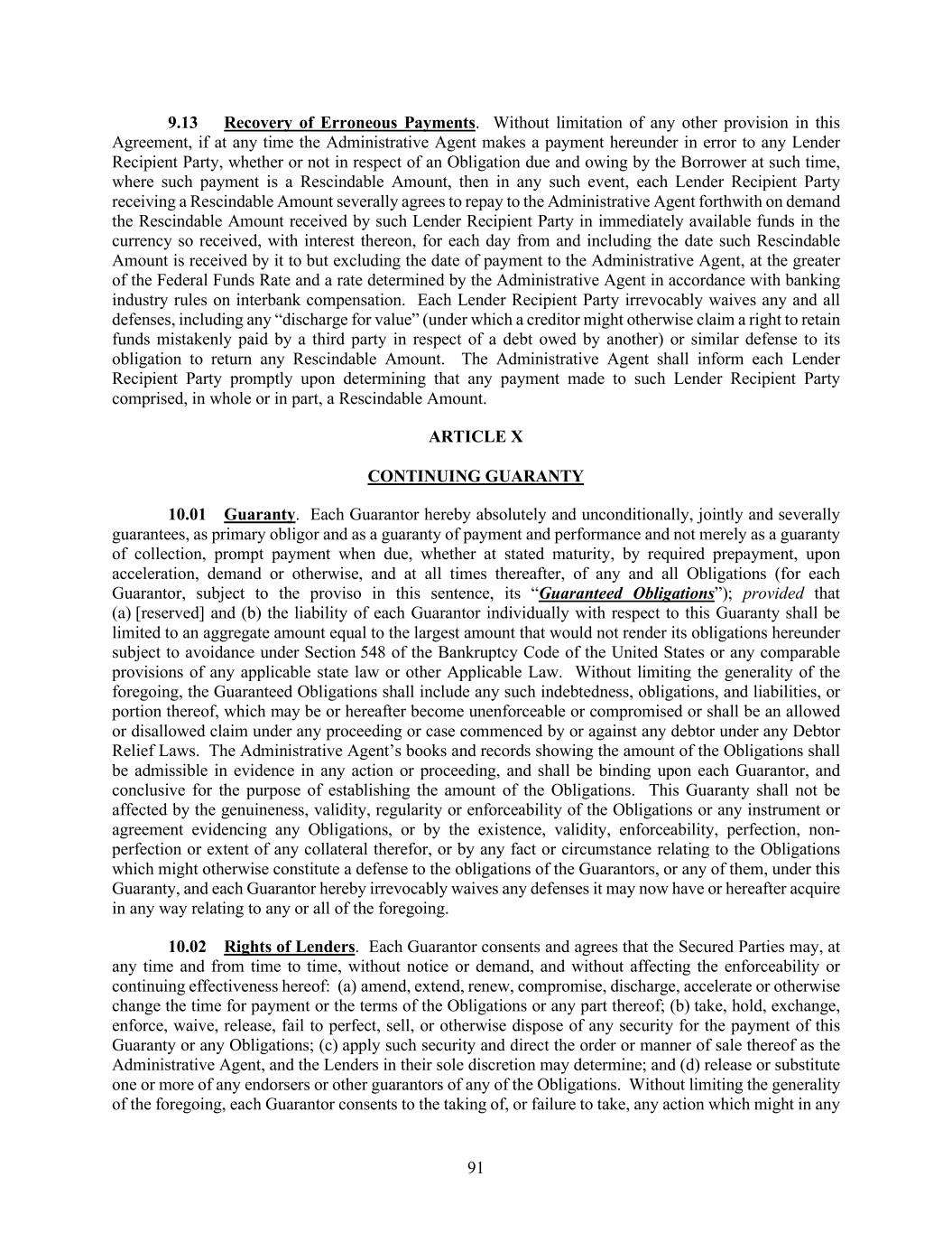 91 9.13 Recovery of Erroneous Payments. Without limitation of any other provision in this Agreement, if at any time the Administrative Agent makes a payment hereunder in error to any Lender Recipient Party, whether or not in respect of an Obligation due and owing by the Borrower at such time, where such payment is a Rescindable Amount, then in any such event, each Lender Recipient Party receiving a Rescindable Amount severally agrees to repay to the Administrative Agent forthwith on demand the Rescindable Amount received by such Lender Recipient Party in immediately available funds in the currency so received, with interest thereon, for each day from and including the date such Rescindable Amount is received by it to but excluding the date of payment to the Administrative Agent, at the greater of the Federal Funds Rate and a rate determined by the Administrative Agent in accordance with banking industry rules on interbank compensation. Each Lender Recipient Party irrevocably waives any and all defenses, including any “discharge for value” (under which a creditor might otherwise claim a right to retain funds mistakenly paid by a third party in respect of a debt owed by another) or similar defense to its obligation to return any Rescindable Amount. The Administrative Agent shall inform each Lender Recipient Party promptly upon determining that any payment made to such Lender Recipient Party comprised, in whole or in part, a Rescindable Amount. ARTICLE X CONTINUING GUARANTY 10.01 Guaranty. Each Guarantor hereby absolutely and unconditionally, jointly and severally guarantees, as primary obligor and as a guaranty of payment and performance and not merely as a guaranty of collection, prompt payment when due, whether at stated maturity, by required prepayment, upon acceleration, demand or otherwise, and at all times thereafter, of any and all Obligations (for each Guarantor, subject to the proviso in this sentence, its “Guaranteed Obligations”); provided that (a) [reserved] and (b) the liability of each Guarantor individually with respect to this Guaranty shall be limited to an aggregate amount equal to the largest amount that would not render its obligations hereunder subject to avoidance under Section 548 of the Bankruptcy Code of the United States or any comparable provisions of any applicable state law or other Applicable Law. Without limiting the generality of the foregoing, the Guaranteed Obligations shall include any such indebtedness, obligations, and liabilities, or portion thereof, which may be or hereafter become unenforceable or compromised or shall be an allowed or disallowed claim under any proceeding or case commenced by or against any debtor under any Debtor Relief Laws. The Administrative Agent’s books and records showing the amount of the Obligations shall be admissible in evidence in any action or proceeding, and shall be binding upon each Guarantor, and conclusive for the purpose of establishing the amount of the Obligations. This Guaranty shall not be affected by the genuineness, validity, regularity or enforceability of the Obligations or any instrument or agreement evidencing any Obligations, or by the existence, validity, enforceability, perfection, non- perfection or extent of any collateral therefor, or by any fact or circumstance relating to the Obligations which might otherwise constitute a defense to the obligations of the Guarantors, or any of them, under this Guaranty, and each Guarantor hereby irrevocably waives any defenses it may now have or hereafter acquire in any way relating to any or all of the foregoing. 10.02 Rights of Lenders. Each Guarantor consents and agrees that the Secured Parties may, at any time and from time to time, without notice or demand, and without affecting the enforceability or continuing effectiveness hereof: (a) amend, extend, renew, compromise, discharge, accelerate or otherwise change the time for payment or the terms of the Obligations or any part thereof; (b) take, hold, exchange, enforce, waive, release, fail to perfect, sell, or otherwise dispose of any security for the payment of this Guaranty or any Obligations; (c) apply such security and direct the order or manner of sale thereof as the Administrative Agent, and the Lenders in their sole discretion may determine; and (d) release or substitute one or more of any endorsers or other guarantors of any of the Obligations. Without limiting the generality of the foregoing, each Guarantor consents to the taking of, or failure to take, any action which might in any