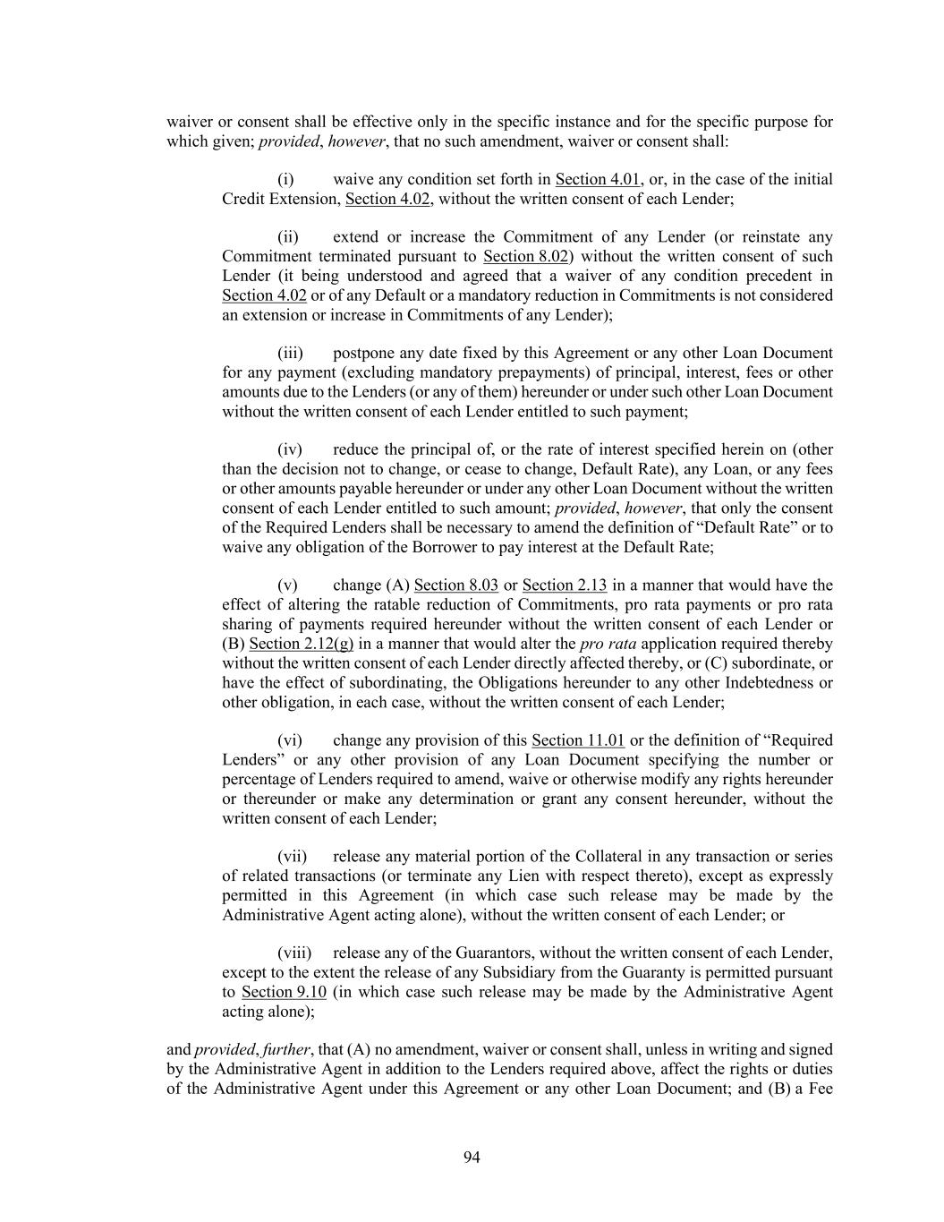 94 waiver or consent shall be effective only in the specific instance and for the specific purpose for which given; provided, however, that no such amendment, waiver or consent shall: (i) waive any condition set forth in Section 4.01, or, in the case of the initial Credit Extension, Section 4.02, without the written consent of each Lender; (ii) extend or increase the Commitment of any Lender (or reinstate any Commitment terminated pursuant to Section 8.02) without the written consent of such Lender (it being understood and agreed that a waiver of any condition precedent in Section 4.02 or of any Default or a mandatory reduction in Commitments is not considered an extension or increase in Commitments of any Lender); (iii) postpone any date fixed by this Agreement or any other Loan Document for any payment (excluding mandatory prepayments) of principal, interest, fees or other amounts due to the Lenders (or any of them) hereunder or under such other Loan Document without the written consent of each Lender entitled to such payment; (iv) reduce the principal of, or the rate of interest specified herein on (other than the decision not to change, or cease to change, Default Rate), any Loan, or any fees or other amounts payable hereunder or under any other Loan Document without the written consent of each Lender entitled to such amount; provided, however, that only the consent of the Required Lenders shall be necessary to amend the definition of “Default Rate” or to waive any obligation of the Borrower to pay interest at the Default Rate; (v) change (A) Section 8.03 or Section 2.13 in a manner that would have the effect of altering the ratable reduction of Commitments, pro rata payments or pro rata sharing of payments required hereunder without the written consent of each Lender or (B) Section 2.12(g) in a manner that would alter the pro rata application required thereby without the written consent of each Lender directly affected thereby, or (C) subordinate, or have the effect of subordinating, the Obligations hereunder to any other Indebtedness or other obligation, in each case, without the written consent of each Lender; (vi) change any provision of this Section 11.01 or the definition of “Required Lenders” or any other provision of any Loan Document specifying the number or percentage of Lenders required to amend, waive or otherwise modify any rights hereunder or thereunder or make any determination or grant any consent hereunder, without the written consent of each Lender; (vii) release any material portion of the Collateral in any transaction or series of related transactions (or terminate any Lien with respect thereto), except as expressly permitted in this Agreement (in which case such release may be made by the Administrative Agent acting alone), without the written consent of each Lender; or (viii) release any of the Guarantors, without the written consent of each Lender, except to the extent the release of any Subsidiary from the Guaranty is permitted pursuant to Section 9.10 (in which case such release may be made by the Administrative Agent acting alone); and provided, further, that (A) no amendment, waiver or consent shall, unless in writing and signed by the Administrative Agent in addition to the Lenders required above, affect the rights or duties of the Administrative Agent under this Agreement or any other Loan Document; and (B) a Fee