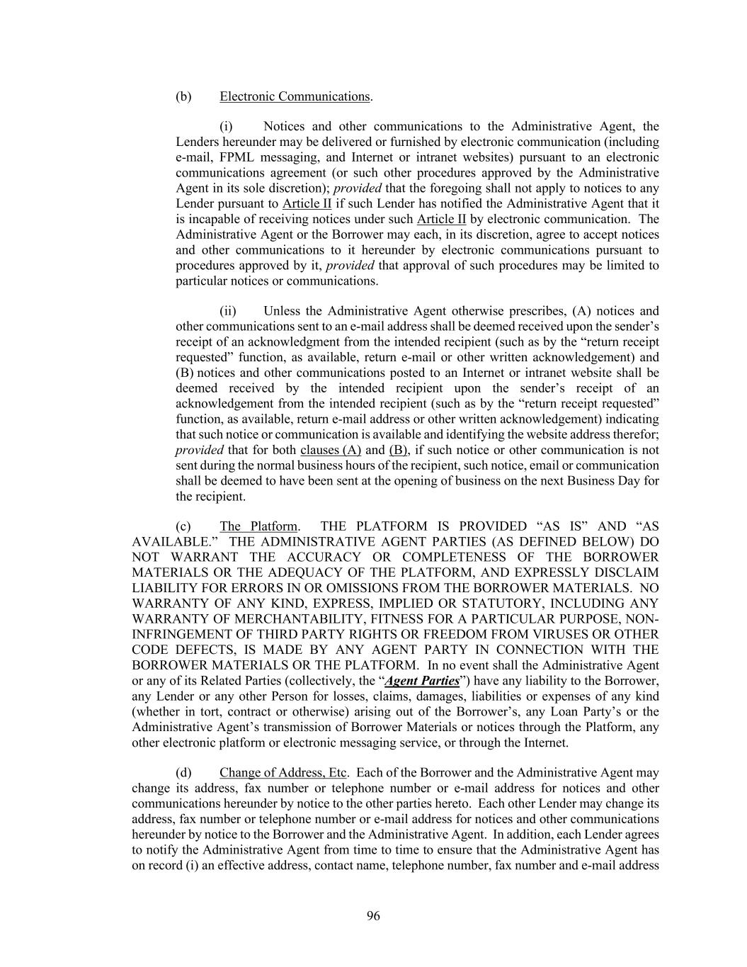 96 (b) Electronic Communications. (i) Notices and other communications to the Administrative Agent, the Lenders hereunder may be delivered or furnished by electronic communication (including e-mail, FPML messaging, and Internet or intranet websites) pursuant to an electronic communications agreement (or such other procedures approved by the Administrative Agent in its sole discretion); provided that the foregoing shall not apply to notices to any Lender pursuant to Article II if such Lender has notified the Administrative Agent that it is incapable of receiving notices under such Article II by electronic communication. The Administrative Agent or the Borrower may each, in its discretion, agree to accept notices and other communications to it hereunder by electronic communications pursuant to procedures approved by it, provided that approval of such procedures may be limited to particular notices or communications. (ii) Unless the Administrative Agent otherwise prescribes, (A) notices and other communications sent to an e-mail address shall be deemed received upon the sender’s receipt of an acknowledgment from the intended recipient (such as by the “return receipt requested” function, as available, return e-mail or other written acknowledgement) and (B) notices and other communications posted to an Internet or intranet website shall be deemed received by the intended recipient upon the sender’s receipt of an acknowledgement from the intended recipient (such as by the “return receipt requested” function, as available, return e-mail address or other written acknowledgement) indicating that such notice or communication is available and identifying the website address therefor; provided that for both clauses (A) and (B), if such notice or other communication is not sent during the normal business hours of the recipient, such notice, email or communication shall be deemed to have been sent at the opening of business on the next Business Day for the recipient. (c) The Platform. THE PLATFORM IS PROVIDED “AS IS” AND “AS AVAILABLE.” THE ADMINISTRATIVE AGENT PARTIES (AS DEFINED BELOW) DO NOT WARRANT THE ACCURACY OR COMPLETENESS OF THE BORROWER MATERIALS OR THE ADEQUACY OF THE PLATFORM, AND EXPRESSLY DISCLAIM LIABILITY FOR ERRORS IN OR OMISSIONS FROM THE BORROWER MATERIALS. NO WARRANTY OF ANY KIND, EXPRESS, IMPLIED OR STATUTORY, INCLUDING ANY WARRANTY OF MERCHANTABILITY, FITNESS FOR A PARTICULAR PURPOSE, NON- INFRINGEMENT OF THIRD PARTY RIGHTS OR FREEDOM FROM VIRUSES OR OTHER CODE DEFECTS, IS MADE BY ANY AGENT PARTY IN CONNECTION WITH THE BORROWER MATERIALS OR THE PLATFORM. In no event shall the Administrative Agent or any of its Related Parties (collectively, the “Agent Parties”) have any liability to the Borrower, any Lender or any other Person for losses, claims, damages, liabilities or expenses of any kind (whether in tort, contract or otherwise) arising out of the Borrower’s, any Loan Party’s or the Administrative Agent’s transmission of Borrower Materials or notices through the Platform, any other electronic platform or electronic messaging service, or through the Internet. (d) Change of Address, Etc. Each of the Borrower and the Administrative Agent may change its address, fax number or telephone number or e-mail address for notices and other communications hereunder by notice to the other parties hereto. Each other Lender may change its address, fax number or telephone number or e-mail address for notices and other communications hereunder by notice to the Borrower and the Administrative Agent. In addition, each Lender agrees to notify the Administrative Agent from time to time to ensure that the Administrative Agent has on record (i) an effective address, contact name, telephone number, fax number and e-mail address