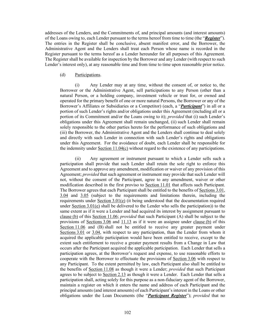 102 addresses of the Lenders, and the Commitments of, and principal amounts (and interest amounts) of the Loans owing to, each Lender pursuant to the terms hereof from time to time (the “Register”). The entries in the Register shall be conclusive, absent manifest error, and the Borrower, the Administrative Agent and the Lenders shall treat each Person whose name is recorded in the Register pursuant to the terms hereof as a Lender hereunder for all purposes of this Agreement. The Register shall be available for inspection by the Borrower and any Lender (with respect to such Lender’s interest only), at any reasonable time and from time to time upon reasonable prior notice. (d) Participations. (i) Any Lender may at any time, without the consent of, or notice to, the Borrower or the Administrative Agent, sell participations to any Person (other than a natural Person, or a holding company, investment vehicle or trust for, or owned and operated for the primary benefit of one or more natural Persons, the Borrower or any of the Borrower’s Affiliates or Subsidiaries or a Competitor) (each, a “Participant”) in all or a portion of such Lender’s rights and/or obligations under this Agreement (including all or a portion of its Commitment and/or the Loans owing to it); provided that (i) such Lender’s obligations under this Agreement shall remain unchanged, (ii) such Lender shall remain solely responsible to the other parties hereto for the performance of such obligations and (iii) the Borrower, the Administrative Agent and the Lenders shall continue to deal solely and directly with such Lender in connection with such Lender’s rights and obligations under this Agreement. For the avoidance of doubt, each Lender shall be responsible for the indemnity under Section 11.04(c) without regard to the existence of any participations. (ii) Any agreement or instrument pursuant to which a Lender sells such a participation shall provide that such Lender shall retain the sole right to enforce this Agreement and to approve any amendment, modification or waiver of any provision of this Agreement; provided that such agreement or instrument may provide that such Lender will not, without the consent of the Participant, agree to any amendment, waiver or other modification described in the first proviso to Section 11.01 that affects such Participant. The Borrower agrees that each Participant shall be entitled to the benefits of Sections 3.01, 3.04 and 3.05 (subject to the requirements and limitations therein, including the requirements under Section 3.01(e) (it being understood that the documentation required under Section 3.01(e) shall be delivered to the Lender who sells the participation)) to the same extent as if it were a Lender and had acquired its interest by assignment pursuant to clause (b) of this Section 11.06; provided that such Participant (A) shall be subject to the provisions of Sections 3.06 and 11.13 as if it were an assignee under clause (b) of this Section 11.06 and (B) shall not be entitled to receive any greater payment under Sections 3.01 or 3.04, with respect to any participation, than the Lender from whom it acquired the applicable participation would have been entitled to receive, except to the extent such entitlement to receive a greater payment results from a Change in Law that occurs after the Participant acquired the applicable participation. Each Lender that sells a participation agrees, at the Borrower’s request and expense, to use reasonable efforts to cooperate with the Borrower to effectuate the provisions of Section 3.06 with respect to any Participant. To the extent permitted by law, each Participant also shall be entitled to the benefits of Section 11.08 as though it were a Lender; provided that such Participant agrees to be subject to Section 2.13 as though it were a Lender. Each Lender that sells a participation shall, acting solely for this purpose as a non-fiduciary agent of the Borrower, maintain a register on which it enters the name and address of each Participant and the principal amounts (and interest amounts) of each Participant’s interest in the Loans or other obligations under the Loan Documents (the “Participant Register”); provided that no