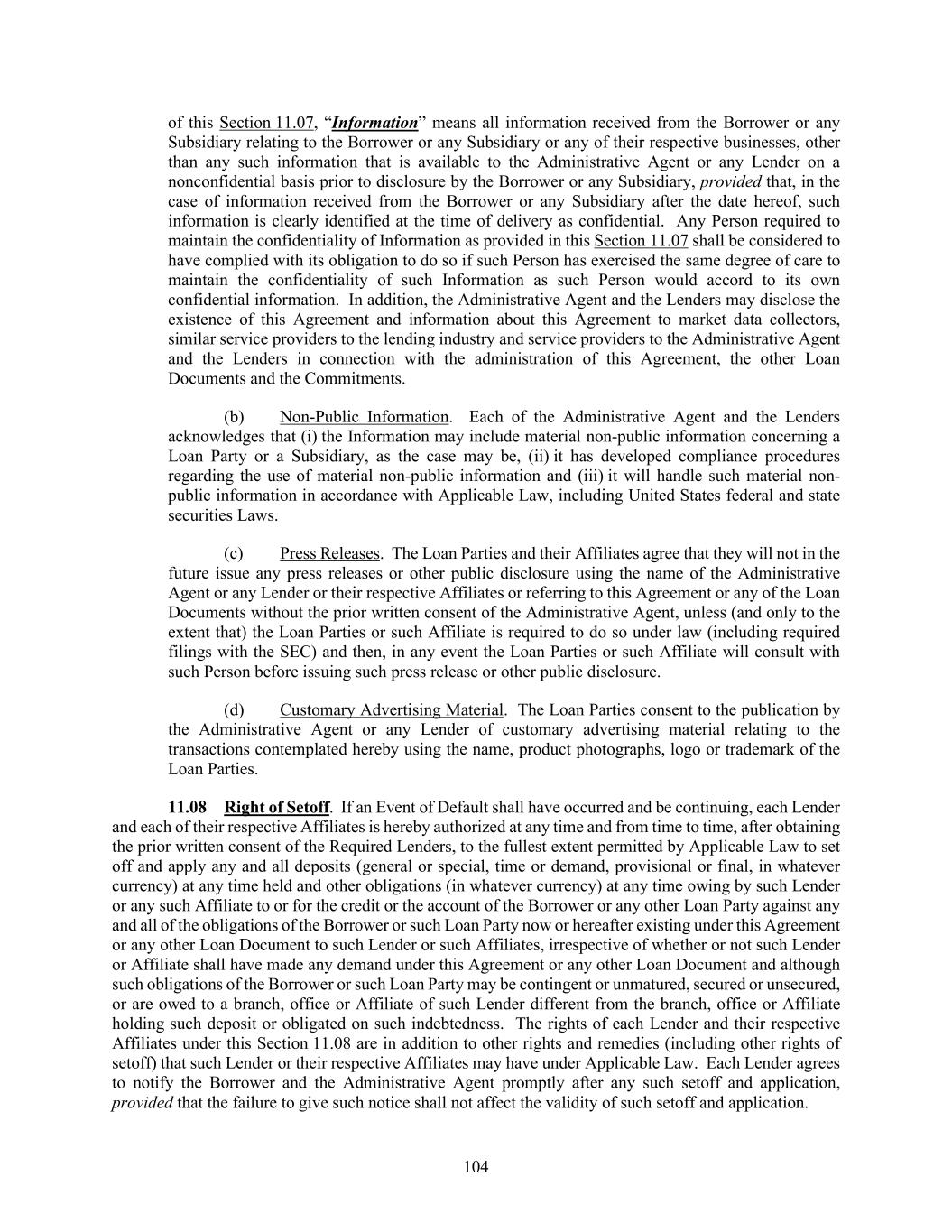 104 of this Section 11.07, “Information” means all information received from the Borrower or any Subsidiary relating to the Borrower or any Subsidiary or any of their respective businesses, other than any such information that is available to the Administrative Agent or any Lender on a nonconfidential basis prior to disclosure by the Borrower or any Subsidiary, provided that, in the case of information received from the Borrower or any Subsidiary after the date hereof, such information is clearly identified at the time of delivery as confidential. Any Person required to maintain the confidentiality of Information as provided in this Section 11.07 shall be considered to have complied with its obligation to do so if such Person has exercised the same degree of care to maintain the confidentiality of such Information as such Person would accord to its own confidential information. In addition, the Administrative Agent and the Lenders may disclose the existence of this Agreement and information about this Agreement to market data collectors, similar service providers to the lending industry and service providers to the Administrative Agent and the Lenders in connection with the administration of this Agreement, the other Loan Documents and the Commitments. (b) Non-Public Information. Each of the Administrative Agent and the Lenders acknowledges that (i) the Information may include material non-public information concerning a Loan Party or a Subsidiary, as the case may be, (ii) it has developed compliance procedures regarding the use of material non-public information and (iii) it will handle such material non- public information in accordance with Applicable Law, including United States federal and state securities Laws. (c) Press Releases. The Loan Parties and their Affiliates agree that they will not in the future issue any press releases or other public disclosure using the name of the Administrative Agent or any Lender or their respective Affiliates or referring to this Agreement or any of the Loan Documents without the prior written consent of the Administrative Agent, unless (and only to the extent that) the Loan Parties or such Affiliate is required to do so under law (including required filings with the SEC) and then, in any event the Loan Parties or such Affiliate will consult with such Person before issuing such press release or other public disclosure. (d) Customary Advertising Material. The Loan Parties consent to the publication by the Administrative Agent or any Lender of customary advertising material relating to the transactions contemplated hereby using the name, product photographs, logo or trademark of the Loan Parties. 11.08 Right of Setoff. If an Event of Default shall have occurred and be continuing, each Lender and each of their respective Affiliates is hereby authorized at any time and from time to time, after obtaining the prior written consent of the Required Lenders, to the fullest extent permitted by Applicable Law to set off and apply any and all deposits (general or special, time or demand, provisional or final, in whatever currency) at any time held and other obligations (in whatever currency) at any time owing by such Lender or any such Affiliate to or for the credit or the account of the Borrower or any other Loan Party against any and all of the obligations of the Borrower or such Loan Party now or hereafter existing under this Agreement or any other Loan Document to such Lender or such Affiliates, irrespective of whether or not such Lender or Affiliate shall have made any demand under this Agreement or any other Loan Document and although such obligations of the Borrower or such Loan Party may be contingent or unmatured, secured or unsecured, or are owed to a branch, office or Affiliate of such Lender different from the branch, office or Affiliate holding such deposit or obligated on such indebtedness. The rights of each Lender and their respective Affiliates under this Section 11.08 are in addition to other rights and remedies (including other rights of setoff) that such Lender or their respective Affiliates may have under Applicable Law. Each Lender agrees to notify the Borrower and the Administrative Agent promptly after any such setoff and application, provided that the failure to give such notice shall not affect the validity of such setoff and application.