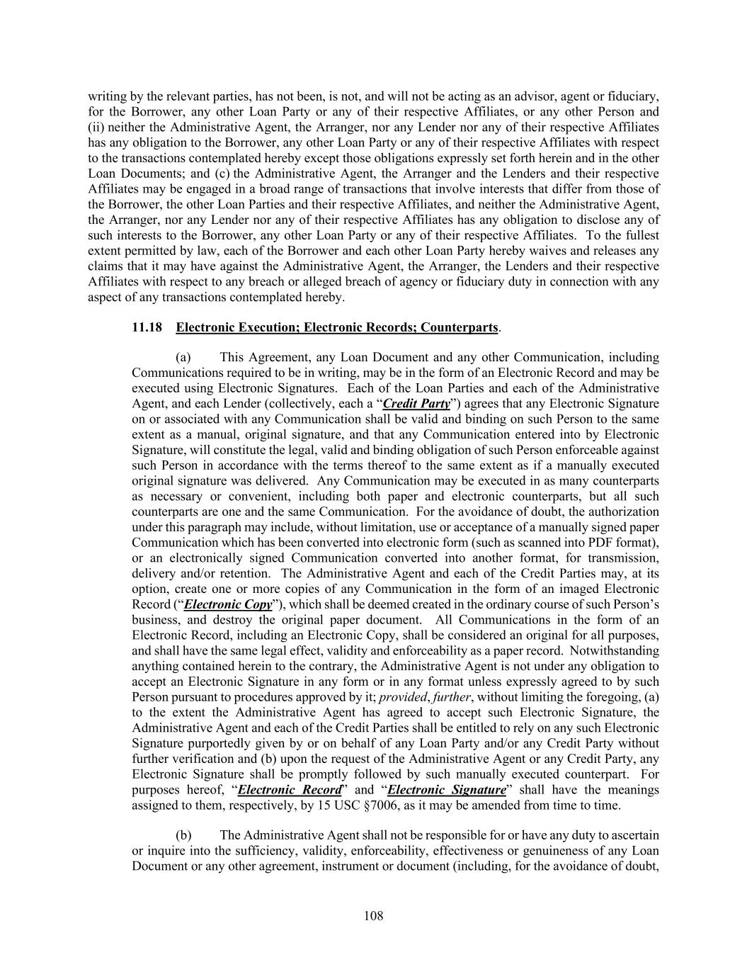 108 writing by the relevant parties, has not been, is not, and will not be acting as an advisor, agent or fiduciary, for the Borrower, any other Loan Party or any of their respective Affiliates, or any other Person and (ii) neither the Administrative Agent, the Arranger, nor any Lender nor any of their respective Affiliates has any obligation to the Borrower, any other Loan Party or any of their respective Affiliates with respect to the transactions contemplated hereby except those obligations expressly set forth herein and in the other Loan Documents; and (c) the Administrative Agent, the Arranger and the Lenders and their respective Affiliates may be engaged in a broad range of transactions that involve interests that differ from those of the Borrower, the other Loan Parties and their respective Affiliates, and neither the Administrative Agent, the Arranger, nor any Lender nor any of their respective Affiliates has any obligation to disclose any of such interests to the Borrower, any other Loan Party or any of their respective Affiliates. To the fullest extent permitted by law, each of the Borrower and each other Loan Party hereby waives and releases any claims that it may have against the Administrative Agent, the Arranger, the Lenders and their respective Affiliates with respect to any breach or alleged breach of agency or fiduciary duty in connection with any aspect of any transactions contemplated hereby. 11.18 Electronic Execution; Electronic Records; Counterparts. (a) This Agreement, any Loan Document and any other Communication, including Communications required to be in writing, may be in the form of an Electronic Record and may be executed using Electronic Signatures. Each of the Loan Parties and each of the Administrative Agent, and each Lender (collectively, each a “Credit Party”) agrees that any Electronic Signature on or associated with any Communication shall be valid and binding on such Person to the same extent as a manual, original signature, and that any Communication entered into by Electronic Signature, will constitute the legal, valid and binding obligation of such Person enforceable against such Person in accordance with the terms thereof to the same extent as if a manually executed original signature was delivered. Any Communication may be executed in as many counterparts as necessary or convenient, including both paper and electronic counterparts, but all such counterparts are one and the same Communication. For the avoidance of doubt, the authorization under this paragraph may include, without limitation, use or acceptance of a manually signed paper Communication which has been converted into electronic form (such as scanned into PDF format), or an electronically signed Communication converted into another format, for transmission, delivery and/or retention. The Administrative Agent and each of the Credit Parties may, at its option, create one or more copies of any Communication in the form of an imaged Electronic Record (“Electronic Copy”), which shall be deemed created in the ordinary course of such Person’s business, and destroy the original paper document. All Communications in the form of an Electronic Record, including an Electronic Copy, shall be considered an original for all purposes, and shall have the same legal effect, validity and enforceability as a paper record. Notwithstanding anything contained herein to the contrary, the Administrative Agent is not under any obligation to accept an Electronic Signature in any form or in any format unless expressly agreed to by such Person pursuant to procedures approved by it; provided, further, without limiting the foregoing, (a) to the extent the Administrative Agent has agreed to accept such Electronic Signature, the Administrative Agent and each of the Credit Parties shall be entitled to rely on any such Electronic Signature purportedly given by or on behalf of any Loan Party and/or any Credit Party without further verification and (b) upon the request of the Administrative Agent or any Credit Party, any Electronic Signature shall be promptly followed by such manually executed counterpart. For purposes hereof, “Electronic Record” and “Electronic Signature” shall have the meanings assigned to them, respectively, by 15 USC §7006, as it may be amended from time to time. (b) The Administrative Agent shall not be responsible for or have any duty to ascertain or inquire into the sufficiency, validity, enforceability, effectiveness or genuineness of any Loan Document or any other agreement, instrument or document (including, for the avoidance of doubt,
