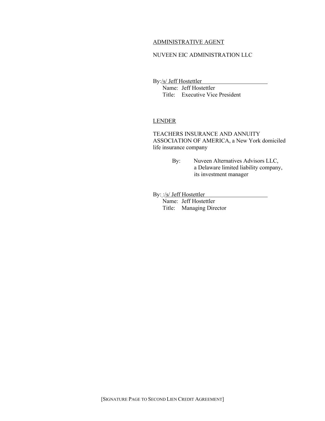 [SIGNATURE PAGE TO SECOND LIEN CREDIT AGREEMENT] ADMINISTRATIVE AGENT NUVEEN EIC ADMINISTRATION LLC By:/s/ Jeff Hostettler Name: Jeff Hostettler Title: Executive Vice President LENDER TEACHERS INSURANCE AND ANNUITY ASSOCIATION OF AMERICA, a New York domiciled life insurance company By: Nuveen Alternatives Advisors LLC, a Delaware limited liability company, its investment manager By: :/s/ Jeff Hostettler Name: Jeff Hostettler Title: Managing Director