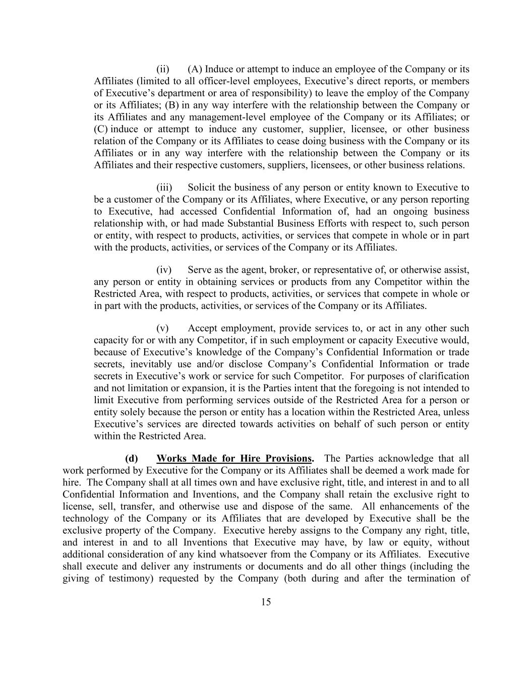 15 (ii) (A) Induce or attempt to induce an employee of the Company or its Affiliates (limited to all officer-level employees, Executive’s direct reports, or members of Executive’s department or area of responsibility) to leave the employ of the Company or its Affiliates; (B) in any way interfere with the relationship between the Company or its Affiliates and any management-level employee of the Company or its Affiliates; or (C) induce or attempt to induce any customer, supplier, licensee, or other business relation of the Company or its Affiliates to cease doing business with the Company or its Affiliates or in any way interfere with the relationship between the Company or its Affiliates and their respective customers, suppliers, licensees, or other business relations. (iii) Solicit the business of any person or entity known to Executive to be a customer of the Company or its Affiliates, where Executive, or any person reporting to Executive, had accessed Confidential Information of, had an ongoing business relationship with, or had made Substantial Business Efforts with respect to, such person or entity, with respect to products, activities, or services that compete in whole or in part with the products, activities, or services of the Company or its Affiliates. (iv) Serve as the agent, broker, or representative of, or otherwise assist, any person or entity in obtaining services or products from any Competitor within the Restricted Area, with respect to products, activities, or services that compete in whole or in part with the products, activities, or services of the Company or its Affiliates. (v) Accept employment, provide services to, or act in any other such capacity for or with any Competitor, if in such employment or capacity Executive would, because of Executive’s knowledge of the Company’s Confidential Information or trade secrets, inevitably use and/or disclose Company’s Confidential Information or trade secrets in Executive’s work or service for such Competitor. For purposes of clarification and not limitation or expansion, it is the Parties intent that the foregoing is not intended to limit Executive from performing services outside of the Restricted Area for a person or entity solely because the person or entity has a location within the Restricted Area, unless Executive’s services are directed towards activities on behalf of such person or entity within the Restricted Area. (d) Works Made for Hire Provisions. The Parties acknowledge that all work performed by Executive for the Company or its Affiliates shall be deemed a work made for hire. The Company shall at all times own and have exclusive right, title, and interest in and to all Confidential Information and Inventions, and the Company shall retain the exclusive right to license, sell, transfer, and otherwise use and dispose of the same. All enhancements of the technology of the Company or its Affiliates that are developed by Executive shall be the exclusive property of the Company. Executive hereby assigns to the Company any right, title, and interest in and to all Inventions that Executive may have, by law or equity, without additional consideration of any kind whatsoever from the Company or its Affiliates. Executive shall execute and deliver any instruments or documents and do all other things (including the giving of testimony) requested by the Company (both during and after the termination of