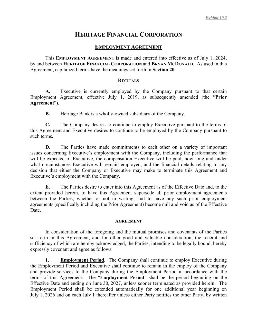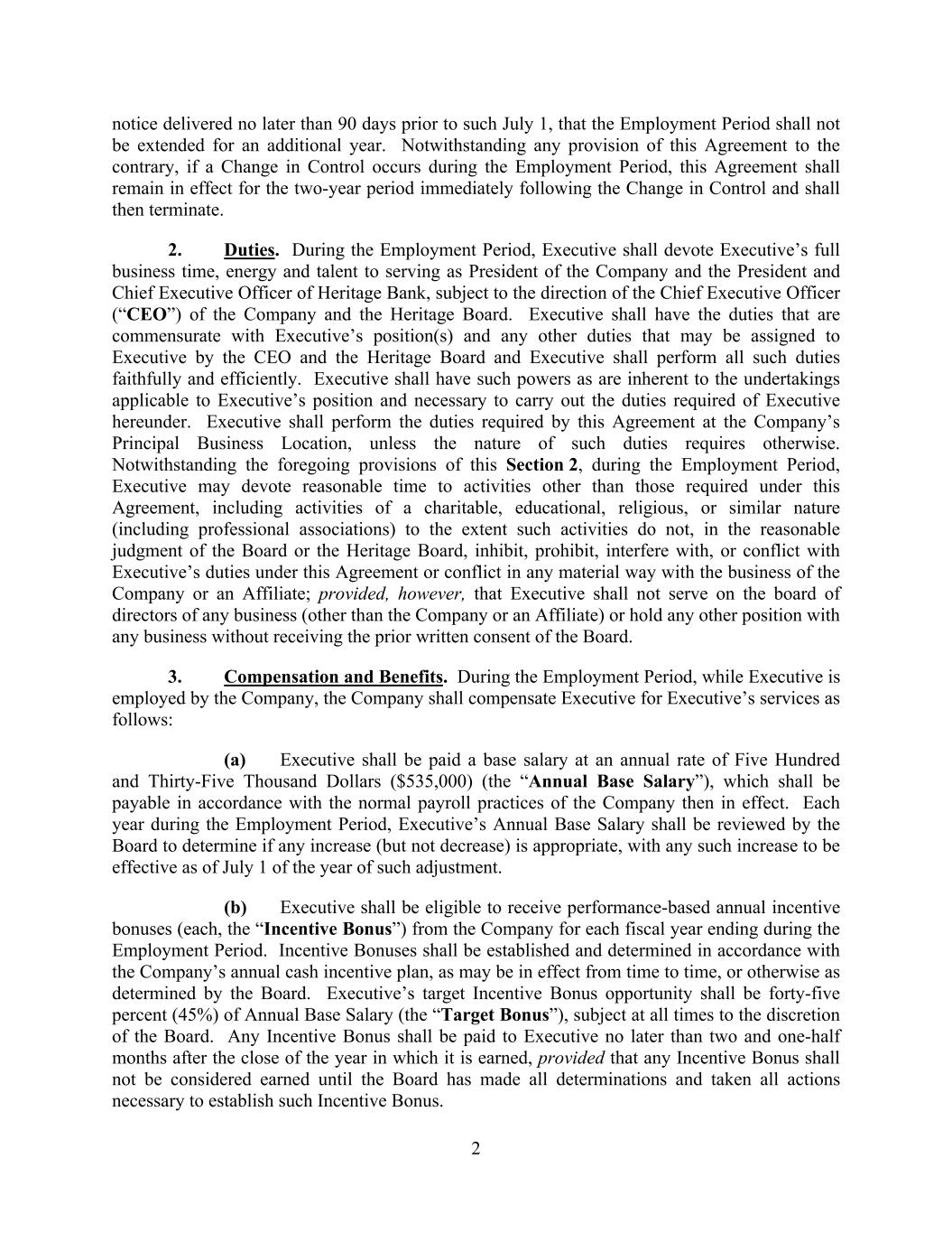 2 1. Prior Agreement. As of the Effective Date, this Agreement shall supersede and replace any and all prior agreements respecting Executive’s employment by, or service to, the Company as may from time to time have been made by and between the Parties, whether or not in writing, including but not limited to the Prior Employment Agreement; provided, however, that any vested benefits due to Executive pursuant to any pension plan, welfare benefit plan or any other employee benefit plan shall continue to be available to Executive subject to the terms and conditions of the applicable plan as may be in effect from time to time, unless otherwise specifically stated herein. 2. Principal Transition Dates and Periods. (a) “Agreement Term” means the period from the Effective Date through March 31, 2027. (b) “CEO Retirement Date” means May 6, 2025. (c) “CEO Period” means the period from the Effective Date through the CEO Retirement Date. (d) “Non-Officer Period” means the period following the CEO Retirement Date through the end of the Agreement Term. 3. CEO Period. Subject to the terms and conditions of this Agreement, the Company hereby agrees to continue to employ Executive during the CEO Period and Executive hereby agrees to continue to remain in the employ of the Company and to provide services to the Company during the CEO Period in accordance with this Agreement, unless sooner terminated as provided herein. 4. CEO Period Titles and Duties. Subject to the transitions set forth below, Executive agrees that during the CEO Period, Executive will devote his business time, energy and talent to serving at the direction of the Board and the Heritage Board, as the case may be. (a) Subject to the following subsections of this Section 4, as of the Effective Date, Executive shall voluntarily resign from the positions of President of the Company and Chief Executive Officer of Heritage Bank. (b) During the CEO Period, Executive shall continue serving as the Chief Executive Officer of the Company, subject to the direction of the Board. (c) On the CEO Retirement Date, Executive shall voluntarily resign from all officer positions with the Company, including the position of Chief Executive Officer of the Company, and any other officer positions with the Company and any Affiliate, and as a fiduciary of any employee benefit plan of the Company and any Affiliate.