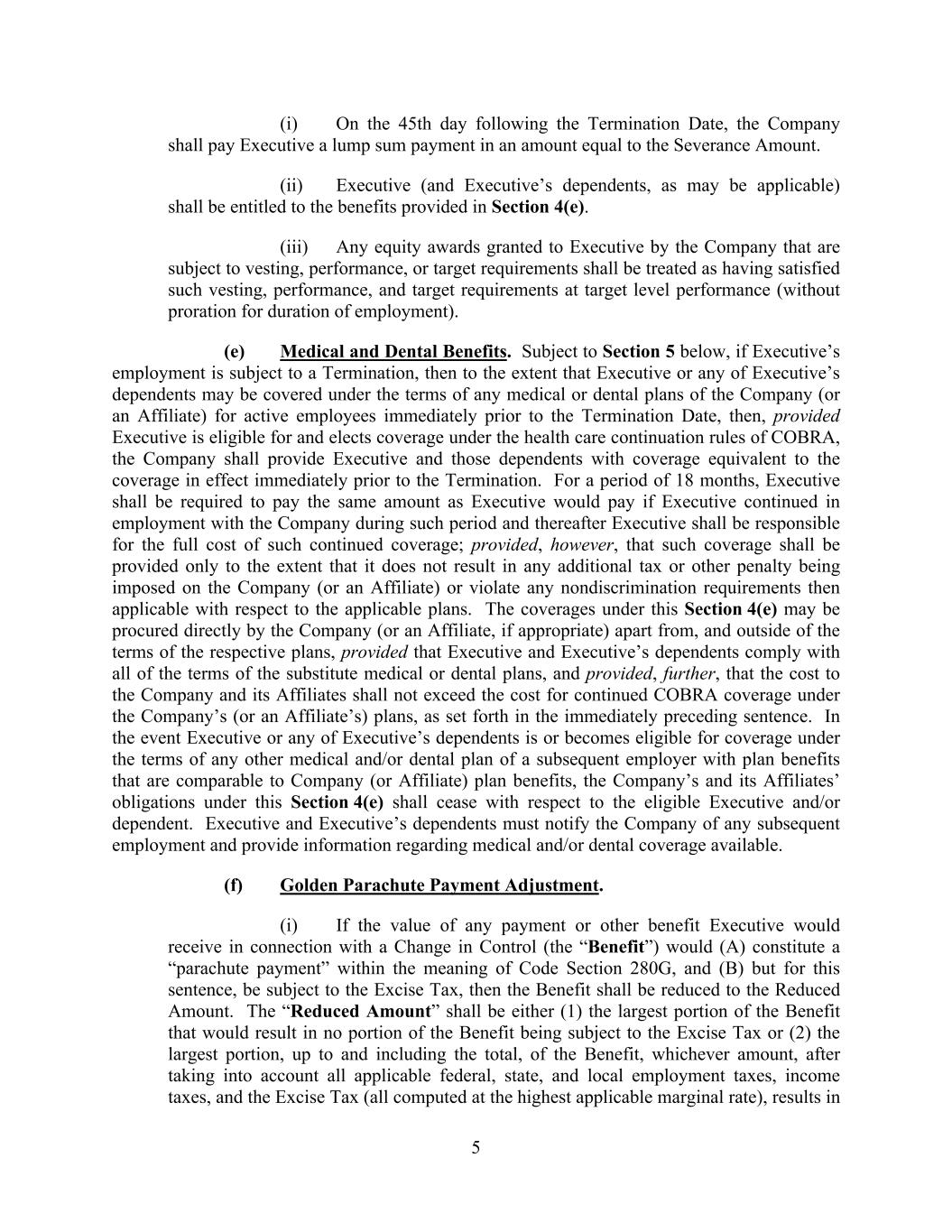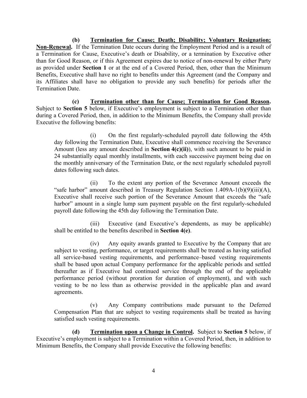 7 (i) On the first regularly-scheduled payroll date following the 45th day following the Termination Date, Executive shall commence receiving the Severance Amount (less any amount described in Section 9(c)(ii)), with such amount to be paid in substantially equal monthly installments through the end of the original Agreement Term, with each successive payment being due on the monthly anniversary of the Termination Date. (ii) To the extent any portion of the Severance Amount exceeds the “safe harbor” amount described in Treasury Regulation Section 1.409A-1(b)(9)(iii)(A), Executive shall receive such portion of the Severance Amount that exceeds the “safe harbor” amount in a single lump sum payment payable on the first regularly-scheduled payroll date following the 45th day following the Termination Date. (iii) Executive (and Executive’s dependents, as may be applicable) shall be entitled to the benefits described in Section 9(f). (iv) Any equity awards granted to Executive by the Company that are subject to vesting, performance, or target requirements shall be treated as having satisfied all service-based vesting requirements, and performance–based vesting requirements shall be based upon actual Company performance for the applicable periods and settled thereafter as if Executive had continued service through the end of the applicable performance period, with such vesting to be no less than as otherwise provided in the applicable plan and award agreements. (d) Termination upon a Change in Control. Subject to Section 10 below, if Executive’s employment is subject to a Termination within a Covered Period on or before the CEO Retirement Date, then, in addition to Minimum Benefits, the Company shall provide Executive the following benefits: (i) On the 45th day following the Termination Date, the Company shall pay Executive a lump sum payment in an amount equal to the Severance Amount. (ii) Executive (and Executive’s dependents, as may be applicable) shall be entitled to the benefits provided in Section 9(f). (iii) Any equity awards granted to Executive by the Company that are subject to vesting, performance, or target requirements shall be treated as having satisfied all service-based vesting requirements, and performance–based vesting requirements shall be based upon actual Company performance for the applicable periods and settled thereafter as if Executive had continued service through the end of the applicable performance period, with such vesting to be no less than as otherwise provided in the applicable plan and award agreements. (e) Termination During Non-Officer Period. Subject to Section 10 below, if during the Non-Officer Period, Executive’s Transition Services are terminated by the