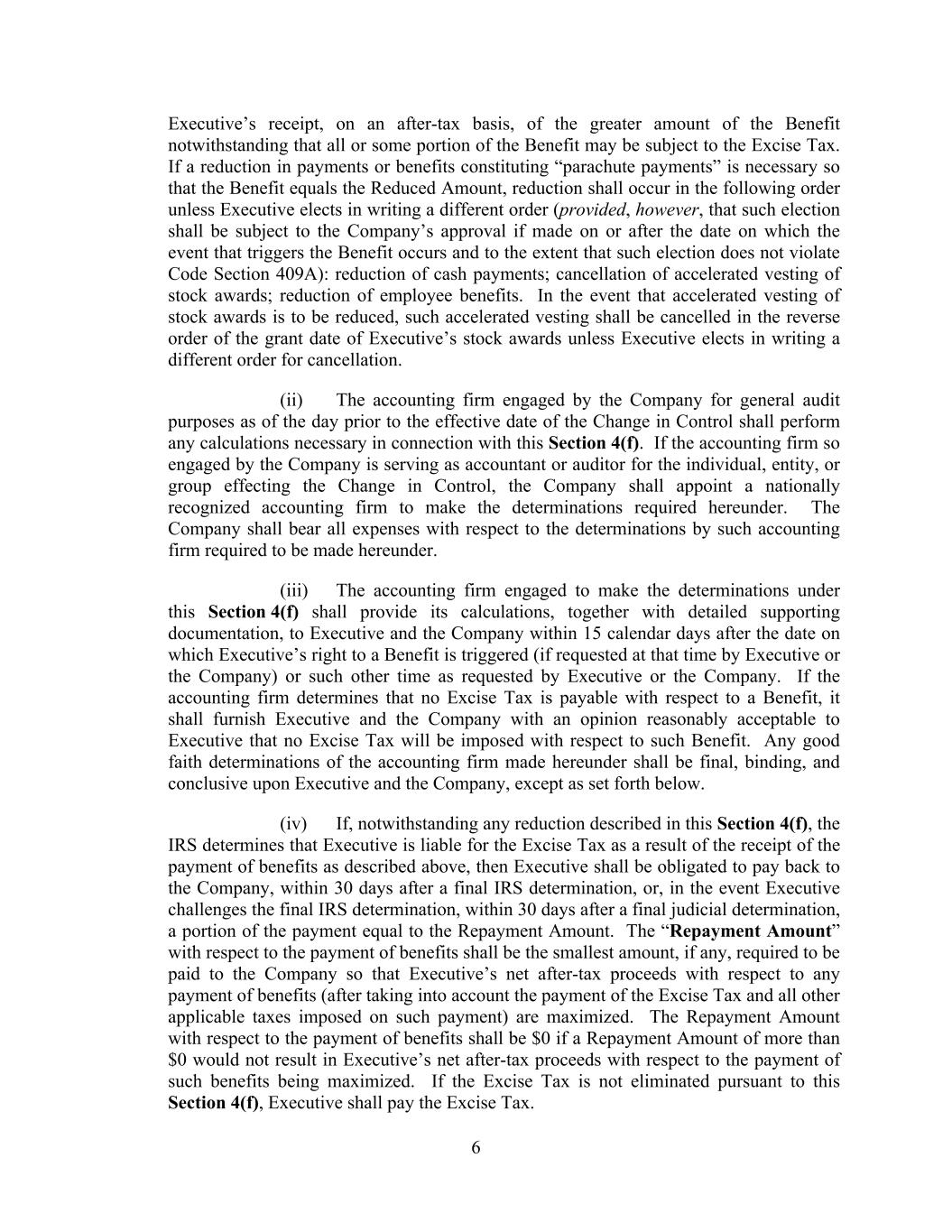 9 (g) Golden Parachute Payment Adjustment. (i) If the value of any payment or other benefit Executive would receive in connection with a Change in Control (the “Benefit”) would (A) constitute a “parachute payment” within the meaning of Code Section 280G, and (B) but for this sentence, be subject to the Excise Tax, then the Benefit shall be reduced to the Reduced Amount. The “Reduced Amount” shall be either (1) the largest portion of the Benefit that would result in no portion of the Benefit being subject to the Excise Tax or (2) the largest portion, up to and including the total, of the Benefit, whichever amount, after taking into account all applicable federal, state, and local employment taxes, income taxes, and the Excise Tax (all computed at the highest applicable marginal rate), results in Executive’s receipt, on an after-tax basis, of the greater amount of the Benefit notwithstanding that all or some portion of the Benefit may be subject to the Excise Tax. If a reduction in payments or benefits constituting “parachute payments” is necessary so that the Benefit equals the Reduced Amount, reduction shall occur in the following order unless Executive elects in writing a different order (provided, however, that such election shall be subject to the Company’s approval if made on or after the date on which the event that triggers the Benefit occurs and to the extent that such election does not violate Code Section 409A): reduction of cash payments; cancellation of accelerated vesting of stock awards; reduction of employee benefits. In the event that accelerated vesting of stock awards is to be reduced, such accelerated vesting shall be cancelled in the reverse order of the grant date of Executive’s stock awards unless Executive elects in writing a different order for cancellation. (ii) The accounting firm engaged by the Company for general audit purposes as of the day prior to the effective date of the Change in Control shall perform any calculations necessary in connection with Section 9(g)(i)(i). If the accounting firm so engaged by the Company is serving as accountant or auditor for the individual, entity, or group effecting the Change in Control, the Company shall appoint a nationally recognized accounting firm to make the determinations required hereunder. The Company shall bear all expenses with respect to the determinations by such accounting firm required to be made hereunder. (iii) The accounting firm engaged to make the determinations under t Section 9(g)(i) shall provide its calculations, together with detailed supporting documentation, to Executive and the Company within 15 calendar days after the date on which Executive’s right to a Benefit is triggered (if requested at that time by Executive or the Company) or such other time as requested by Executive or the Company. If the accounting firm determines that no Excise Tax is payable with respect to a Benefit, it shall furnish Executive and the Company with an opinion reasonably acceptable to Executive that no Excise Tax will be imposed with respect to such Benefit. Any good faith determinations of the accounting firm made hereunder shall be final, binding, and conclusive upon Executive and the Company, except as set forth below.