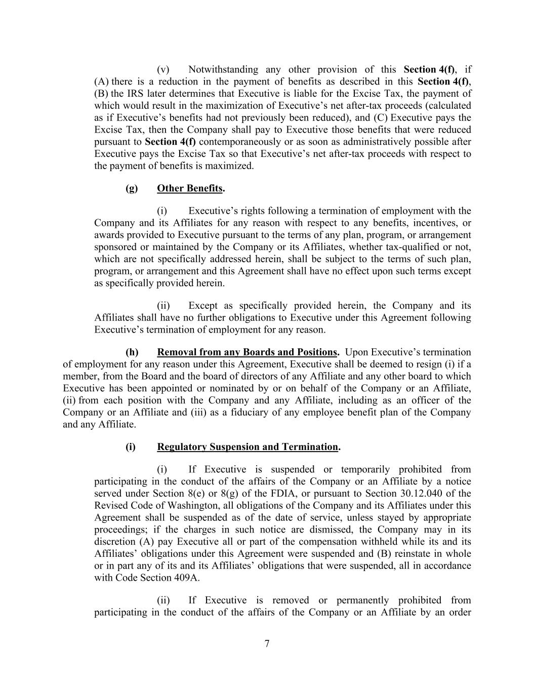 11 Company or an Affiliate and (iii) as a fiduciary of any employee benefit plan of the Company and any Affiliate. (j) Regulatory Suspension and Termination. (i) If Executive is suspended or temporarily prohibited from participating in the conduct of the affairs of the Company or an Affiliate by a notice served under Section 8(e) or 8(g) of the FDIA, or pursuant to Section 30.12.040 of the Revised Code of Washington, all obligations of the Company and its Affiliates under this Agreement shall be suspended as of the date of service, unless stayed by appropriate proceedings; if the charges in such notice are dismissed, the Company may in its discretion (A) pay Executive all or part of the compensation withheld while its and its Affiliates’ obligations under this Agreement were suspended and (B) reinstate in whole or in part any of its and its Affiliates’ obligations that were suspended, all in accordance with Code Section 409A. (ii) If Executive is removed or permanently prohibited from participating in the conduct of the affairs of the Company or an Affiliate by an order issued under Section 8(e) or 8(g) of the FDIA, or pursuant to Section 30.12.040 of the Revised Code of Washington, all obligations of the Company and its Affiliates under this Agreement shall terminate as of the effective date of the order, provided that this Section 9(j) shall not affect any vested rights of the Parties. (iii) If the Company is in default as defined in Section 3(x) of the FDIA, all obligations of the Company under this Agreement shall terminate as of the date of default, provided that this Section 9(j) shall not affect any vested rights of the Parties. (iv) All obligations of the Company under this Agreement shall be terminated, except to the extent determined by the FDIC that continuation of this Agreement is necessary for the continued operation of the institution, at the time the FDIC enters into an agreement to provide assistance to or on behalf of the Company under the authority contained in Section 13(c) of the FDIA, or when the Company is determined by the FDIC to be in an unsafe or unsound condition, provided that this Section 9(j) shall not affect any vested rights of the Parties. (v) Any payments made to Executive pursuant to this Agreement, or otherwise, are subject to and conditioned upon their compliance with Section 18(k) of the FDIA. (k) Clawback. Any payment or benefit received under this Agreement shall be subject to potential cancellation, recoupment, rescission, payback or other action in accordance with the terms of any applicable Company clawback policy, as it may be amended from time to time, or any applicable law. In addition, and notwithstanding any provision of this Agreement to the contrary, if any Severance Restrictions require the recapture or “clawback” of any Severance Amount paid to Executive under this Agreement, Executive shall repay to the