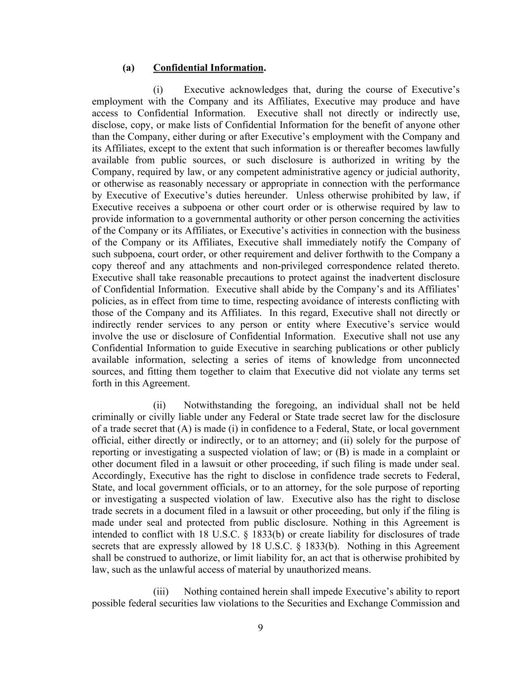 12 Company the aggregate amount of any such payments, with such repayment to occur no later than 30 days following Executive’s receipt of a written notice from the Company indicating that payments received by Executive under this Agreement are subject to recapture or clawback pursuant to the Severance Restrictions. 10. Release. Notwithstanding any provision of this Agreement to the contrary, no benefits owed to Executive under Section 9(c), 9(d), 9(e), or 9(f) (other than the Minimum Benefits) shall be provided to Executive unless Executive executes (without subsequent revocation) and delivers to the Company a Release within 21 days (or such longer period to the extent required by applicable law) following the Termination Date. 11. Restrictive Covenants. Executive acknowledges that Executive has been and will continue to be provided intimate knowledge of the business practices, trade secrets, and other confidential and proprietary information of the Company and its Affiliates (including the Confidential Information), which, if exploited by Executive, would seriously, adversely, and irreparably affect the interests of the Company and its Affiliates and the ability of each to continue its business. (a) Confidential Information. (i) Executive acknowledges that, during the course of Executive’s employment with the Company and its Affiliates, Executive may produce and have access to Confidential Information. Executive shall not directly or indirectly use, disclose, copy, or make lists of Confidential Information for the benefit of anyone other than the Company, either during or after Executive’s employment with the Company and its Affiliates, except to the extent that such information is or thereafter becomes lawfully available from public sources, or such disclosure is authorized in writing by the Company, required by law or any competent administrative agency or judicial authority, or otherwise as reasonably necessary or appropriate in connection with the performance by Executive of Executive’s duties hereunder. Unless otherwise prohibited by law, if Executive receives a subpoena or other court order or is otherwise required by law to provide information to a governmental authority or other person concerning the activities of the Company or its Affiliates, or Executive’s activities in connection with the business of the Company or its Affiliates, Executive shall immediately notify the Company of such subpoena, court order, or other requirement and deliver forthwith to the Company a copy thereof and any attachments and non-privileged correspondence related thereto. Executive shall take reasonable precautions to protect against the inadvertent disclosure of Confidential Information. Executive shall abide by the Company’s and its Affiliates’ policies, as in effect from time to time, respecting avoidance of interests conflicting with those of the Company and its Affiliates. In this regard, Executive shall not directly or indirectly render services to any person or entity where Executive’s service would involve the use or disclosure of Confidential Information. Executive shall not use any Confidential Information to guide Executive in searching publications or other publicly available information, selecting a series of items of knowledge from unconnected