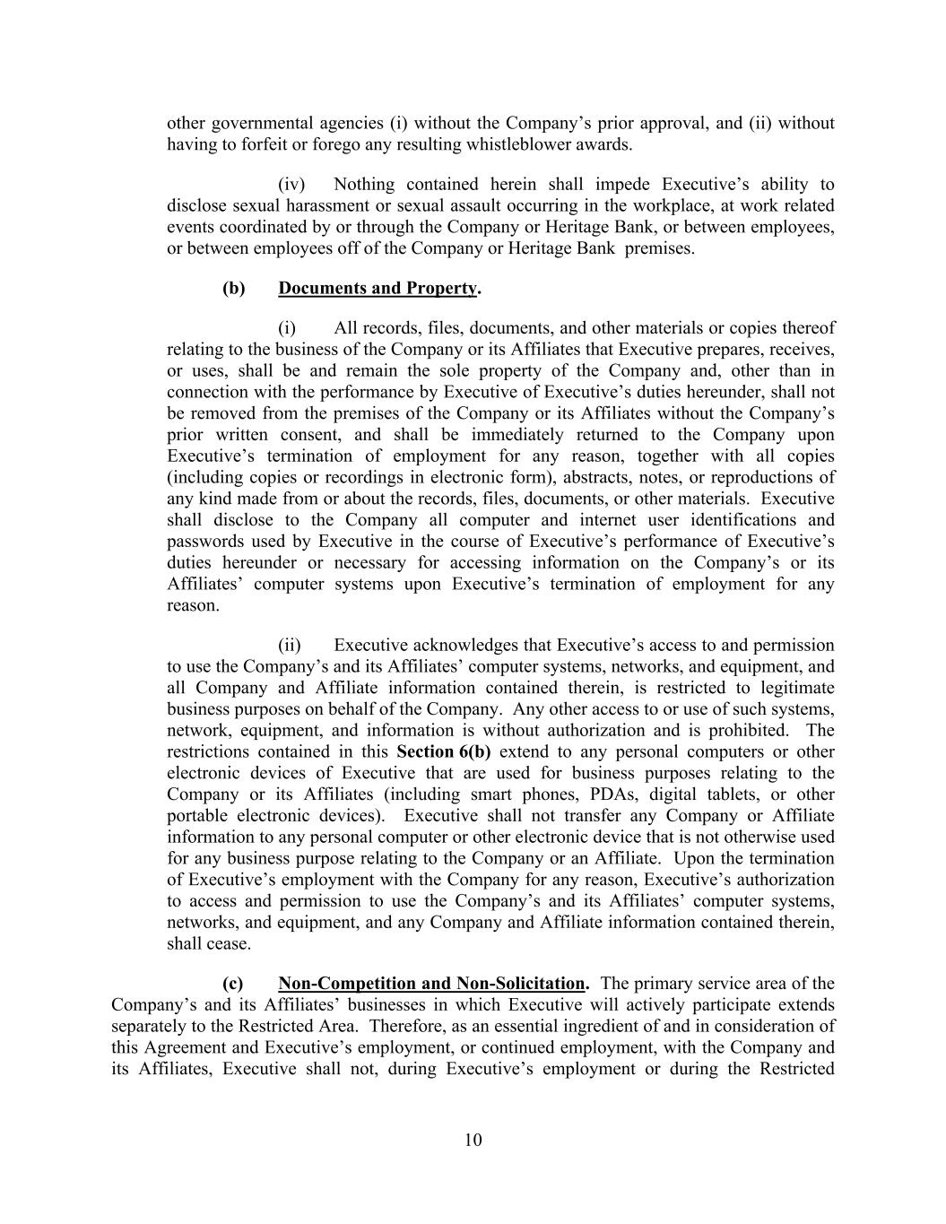 13 sources, and fitting them together to claim that Executive did not violate any terms set forth in this Agreement. (ii) Notwithstanding the foregoing, an individual shall not be held criminally or civilly liable under any Federal or State trade secret law for the disclosure of a trade secret that (A) is made (i) in confidence to a Federal, State, or local government official, either directly or indirectly, or to an attorney; and (ii) solely for the purpose of reporting or investigating a suspected violation of law; or (B) is made in a complaint or other document filed in a lawsuit or other proceeding, if such filing is made under seal. Accordingly, Executive has the right to disclose in confidence trade secrets to Federal, State, and local government officials, or to an attorney, for the sole purpose of reporting or investigating a suspected violation of law. Executive also has the right to disclose trade secrets in a document filed in a lawsuit or other proceeding, but only if the filing is made under seal and protected from public disclosure. Nothing in this Agreement is intended to conflict with 18 U.S.C. § 1833(b) or create liability for disclosures of trade secrets that are expressly allowed by 18 U.S.C. § 1833(b). Nothing in this Agreement shall be construed to authorize, or limit liability for, an act that is otherwise prohibited by law, such as the unlawful access of material by unauthorized means. (iii) Nothing contained herein shall impede Executive’s ability to report possible federal securities law violations to the Securities and Exchange Commission and other governmental agencies (i) without the Company’s prior approval, and (ii) without having to forfeit or forego any resulting whistleblower awards. (iv) Nothing contained herein shall impede Executive’s ability to disclose sexual harassment or sexual assault occurring in the workplace, at work related events coordinated by or through the Company or Heritage Bank, or between employees, or between employees off of the Company or Heritage Bank premises. (b) Documents and Property. (i) All records, files, documents, and other materials or copies thereof relating to the business of the Company or its Affiliates that Executive prepares, receives, or uses, shall be and remain the sole property of the Company and, other than in connection with the performance by Executive of Executive’s duties hereunder, shall not be removed from the premises of the Company or its Affiliates without the Company’s prior written consent, and shall be immediately returned to the Company upon Executive’s termination of employment for any reason, together with all copies (including copies or recordings in electronic form), abstracts, notes, or reproductions of any kind made from or about the records, files, documents, or other materials. Executive shall disclose to the Company all computer and internet user identifications and passwords used by Executive in the course of Executive’s performance of Executive’s duties hereunder or necessary for accessing information on the Company’s or its Affiliates’ computer systems upon Executive’s termination of employment for any reason.