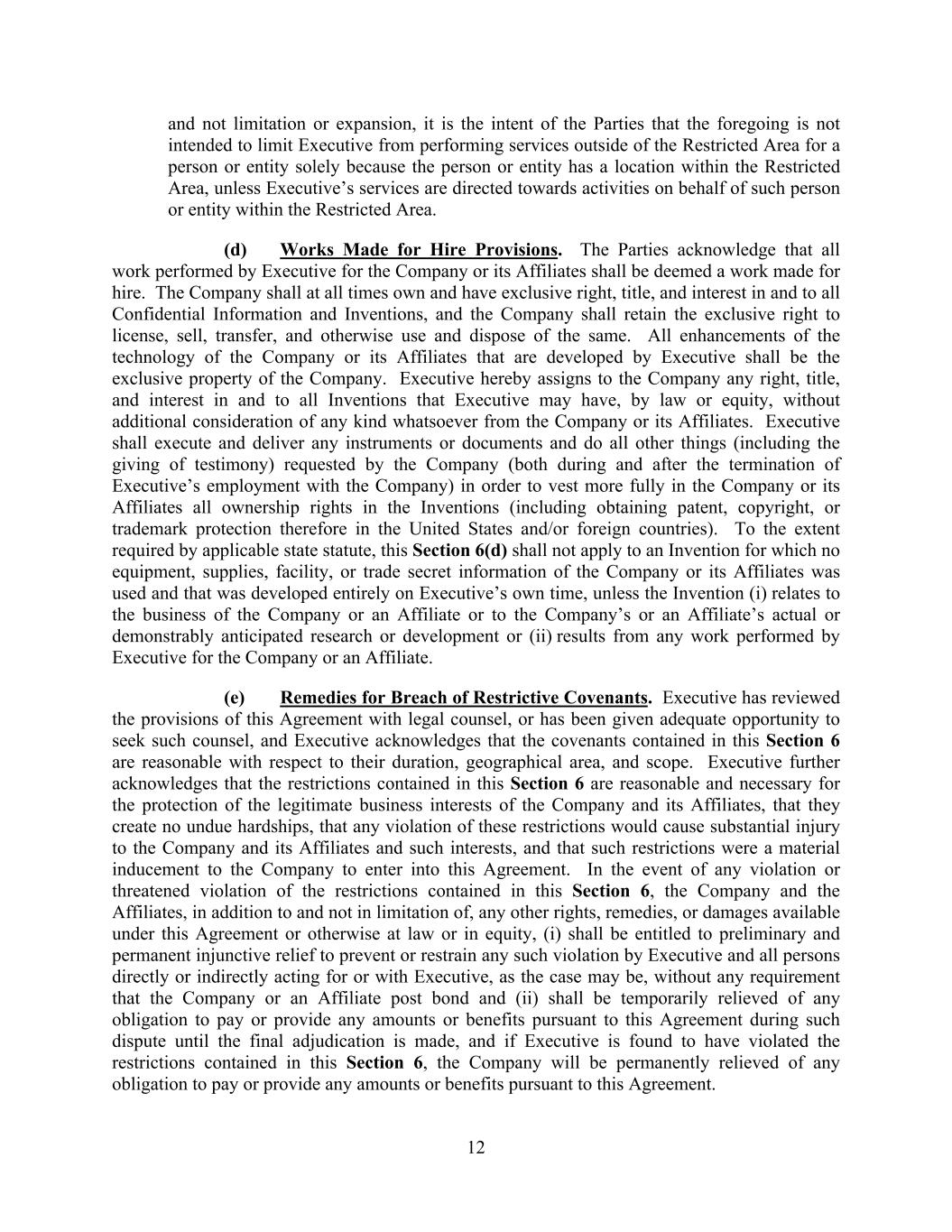 16 Executive’s employment with the Company) in order to vest more fully in the Company or its Affiliates all ownership rights in the Inventions (including obtaining patent, copyright, or trademark protection therefore in the United States and/or foreign countries). To the extent required by applicable state statute, this Section 11(d) shall not apply to an Invention for which no equipment, supplies, facility, or trade secret information of the Company or its Affiliates was used and that was developed entirely on Executive’s own time, unless the Invention (i) relates to the business of the Company or an Affiliate or to the Company’s or an Affiliate’s actual or demonstrably anticipated research or development or (ii) results from any work performed by Executive for the Company or an Affiliate. (e) Remedies for Breach of Restrictive Covenants. Executive has reviewed the provisions of this Agreement with legal counsel, or has been given adequate opportunity to seek such counsel, and Executive acknowledges that the covenants contained in this Section 11 are reasonable with respect to their duration, geographical area, and scope. Executive further acknowledges that the restrictions contained in this Section 11 are reasonable and necessary for the protection of the legitimate business interests of the Company and its Affiliates, that they create no undue hardships, that any violation of these restrictions would cause substantial injury to the Company and its Affiliates and such interests, and that such restrictions were a material inducement to the Company to enter into this Agreement. In the event of any violation or threatened violation of the restrictions contained in this Section 11, the Company and the Affiliates, in addition to and not in limitation of, any other rights, remedies, or damages available under this Agreement or otherwise at law or in equity, (i) shall be entitled to preliminary and permanent injunctive relief to prevent or restrain any such violation by Executive and all persons directly or indirectly acting for or with Executive, as the case may be, without any requirement that the Company or an Affiliate post bond and (ii) shall be relieved of any obligation to pay or provide any amounts or benefits pursuant to this Agreement. If Executive violates the Restrictive Covenant and the Company brings legal action for injunctive or other relief, the Company shall not, as a result of the time involved in obtaining such relief, be deprived of the benefit of the full period of the Restrictive Covenant; accordingly, the Restrictive Covenant shall be deemed to have the duration specified herein computed from the date the relief is granted but reduced by the time between the period when the Restricted Period began to run and the date of the first violation of the Restrictive Covenant by Executive. (f) Other Agreements. In the event of the existence of another agreement between the Parties that (i) is in effect during the Restricted Period, and (ii) contains restrictive covenants that conflict with any of the provisions of Section 11, then the more restrictive of such provisions from the two agreements shall control for the period during which both agreements would otherwise be in effect. 12. No Set-Off; No Mitigation. Except as provided herein, the Company’s obligation to provide benefits under this Agreement and otherwise to perform its obligations hereunder shall not be affected by any circumstances, including any set-off, counterclaim, recoupment, defense, or other right the Company may have against Executive or others. In no event shall Executive be obligated to seek other employment or take any other action by way of