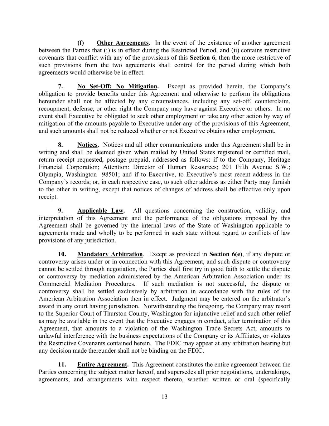 17 mitigation of the amounts payable to Executive under any of the provisions of this Agreement, and such amounts shall not be reduced whether or not Executive obtains other employment. 13. Notices. Notices and all other communications under this Agreement shall be in writing and shall be deemed given when mailed by United States registered or certified mail, return receipt requested, postage prepaid, addressed as follows: if to the Company, Heritage Financial Corporation; Attention: Director of Human Resources; 201 Fifth Avenue S.W.; Olympia, Washington 98501; and if to Executive, to Executive’s most recent address in the Company’s records; or, in each respective case, to such other address as either Party may furnish to the other in writing, except that notices of changes of address shall be effective only upon receipt. 14. Applicable Law. All questions concerning the construction, validity, and interpretation of this Agreement and the performance of the obligations imposed by this Agreement shall be governed by the internal laws of the State of Washington applicable to agreements made and wholly to be performed in such state without regard to conflicts of law provisions of any jurisdiction. 15. Mandatory Arbitration. Except as provided in Section 11(e), if any dispute or controversy arises under or in connection with this Agreement, and such dispute or controversy cannot be settled through negotiation, the Parties shall first try in good faith to settle the dispute or controversy by mediation administered by the American Arbitration Association under its Commercial Mediation Procedures. If such mediation is not successful, the dispute or controversy shall be settled exclusively by arbitration in accordance with the rules of the American Arbitration Association then in effect. Judgment may be entered on the arbitrator’s award in any court having jurisdiction. Notwithstanding the foregoing, the Company may resort to the Superior Court of Thurston County, Washington for injunctive and such other relief as may be available in the event that Executive engages in conduct, after termination of this Agreement, that amounts to a violation of the Washington Trade Secrets Act or amounts to unlawful interference with the business expectations of the Company or its Affiliates, or violates the Restrictive Covenants contained herein. The FDIC may appear at any arbitration hearing but any decision made thereunder shall not be binding on the FDIC. 16. Entire Agreement. This Agreement constitutes the entire agreement between the Parties concerning the subject matter hereof, and supersedes all prior negotiations, undertakings, agreements, and arrangements with respect thereto, whether written or oral. If a court of competent jurisdiction determines that any provision of this Agreement is invalid or unenforceable, then the invalidity or unenforceability of that provision shall not affect the validity or enforceability of any other provision of this Agreement and all other provisions shall remain in full force and effect. The various covenants and provisions of this Agreement are intended to be severable and to constitute independent and distinct binding obligations. Without limiting the generality of the foregoing, if the scope of any covenant contained in this Agreement is too broad to permit enforcement to its full extent, such covenant shall be enforced to the
