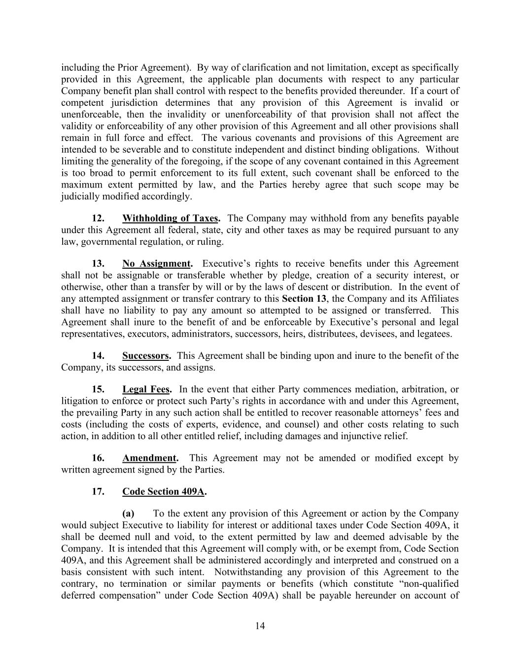 18 maximum extent permitted by law, and the Parties hereby agree that such scope may be judicially modified accordingly. 17. Withholding of Taxes. The Company may withhold from any benefits payable under this Agreement all federal, state, city and other taxes as may be required pursuant to any law, governmental regulation, or ruling. 18. No Assignment. Executive’s rights to receive benefits under this Agreement shall not be assignable or transferable whether by pledge, creation of a security interest, or otherwise, other than a transfer by will or by the laws of descent or distribution. In the event of any attempted assignment or transfer contrary to this Section 18, the Company and its Affiliates shall have no liability to pay any amount so attempted to be assigned or transferred. This Agreement shall inure to the benefit of and be enforceable by Executive’s personal and legal representatives, executors, administrators, successors, heirs, distributees, devisees, and legatees. 19. Successors. This Agreement shall be binding upon and inure to the benefit of the Company, its successors, and assigns. 20. Legal Fees. In the event that either Party commences mediation, arbitration, or litigation to enforce or protect such Party’s rights in accordance with and under this Agreement, the prevailing Party in any such action shall be entitled to recover reasonable attorneys’ fees and costs (including the costs of experts, evidence, and counsel) and other costs relating to such action, in addition to all other entitled relief, including damages and injunctive relief. 21. Amendment. This Agreement may not be amended or modified except by written agreement signed by the Parties. 22. Code Section 409A. (a) To the extent any provision of this Agreement or action by the Company would subject Executive to liability for interest or additional taxes under Code Section 409A, it shall be deemed null and void, to the extent permitted by law and deemed advisable by the Company. It is intended that this Agreement will comply with Code Section 409A, and this Agreement shall be administered accordingly and interpreted and construed on a basis consistent with such intent. Notwithstanding any provision of this Agreement to the contrary, no termination or similar payments or benefits shall be payable hereunder on account of Executive’s termination of employment unless such termination constitutes a “separation from service” within the meaning of Code Section 409A. For purposes of Code Section 409A, all installment payments of deferred compensation made hereunder, or pursuant to another plan or arrangement, shall be deemed to be separate payments. To the extent any reimbursements or in-kind benefit payments under this Agreement are subject to Code Section 409A, such reimbursements and in- kind benefit payments shall be made in accordance with Treasury Regulation Section 1.409A- 3(i)(1)(iv). This Agreement may be amended to the extent necessary (including retroactively) by the Company to avoid the application of taxes or interest under Code Section 409A, while maintaining to the maximum extent practicable the original intent of this Agreement. This