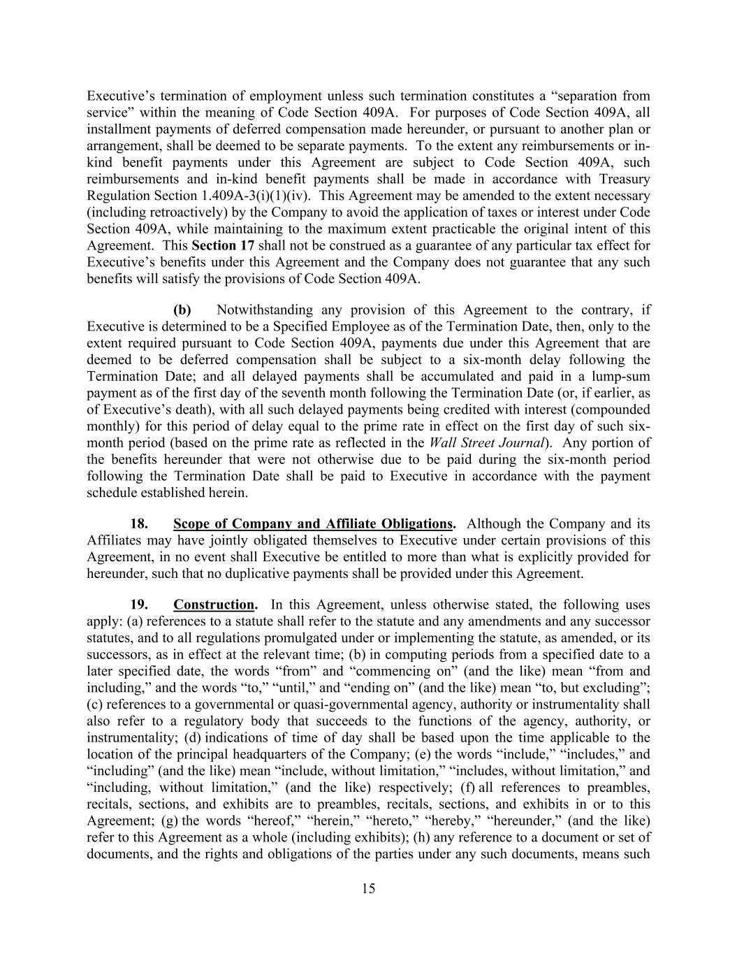 19 Section 22 shall not be construed as a guarantee of any particular tax effect for Executive’s benefits under this Agreement and the Company does not guarantee that any such benefits will satisfy the provisions of Code Section 409A. (b) Notwithstanding any provision of this Agreement to the contrary, if Executive is determined to be a Specified Employee as of the Termination Date, then, to the extent required pursuant to Code Section 409A, payments due under this Agreement that are deemed to be deferred compensation shall be subject to a six-month delay following the Termination Date; and all delayed payments shall be accumulated and paid in a lump-sum payment as of the first day of the seventh month following the Termination Date (or, if earlier, as of Executive’s death), with all such delayed payments being credited with interest (compounded monthly) for this period of delay equal to the prime rate in effect on the first day of such six- month period (based on the prime rate as reflected in the Wall Street Journal). Any portion of the benefits hereunder that were not otherwise due to be paid during the six-month period following the Termination Date shall be paid to Executive in accordance with the payment schedule established herein. 23. Scope of Company and Affiliate Obligations. Although the Company and its Affiliates may have jointly obligated themselves to Executive under certain provisions of this Agreement, in no event shall Executive be entitled to more than what is explicitly provided for hereunder, such that no duplicative payments shall be provided under this Agreement. 24. Construction. In this Agreement, unless otherwise stated, the following uses apply: (a) references to a statute shall refer to the statute and any amendments and any successor statutes, and to all regulations promulgated under or implementing the statute, as amended, or its successors, as in effect at the relevant time; (b) in computing periods from a specified date to a later specified date, the words “from” and “commencing on” (and the like) mean “from and including,” and the words “to,” “until,” and “ending on” (and the like) mean “to, but excluding”; (c) references to a governmental or quasi-governmental agency, authority or instrumentality shall also refer to a regulatory body that succeeds to the functions of the agency, authority, or instrumentality; (d) indications of time of day shall be based upon the time applicable to the location of the principal headquarters of the Company; (e) the words “include,” “includes,” and “including” (and the like) mean “include, without limitation,” “includes, without limitation,” and “including, without limitation,” (and the like) respectively; (f) all references to preambles, recitals, sections, and exhibits are to preambles, recitals, sections, and exhibits in or to this Agreement; (g) the words “hereof,” “herein,” “hereto,” “hereby,” “hereunder,” (and the like) refer to this Agreement as a whole (including exhibits); (h) any reference to a document or set of documents, and the rights and obligations of the parties under any such documents, means such document or documents as amended from time to time, and all modifications, extensions, renewals, substitutions, or replacements thereof; (i) all words used shall be construed to be of such gender or number as the circumstances and context require; (j) the captions and headings of preambles, recitals, sections, and exhibits appearing in or attached to this Agreement have been inserted solely for convenience of reference and shall not be considered a part of this Agreement, nor shall any of them affect the meaning or interpretation of this Agreement or any of its