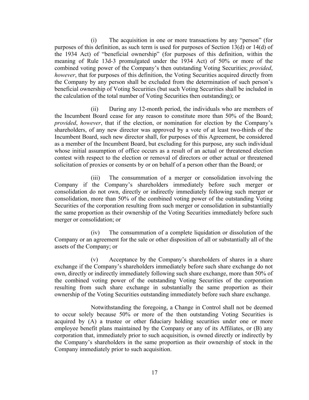 21 the Company by any person shall be excluded from the determination of such person’s beneficial ownership of Voting Securities (but such Voting Securities shall be included in the calculation of the total number of Voting Securities then outstanding); or (ii) During any 12-month period, the individuals who are members of the Incumbent Board cease for any reason to constitute more than 50% of the Board; provided, however, that if the election, or nomination for election by the Company’s shareholders, of any new director was approved by a vote of at least two-thirds of the Incumbent Board, such new director shall, for purposes of this Agreement, be considered as a member of the Incumbent Board, but excluding for this purpose, any such individual whose initial assumption of office occurs as a result of an actual or threatened election contest with respect to the election or removal of directors or other actual or threatened solicitation of proxies or consents by or on behalf of a person other than the Board; or (iii) The consummation of a merger or consolidation involving the Company if the Company’s shareholders immediately before such merger or consolidation do not own, directly or indirectly immediately following such merger or consolidation, more than 50% of the combined voting power of the outstanding Voting Securities of the corporation resulting from such merger or consolidation in substantially the same proportion as their ownership of the Voting Securities immediately before such merger or consolidation; or (iv) The consummation of a complete liquidation or dissolution of the Company or an agreement for the sale or other disposition of all or substantially all of the assets of the Company; or (v) Acceptance by the Company’s shareholders of shares in a share exchange if the Company’s shareholders immediately before such share exchange do not own, directly or indirectly immediately following such share exchange, more than 50% of the combined voting power of the outstanding Voting Securities of the corporation resulting from such share exchange in substantially the same proportion as their ownership of the Voting Securities outstanding immediately before such share exchange. Notwithstanding the foregoing, a Change in Control shall not be deemed to occur solely because 50% or more of the then outstanding Voting Securities is acquired by (A) a trustee or other fiduciary holding securities under one or more employee benefit plans maintained by the Company or any of its Affiliates, or (B) any corporation that, immediately prior to such acquisition, is owned directly or indirectly by the Company’s shareholders in the same proportion as their ownership of stock in the Company immediately prior to such acquisition. Moreover, notwithstanding the foregoing, a Change in Control shall not be deemed to occur solely because any person (the “Subject Person”) acquires beneficial ownership of more than the permitted amount of the outstanding Voting Securities as a result of the acquisition of Voting Securities by the Company that, by reducing the